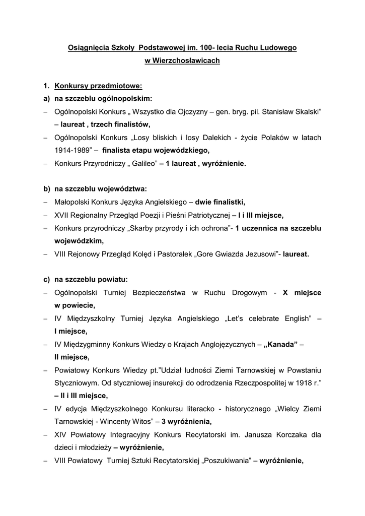 Osiągnięcia Szkoły Podstawowej im. 100- lecia Ruchu Ludowego w Wierzchosławicach 1. Konkursy przedmiotowe: a) na szczeblu ogólnopolskim:  Ogólnopolski Konkurs „ Wszystko dla Ojczyzny – gen. bryg. pil. Stanisław Skalski” – laureat , trzech finalistów,  Ogólnopolski Konkurs „Losy bliskich i losy Dalekich - życie Polaków w latach 1914-1989” – finalista etapu wojewódzkiego,  Konkurs Przyrodniczy „ Galileo” – 1 laureat , wyróżnienie. b) na szczeblu województwa:  Małopolski Konkurs Języka Angielskiego – dwie finalistki,  XVII Regionalny Przegląd Poezji i Pieśni Patriotycznej – I i III miejsce,  Konkurs przyrodniczy „Skarby przyrody i ich ochrona”- 1 uczennica na szczeblu wojewódzkim,  VIII Rejonowy Przegląd Kolęd i Pastorałek „Gore Gwiazda Jezusowi”- laureat. c) na szczeblu powiatu:  Ogólnopolski Turniej Bezpieczeństwa w Ruchu Drogowym - X miejsce w powiecie,  IV Międzyszkolny Turniej Języka Angielskiego „Let’s celebrate English” – I miejsce,  IV Międzygminny Konkurs Wiedzy o Krajach Anglojęzycznych – „Kanada” – II miejsce,  Powiatowy Konkurs Wiedzy pt.”Udział ludności Ziemi Tarnowskiej w Powstaniu Styczniowym. Od styczniowej insurekcji do odrodzenia Rzeczpospolitej w 1918 r.” – II i III miejsce,  IV edycja Międzyszkolnego Konkursu literacko - historycznego „Wielcy Ziemi Tarnowskiej - Wincenty Witos” – 3 wyróżnienia,  XIV Powiatowy Integracyjny Konkurs Recytatorski im. Janusza Korczaka dla dzieci i młodzieży – wyróżnienie,  VIII Powiatowy Turniej Sztuki Recytatorskiej „Poszukiwania” – wyróżnienie,  IV Powiatowy Konkurs Poetycki „Barwy Ojczyste”- wyróżnienie, d) na szczeblu gminnym:  Gminny Konkurs Plastyczny” Kartka Świąteczna - Boże Narodzenie 2015”- I, II, III miejsce,  Gminny Konkurs Plastyczny „Kartka Wielkanocna” – II miejsce,  Gminny Konkurs Plastyczny „Jak bóbr nad stawem zamieszkał” – wyróżnienia,  I Parafialny Konkurs Poezji Religijnej - wyróżnienie,  Konkurs plastyczny „Kiedy dzwonię po Straż Pożarną” – laureaci,  Konkurs czytelniczy pod hasłem „Aktywny czytelnik” – laureaci,  I Gminny Konkurs „Mistrz Pięknego Czytania” – I i II miejsce,  VI Gminny Konkurs Matematyczny – I i II miejsce,  V Gminny Konkurs Języka Angielskiego – I miejsce,  IV Gminny Konkurs Recytatorski „Piękno Wszechświata i Człowieka malowane słowem” – I, II miejsce, wyróżnienie,  III Konkurs Papieski „Przedzieraj się, szukaj, nie ustępuj” – III miejsce,  III Gminny Konkurs Ortograficzny – I miejsce,  Gminny Konkurs Plastyczny ”A jeśli komu droga otwarta do nieba, tym, co służą Ojczyźnie”- I miejsce i wyróżnienie,  Małopolski Konkurs Humanistyczny - kwalifikacja do etapu rejonowego,  Konkurs informatyczny „ Małopolskie Baltie 2016”- 1 uczeń w rejonie. 2. Zawody sportowe: a) na szczeblu ogólnopolskim: b) na szczeblu województwa: c) na szczeblu powiatu:  Halowa Piłka Nożna – VII miejsce, d) na szczeblu gminnym: - Piłka nożna halowa chłopców - I miejsce, - Czwórbój lekkoatletyczny dziewcząt - III miejsce, - Trójbój lekkoatletyczny dziewcząt - III miejsce, - Zawody pływackie I runda – I miejsce, - Zawody pływackie II runda – I miejsce, - Koszykówka chłopców – II miejsce, - Koszykówka dziewcząt – I miejsce, - Siatkówka dziewcząt – I miejsce, - Sztafetowe biegi przełajowe dziewcząt – II miejsce, - Sztafetowe biegi przełajowe chłopców – III miejsce. 3. Udział w akcjach, projektach, programach: a) na szczeblu ogólnopolskim: AKCJE - „Śniadanie daje moc”, - „Mleko w szkole”, - „Owoce w szkole”, - „Dzień bezpiecznego Internetu”, - „Choinka nadziei” – odwiedziny w DPS, - „Pomocna dłoń” – odwiedziny w Domu Dziecka, - „Ratujemy - uczymy ratować” - pokaz ratownictwa na Dworcu PKP w Tarnowie, - „Bijemy rekord w resuscytacji krążeniowo – oddechowej”, PROGRAMY - „Chrońmy dziecięce uśmiechy”, - „Książki naszych marzeń”, - „Nie pal przy mnie proszę” - „Chronimy dzieci”– certyfikat „Bezpieczna i Przyjazna Szkoła” - Szkoła Promująca Zdrowie. PROJEKTY - „Lepsza Szkoła”- projekt matematyczny dla klas IV-VI, - „Kibicujemy Fair play” - udział w meczu piłki nożnej Wisła Kraków kontra Termalica Bruk Bet Nieciecza Stadion Wisła, - „Bezpieczna i przyjazna szkoła”, - „Odpakowani”- projekt ekologiczny, b) na szczeblu województwa: AKCJE PROJEKTY „Europejski Kodeks Walki z Rakiem” PROGRAMY c) na szczeblu powiatu: AKCJE „I ty możesz zostać Świętym Mikołajem”. PROJEKTY „Adam Boryczka - żołnierz wyklęty, ale niezapomniany”. PROGRAMY d) na szczeblu gminnym: e) na szczeblu szkolnym: AKCJE - „Dzień Pluszowego misia” – akcja czytelnicza, - „Wieczory z książką”, - „ Uwolnij książkę”. PROJEKTY: - „Co robić, aby czytać zechciał Jaś” - całoroczny projekt czytelniczy propagujący czytanie.