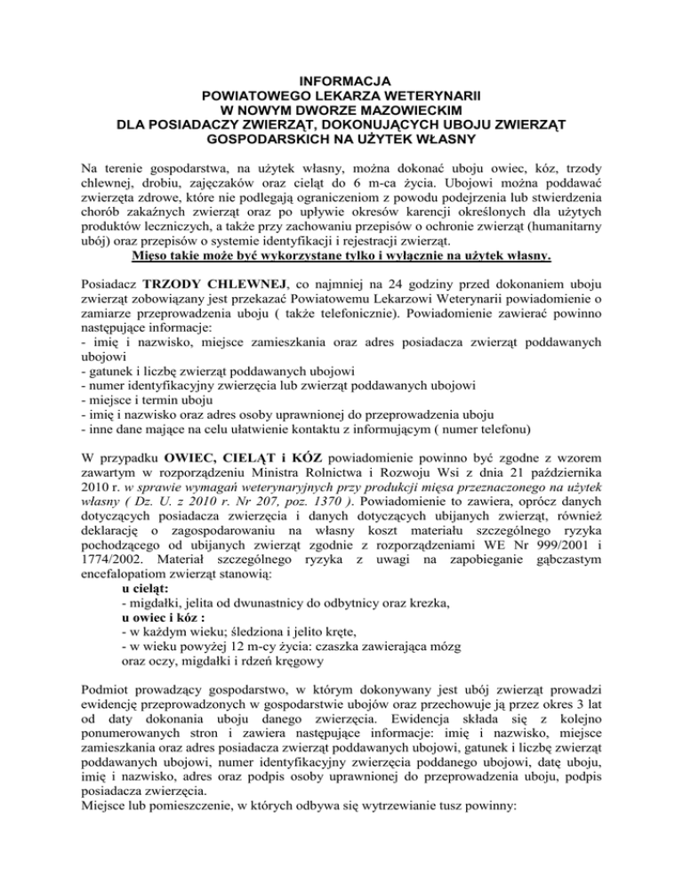 INFORMACJA POWIATOWEGO LEKARZA WETERYNARII W NOWYM DWORZE MAZOWIECKIM DLA POSIADACZY ZWIERZĄT, DOKONUJĄCYCH UBOJU ZWIERZĄT GOSPODARSKICH NA UŻYTEK WŁASNY Na terenie gospodarstwa, na użytek własny, można dokonać uboju owiec, kóz, trzody chlewnej, drobiu, zajęczaków oraz cieląt do 6 m-ca życia. Ubojowi można poddawać zwierzęta zdrowe, które nie podlegają ograniczeniom z powodu podejrzenia lub stwierdzenia chorób zakaźnych zwierząt oraz po upływie okresów karencji określonych dla użytych produktów leczniczych, a także przy zachowaniu przepisów o ochronie zwierząt (humanitarny ubój) oraz przepisów o systemie identyfikacji i rejestracji zwierząt. Mięso takie może być wykorzystane tylko i wyłącznie na użytek własny. Posiadacz TRZODY CHLEWNEJ, co najmniej na 24 godziny przed dokonaniem uboju zwierząt zobowiązany jest przekazać Powiatowemu Lekarzowi Weterynarii powiadomienie o zamiarze przeprowadzenia uboju ( także telefonicznie). Powiadomienie zawierać powinno następujące informacje: - imię i nazwisko, miejsce zamieszkania oraz adres posiadacza zwierząt poddawanych ubojowi - gatunek i liczbę zwierząt poddawanych ubojowi - numer identyfikacyjny zwierzęcia lub zwierząt poddawanych ubojowi - miejsce i termin uboju - imię i nazwisko oraz adres osoby uprawnionej do przeprowadzenia uboju - inne dane mające na celu ułatwienie kontaktu z informującym ( numer telefonu) W przypadku OWIEC, CIELĄT i KÓZ powiadomienie powinno być zgodne z wzorem zawartym w rozporządzeniu Ministra Rolnictwa i Rozwoju Wsi z dnia 21 października 2010 r. w sprawie wymagań weterynaryjnych przy produkcji mięsa przeznaczonego na użytek własny ( Dz. U. z 2010 r. Nr 207, poz. 1370 ). Powiadomienie to zawiera, oprócz danych dotyczących posiadacza zwierzęcia i danych dotyczących ubijanych zwierząt, również deklarację o zagospodarowaniu na własny koszt materiału szczególnego ryzyka pochodzącego od ubijanych zwierząt zgodnie z rozporządzeniami WE Nr 999/2001 i 1774/2002. Materiał szczególnego ryzyka z uwagi na zapobieganie gąbczastym encefalopatiom zwierząt stanowią: u cieląt: - migdałki, jelita od dwunastnicy do odbytnicy oraz krezka, u owiec i kóz : - w każdym wieku; śledziona i jelito kręte, - w wieku powyżej 12 m-cy życia: czaszka zawierająca mózg oraz oczy, migdałki i rdzeń kręgowy Podmiot prowadzący gospodarstwo, w którym dokonywany jest ubój zwierząt prowadzi ewidencję przeprowadzonych w gospodarstwie ubojów oraz przechowuje ją przez okres 3 lat od daty dokonania uboju danego zwierzęcia. Ewidencja składa się z kolejno ponumerowanych stron i zawiera następujące informacje: imię i nazwisko, miejsce zamieszkania oraz adres posiadacza zwierząt poddawanych ubojowi, gatunek i liczbę zwierząt poddawanych ubojowi, numer identyfikacyjny zwierzęcia poddanego ubojowi, datę uboju, imię i nazwisko, adres oraz podpis osoby uprawnionej do przeprowadzenia uboju, podpis posiadacza zwierzęcia. Miejsce lub pomieszczenie, w których odbywa się wytrzewianie tusz powinny: - być utrzymane w czystości i zachowane w dobrym stanie technicznym - zapewnić odpowiednią przestrzeń roboczą pozwalającą na przeprowadzenie wszelkich działań w sposób zapobiegający zanieczyszczeniu mięsa - mieć dostęp do bieżącej wody przeznaczonej do spożycia przez ludzi. Produkty uboczne pochodzenia zwierzęcego, w tym materiał szczególnego ryzyka, przechowuje się: - w sposób gwarantujący, że jego jakość mikrobiologiczna nie ulegnie pogorszeniu - w pojemnikach oznaczonych w sposób trwały, które każdorazowo po opróżnieniu poddaje się myciu, czyszczeniu i dezynfekcji. Obowiązkowemu badaniu na obecność włośni podlega mięso świń i nutrii poddanych ubojowi, w tym ubojowi gospodarczemu, oraz mięso dzików odstrzelonych, w celu produkcji mięsa. Koszty badania ponosi posiadacz tego mięsa. Mięso świń i nutrii poddanych ubojowi oraz mięso odstrzelonych dzików nie może zostać spożyte ani przetworzone przed uzyskaniem od urzędowego lekarza weterynarii zaświadczenia o przeprowadzeniu badania mięsa na obecność włośni i uznaniu tego mięsa za zdatne do spożycia. KARY Zgodnie z rozporządzeniem Ministra Rolnictwa i Rozwoju Wsi z dnia 26 maja 2010 r w sprawie wysokości kar pieniężnych za naruszenie przepisów o produktach pochodzenia zwierzęcego ( Dz. U. z 2010 r. Nr 93 poz. 600): - za wprowadzenie na rynek mięsa pochodzącego z produkcji mięsa na użytek własny grozi kara pieniężna w wysokości od 1000 – 5000 zł. - za niespełnienie wymagań weterynaryjnych przy produkcji mięsa na użytek własny, w tym niezgłoszenie powiatowemu lekarzowi weterynarii uboju zwierząt z co najmniej 24 godzinnym wyprzedzeniem grozi kara w wysokości od 100 – 2000 zł. Przepisy: 1. Ustawa z dnia 16 grudnia 2005 r. o produktach pochodzenia zwierzęcego (Dz.U. Nr 17, poz. 127 z 2006r. z późn. zm.) 2. Rozporządzenie Ministra Rolnictwa i Rozwoju Wsi z dnia 21 października 2010 r. w sprawie wymagań weterynaryjnych przy produkcji mięsa przeznaczonego na użytek własny ( Dz.U. z 2006 r. Nr 17 poz.127 ) 3. Rozporządzenie Ministra Rolnictwa i Rozwoju Wsi z dnia 26 maja 2010 r. w sprawie wysokości kar pieniężnych za naruszenie przepisów o produktach pochodzenia zwierzęcego ( Dz. U. z 2010 r Nr 93 poz. 600) 4. Rozporządzenie Komisji (WE) nr 2075/2005 z dnia 5 grudnia 2005 r. ustanawiającego szczególne przepisy dotyczące urzędowych kontroli w odniesieniu do włośni (Trichinella) w mięsie (Dz. Urz. UE L 338 z 22.12.2005, str. 60) 5. Rozporządzenie Parlamentu Europejskiego i Rady (WE) nr 999/2001 z dnia 22 maja 2001 r. ustanawiające zasady dotyczące zapobiegania, kontroli i zwalczania niektórych pasażowalnych gąbczastych encefalopatii ( Dz.Urz. WE L 147 z 31.05.2001 r .) 6. Ustawa z dnia 20 maja 1971 r. Kodeks wykroczeń ( Dz.U. z 1971 r. Nr 12 poz.114 z póżn. zm.) – art.118. 7. Ustawa z dnia 21 sierpnia 1997 