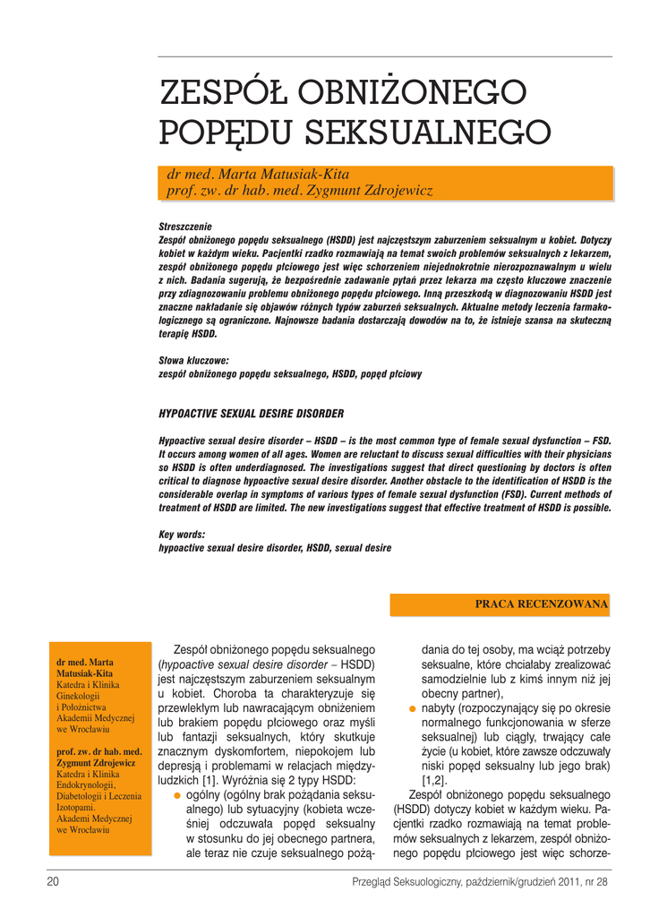 ZESPÓ¸ OBNI˚ONEGO POP¢DU SEKSUALNEGO dr med. Marta Matusiak-Kita prof. zw. dr hab. med. Zygmunt Zdrojewicz Streszczenie Zespó∏ obni˝onego pop´du seksualnego (HSDD) jest najcz´stszym zaburzeniem seksualnym u kobiet. Dotyczy kobiet w ka˝dym wieku. Pacjentki rzadko rozmawiajà na temat swoich problemów seksualnych z lekarzem, zespó∏ obni˝onego pop´du p∏ciowego jest wi´c schorzeniem niejednokrotnie nierozpoznawalnym u wielu z nich. Badania sugerujà, ˝e bezpoÊrednie zadawanie pytaƒ przez lekarza ma cz´sto kluczowe znaczenie przy zdiagnozowaniu problemu obni˝onego pop´du p∏ciowego. Innà przeszkodà w diagnozowaniu HSDD jest znaczne nak∏adanie si´ objawów ró˝nych typów zaburzeƒ seksualnych. Aktualne metody leczenia farmakologicznego sà ograniczone. Najnowsze badania dostarczajà dowodów na to, ˝e istnieje szansa na skutecznà terapi´ HSDD. S∏owa kluczowe: zespó∏ obni˝onego pop´du seksualnego, HSDD, pop´d p∏ciowy HYPOACTIVE SEXUAL DESIRE DISORDER Hypoactive sexual desire disorder – HSDD – is the most common type of female sexual dysfunction – FSD. It occurs among women of all ages. Women are reluctant to discuss sexual difficulties with their physicians so HSDD is often underdiagnosed. The investigations suggest that direct questioning by doctors is often critical to diagnose hypoactive sexual desire disorder. Another obstacle to the identification of HSDD is the considerable overlap in symptoms of various types of female sexual dysfunction (FSD). Current methods of treatment of HSDD are limited. The new investigations suggest that effective treatment of HSDD is possible. Key words: hypoactive sexual desire disorder, HSDD, sexual desire PRACA RECENZOWANA dr med. Marta Matusiak-Kita Katedra i Klinika Ginekologii i Po∏o˝nictwa Akademii Medycznej we Wroc∏awiu prof. zw. dr hab. med. Zygmunt Zdrojewicz Katedra i Klinika Endokrynologii, Diabetologii i Leczenia Izotopami. Akademi Medycznej we Wroc∏awiu 20 Zespó∏ obni˝onego pop´du seksualnego (hypoactive sexual desire disorder – HSDD) jest najcz´stszym zaburzeniem seksualnym u kobiet. Choroba ta charakteryzuje si´ przewlek∏ym lub nawracajàcym obni˝eniem lub brakiem pop´du p∏ciowego oraz myÊli lub fantazji seksualnych, który skutkuje znacznym dyskomfortem, niepokojem lub depresjà i problemami w relacjach mi´dzyludzkich [1]. Wyró˝nia si´ 2 typy HSDD: ● ogólny (ogólny brak po˝àdania seksualnego) lub sytuacyjny (kobieta wczeÊniej odczuwa∏a pop´d seksualny w stosunku do jej obecnego partnera, ale teraz nie czuje seksualnego po˝à- dania do tej osoby, ma wcià˝ potrzeby seksualne, które chcia∏aby zrealizowaç samodzielnie lub z kimÊ innym ni˝ jej obecny partner), ● nabyty (rozpoczynajàcy si´ po okresie normalnego funkcjonowania w sferze seksualnej) lub ciàg∏y, trwajàcy ca∏e ˝ycie (u kobiet, które zawsze odczuwa∏y niski pop´d seksualny lub jego brak) [1,2]. Zespó∏ obni˝onego pop´du seksualnego (HSDD) dotyczy kobiet w ka˝dym wieku. Pacjentki rzadko rozmawiajà na temat problemów seksualnych z lekarzem, zespó∏ obni˝onego pop´du p∏ciowego jest wi´c schorze- Przeglàd Seksuologiczny, paêdziernik/grudzieƒ 2011, nr 28 niem niejednokrotnie nierozpoznawalnym u wielu z nich. Z drugiej strony lekarze podczas wizyty cz´sto nie lubià podejmowaç tematów dotyczàcych problemów intymnych swoich pacjentek. Wielu z nich uwa˝a, ˝e brak im wystarczajàcej wiedzy i doÊwiadczenia, by zajàc si´ problemem, inni sàdzà, ˝e podj´cie tematu seksualnoÊci pacjentki zajmie zbyt wiele czasu podczas rutynowej wizyty lekarskiej. Oko∏o 60% ankietowanych lekarzy oceni∏o swojà wiedz´ na temat zaburzeƒ seksualnych, w tym zespo∏u obni˝onego pop´du seksualnego, jako s∏abà lub co najwy˝ej zadowalajàcà [3,4]. Zarówno lekarze, jak i pacjentki niech´tnie rozpoczynajà rozmow´ na temat seksualnoÊci. Badania zaburzeƒ seksualnych pokaza∏y, ˝e jeÊli zainicjowanie rozmowy na ten temat pozostawimy pacjentkom, nie lekarzom, problem mo˝e nigdy nie ujrzeç Êwiat∏a dziennego [3]. Najcz´stszym powodem, dla którego kobiety nie podejmujà tematu HSDD w gabinetach lekarskich jest wstyd i za˝enowanie nie tylko ich samych, ale obawa, ˝e zak∏opotany poczuje si´ lekarz i przez to pozostawi problem nierozwiàzany [3,5]. Wed∏ug badaƒ tylko 20% kobiet skar˝àcych si´ na obni˝ony pop´d p∏ciowy zasi´ga porady lekarskiej [6]. Badania sugerujà, ˝e bezpoÊrednie zadawanie pytaƒ przez lekarza ma cz´sto kluczowe znaczenie przy zdiagnozowaniu problemu obni˝onego pop´du p∏ciowego [3,4]. Nawet jeÊli pacjentka wspomina o swojej chorobie zupe∏nie spontanicznie, konkretne pytania zadawane przez lekarza mogà pozwoliç rozwinàç temat i utwierdziç jà w przekonaniu, ˝e rozmowa dotyczàca kr´pujàcej jà dolegliwoÊci jest mo˝liwa. Taka rozmowa mo˝e zostaç nawiàzana podczas rutynowej wizyty ginekologicznej lub wizyty dotyczàcej dolegliwoÊci okresu oko∏omenopauzalnego przy okazji omawiania wskazaƒ i przeciwwskazaƒ do terapii hormonalnej [3,7]. Lekarze powinni doskonaliç swoje umiej´tnoÊci komunikacyjne, by czuç si´ w rozmowie z pacjentkà swobodnie, a tak˝e sprawiç, aby ona poczu∏a si´ tak samo [3,18]. Pacjentki uwa˝ajà, ˝e aby uznaç rozmow´ na temat problemów seksualnych za wystarczajàco komfortowà, lekarz musi spe∏niaç pewne warunki: byç mi∏y i wyrozumia∏y, byç spokojny i nieskr´powany, zachowywaç si´ profesjonalnie, sprawiaç wra˝enie zainteresowanego sprawami seksu, znaç pacjentk´ [3,9]. 90% z nich uwa˝a wymienione cechy lekarza za konieczne, aby rozmowa na temat ich zdrowia seksualnego by∏a mo˝liwie swobodna [9]. Pacjentki z HSDD nierzadko ze swoim problemem zg∏aszajà si´ najpierw do lekarza pierwszego kontaktu, który najcz´Êciej (90%) nie próbuje diagnozowaç choroby, nie jest pewien czy postawi∏ dobrà diagnoz´ (90%) lub nie przepisuje leków, jeÊli nawet chorob´