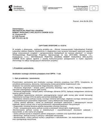Poznań, dnia 06.06.2016 Zamawiający: INDYWIDUALNA PRAKTYKA LEKARSKA ROBERT WASILEWICZ SPECJALISTA CHORÓB OCZU Ul. Krańcowa 83 61-048 Poznań NIP 973-033-46-52 ZAPYTANIE OFERTOWE nr 4/2016 W związku z planowaną realizacją projektu pn. „Wzrost innowacyjności Indywidualnej Praktyki Lekarskiej doktora Roberta Wasilewicza w diagnostyce oraz leczeniu neuropatii jaskrowej poprzez zakup nowoczesnych urządzeń i oprogramowania niezbędnych do rozwoju placówki” w ramach Wielkopolskiego Regionalnego Programu Operacyjnego na lata 2014-2020, Działanie 1.5., Poddziałanie 1.5.2., INDYWIDUALNA PRAKTYKA LEKARSKA ROBERT WASILEWICZ SPECJALISTA CHORÓB OCZU ogłasza zgodnie z zasadą konkurencyjności postępowanie w trybie zapytania ofertowego na zakup następujących elementów projektu: 1.Przedmiot zamówienia: Analizator ocznego ciśnienia przepływu krwi OPFA - 1 szt. 1. Opis przedmiotu zamówienia: Przedmiotem zamówienia jest Analizator ocznego ciśnienia przepływu krwi OPFA. Urządzenie, to umożliwia jednoczesną, obuoczną, nieinwazyjną ocenę parametrów krążeniowych oka. Analizator ma szerokie zastosowanie diagnostyczne- służył do : - Wczesnej diagnostyki i terapia jaskry pierwotnej otwartego kąta (JPOK), będącej następstwem zaburzeń autoregulacji naczyń gałki ocznej . - Wczesnej diagnostyki i terapia jaskry normalnego ciśnienia (NTG), będącej następstwem obniżonej rezerwy perfuzji ocznej. - Identyfikacji ograniczonej zdolności autoregulacyjnej naczyń gałki ocznej jako oznaki konwersji nadciśnienia ocznego (OH) do jaskry pierwotnej otwartego kąta - Określenia ciśnienia perfuzji ocznej, ocznego ciśnienia tętniczego, objętości ocznego ciśnienia pulsu jako podstawowych parametrów diagnostyki i oceny efektywności terapii jaskry - Oceny perfuzji tętniczej i żylnej po przebytych procesach zatorowych i zakrzepowych naczyń siatkówki, tętnicy ocznej oraz w naczyniówkowych nieprawidłowościach naczyniowych - Diagnostyki i kontrola leczenia arteritis temporalis (choroby Hortona) - Przed- i pooperacyjnej oceny perfuzji ocznej w procesach okluzji tętnic dogłowowych, -Monitorowania perfuzji ocznej w dziedzicznych i zwyrodnieniowych chorobach siatkówki i naczyniówki, w celu oceny ich progresji - Oceny perfuzji ocznej w związaniu plamki związanym z wiekiem oraz dystrofiach plamki - Monitoringu perfuzji ocznej w cukrzycy i retinopatii cukrzycowej - Monitorowania i oceny perfuzji ocznej u pacjentów z nadciśnieniem lub niedociśnieniem tętniczym oraz dysregulacją naczyniową Pożądane parametry urządzenia: • Możliwość badania przeprowadzanego jednocześnie dla obu gałek ocznych. • Możliwość wykonania badania w trakcie max .1 min. • Kompaktowe urządzenie o wymiarach max. 38 cm x 25.5 cm x 14.5 cm • Waga max. 5,3kg • Zasilanie 240V • Integralny dedykowany software urządzenia pozwalający na jednoczesny pomiar parametrów obu gałek ocznych: analizę perfuzji oraz hemodynamiki gałki ocznej, pomiar zdolności autoregulacyjnej do szacowania rezerwy perfuzji ocznej, pomiary automatyczne i manualne, obszerne narzędzie do raportowania wyników. Wspólny słownik zamówień (CPV): 33100000-1 Urządzenia medyczne 2. Planowany termin realizacji zamówienia: do 29.07.2016 Miejsce wykonania zamówienia: ul. Półwiejska 4, 61-888 Poznań Zamawiający nie dopuszcza składania ofert częściowych - rozpatrywane będą tylko oferty kompletne dotyczące całości zamówienia. 3. Warunki udziału w postepowaniu: Do postępowania zostaną dopuszczeni oferenci spełniający następujące warunki: 1. 2. 3. 4. 5. Posiadanie uprawnień do wykonywania określonej działalności lub czynności, jeżeli przepisy prawa nakładają obowiązek ich posiadania. Znajdowanie się w sytuacji ekonomicznej i finansowej zapewniającej wykonanie zamówienia we wskazanych terminach. Posiadanie niezbędnej wiedzy i doświadczenia oraz dysponowanie odpowiednim potencjałem technicznym i osobami zdolnymi do wykonania zamówienia lub zagwarantowanie odpowiednich podwykonawców posiadających niezbędną wiedzę i doświadczenie dysponujących odpowiednim potencjałem technicznym i osobami zdolnymi do wykonania zamówienia. Złożenie oświadczeń na ofercie o braku występowania powiązań. Przedstawienie specyfikacji do urządzenia pozwalającej ocenić parametry. Zamawiający w celu potwierdzenia spełnienia w/w warunków wymaga przedłożenia następujących dokumentów: 1) Złożenie oferty zawierającej: • Nazwę, adres oferenta i NIP oferenta. • Datę wystawienia oferty • Dane pozwalające ocenić ofertę i przyznać punkty w ramach kryteriów • Termin ważności oferty – minimum 60 dni od zakończenia terminu składania ofert. • Cenę netto i brutto 2) Przedstawienie specyfikacji do urządzenia pozwalającej ocenić parametry. 3) Złożenie na ofercie oświadczeń o następującej treści: • Wykonawca oświadcza, że zna i akceptuje warunki realizacji zamówienia określone w zapytaniu ofertowym oraz nie wnosi żadnych zastrzeżeń i uwag w tym zakresie. • Wykonawca posiada uprawnienia do wykonywania określonej działalności lub czynności, jeżeli ustawy nakładają obowiązek posiadania takich uprawnień. • Znajdowanie się w sytuacji ekonomicznej i finansowej zapewniającej wykonanie zamówienia we wskazanych terminach. • Wykonawca posiada niezbędną wiedzę i doświadczenie dotyczące przedmiotu zamówienia oraz dysponuje odpowiednim potencjałem technicznym i osobami zdolnymi do wykonania zamówienia lub zagwarantowanie odpowiednich podwykonawców posiadających niezbędną wiedzę i doświadczenie dysponujących odpowiednim potencjałem technicznym i osobami zdolnymi do wykonania zamówienia. • Wykonawca oświadcza, że nie jest powiązany osobowo lub kapitałowo z Zamawiającym. Przez powiązania osobowe lub kapitałowe rozumie się wzajemne powiązania pomiędzy Zamawiającym lub osobami upoważnionymi do zaciągania zobowiąza