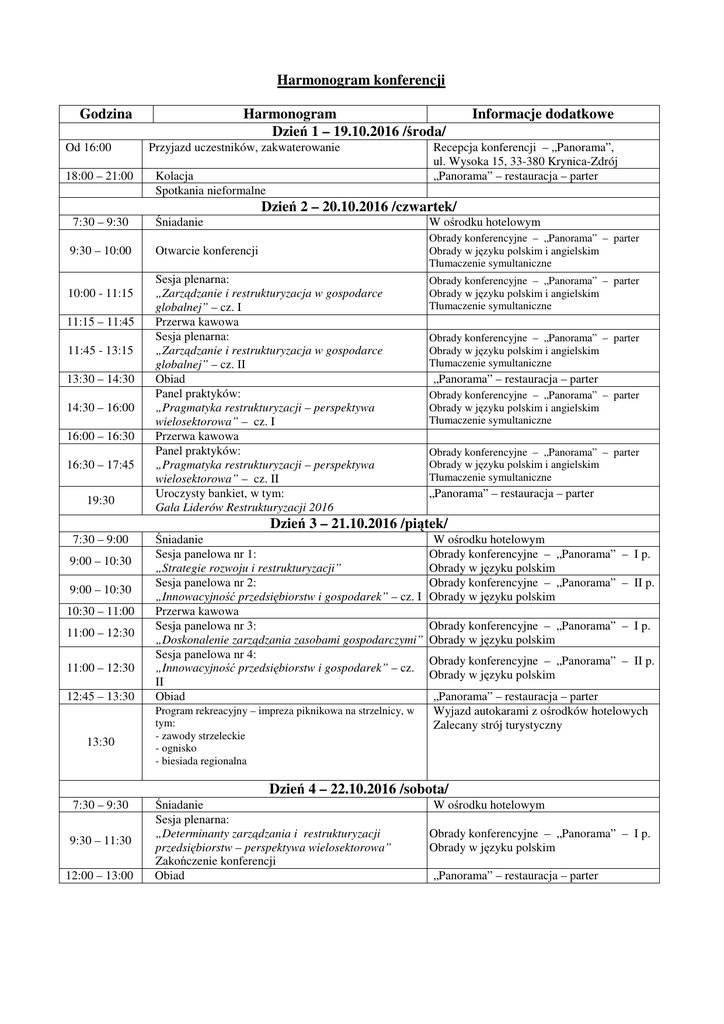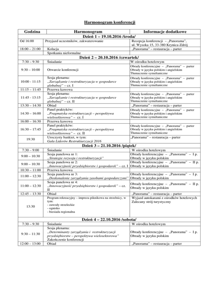Harmonogram konferencji Godzina Od 16:00 18:00 – 21:00 Harmonogram Dzień 1 – 19.10.2016 /środa/ Przyjazd uczestników, zakwaterowanie Kolacja Spotkania nieformalne Informacje dodatkowe Recepcja konferencji – „Panorama”, ul. Wysoka 15, 33-380 Krynica-Zdrój „Panorama” – restauracja – parter Dzień 2 – 20.10.2016 /czwartek/ 7:30 – 9:30 Śniadanie W ośrodku hotelowym 9:30 – 10:00 Otwarcie konferencji Obrady konferencyjne – „Panorama” – parter Obrady w języku polskim i angielskim Tłumaczenie symultaniczne 10:00 - 11:15 11:15 – 11:45 11:45 - 13:15 13:30 – 14:30 14:30 – 16:00 16:00 – 16:30 16:30 – 17:45 19:30 Sesja plenarna: „Zarządzanie i restrukturyzacja w gospodarce globalnej” – cz. I Przerwa kawowa Sesja plenarna: „Zarządzanie i restrukturyzacja w gospodarce globalnej” – cz. II Obiad Panel praktyków: „Pragmatyka restrukturyzacji – perspektywa wielosektorowa” – cz. I Przerwa kawowa Panel praktyków: „Pragmatyka restrukturyzacji – perspektywa wielosektorowa” – cz. II Uroczysty bankiet, w tym: Gala Liderów Restrukturyzacji 2016 Obrady konferencyjne – „Panorama” – parter Obrady w języku polskim i angielskim Tłumaczenie symultaniczne Obrady konferencyjne – „Panorama” – parter Obrady w języku polskim i angielskim Tłumaczenie symultaniczne „Panorama” – restauracja – parter Obrady konferencyjne – „Panorama” – parter Obrady w języku polskim i angielskim Tłumaczenie symultaniczne Obrady konferencyjne – „Panorama” – parter Obrady w języku polskim i angielskim Tłumaczenie symultaniczne „Panorama” – restauracja – parter Dzień 3 – 21.10.2016 /piątek/ 7:30 – 9:00 9:00 – 10:30 9:00 – 10:30 10:30 – 11:00 11:00 – 12:30 11:00 – 12:30 12:45 – 13:30 13:30 Śniadanie Sesja panelowa nr 1: „Strategie rozwoju i restrukturyzacji” Sesja panelowa nr 2: „Innowacyjność przedsiębiorstw i gospodarek” – cz. I Przerwa kawowa Sesja panelowa nr 3: „Doskonalenie zarządzania zasobami gospodarczymi” Sesja panelowa nr 4: „Innowacyjność przedsiębiorstw i gospodarek” – cz. II Obiad Program rekreacyjny – impreza piknikowa na strzelnicy, w tym: - zawody strzeleckie - ognisko - biesiada regionalna W ośrodku hotelowym Obrady konferencyjne – „Panorama” – I p. Obrady w języku polskim Obrady konferencyjne – „Panorama” – II p. Obrady w języku polskim Obrady konferencyjne – „Panorama” – I p. Obrady w języku polskim Obrady konferencyjne – „Panorama” – II p. Obrady w języku polskim „Panorama” – restauracja – parter Wyjazd autokarami z ośrodków hotelowych Zalecany strój turystyczny Dzień 4 – 22.10.2016 /sobota/ 7:30 – 9:30 9:30 – 11:30 12:00 – 13:00 Śniadanie Sesja plenarna: „Determinanty zarządzania i restrukturyzacji przedsiębiorstw – perspektywa wielosektorowa” Zakończenie konferencji Obiad W ośrodku hotelowym Obrady konferencyjne – „Panorama” – I p. Obrady w języku polskim „Panorama” – restauracja – parter Uwagi organizacyjne 1. Termin konferencji 2. Recepcja konferencji 3. Wystąpienia konferencyjne Od 19 do 22 października 2016 r., przyjazd Uczestników jest przewidziany w środę (19.10.) – możliwość kwaterowania od godz. 16-tej „Panorama”, ul. Wysoka 15, 33-380 Krynica-Zdrój Tel.: (18) 471 28 85, 471 56 45; tel./fax: (18) 471 54 15 W ramach każdej sesji prezentowane będą referaty wprowadzające, wygłaszane przez zaproszonych prelegentów. W dalszej części odbędzie się dyskusja z udziałem wszystkich osób uczestniczących. Do dyspozycji rzutnik, notebook i projektor multimedialny.