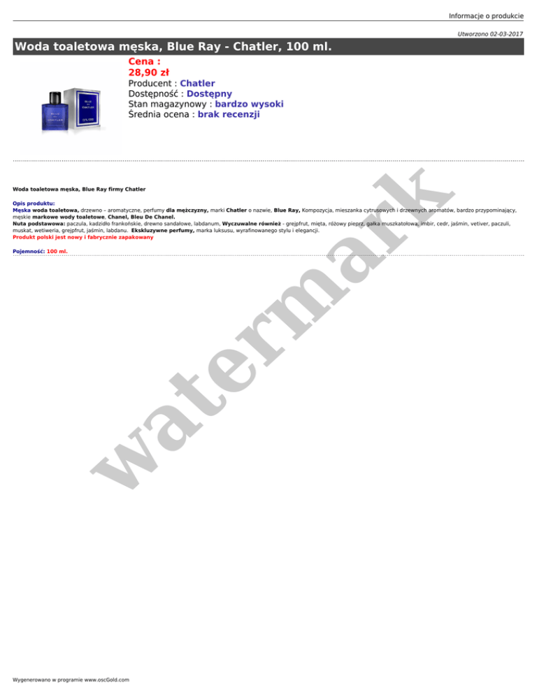 Informacje o produkcie Utworzono 02-03-2017 Woda toaletowa męska, Blue Ray - Chatler, 100 ml. Cena : 28,90 zł Producent : Chatler Dostępność : Dostępny Stan magazynowy : bardzo wysoki Średnia ocena : brak recenzji er m ar k Woda toaletowa męska, Blue Ray firmy Chatler Opis produktu: Męska woda toaletowa, drzewno – aromatyczne, perfumy dla mężczyzny, marki Chatler o nazwie, Blue Ray, Kompozycja, mieszanka cytrusowych i drzewnych aromatów, bardzo przypominający, męskie markowe wody toaletowe, Chanel, Bleu De Chanel. Nuta podstawowa: paczula, kadzidło frankońskie, drewno sandałowe, labdanum, Wyczuwalne również - grejpfrut, mięta, różowy pieprz, gałka muszkatołowa, imbir, cedr, jaśmin, vetiver, paczuli, muskat, wetiweria, grejpfrut, jaśmin, labdanu. Ekskluzywne perfumy, marka luksusu, wyrafinowanego stylu i elegancji. Produkt polski jest nowy i fabrycznie zapakowany w at Pojemność: 100 ml. Wygenerowano w programie www.oscGold.com