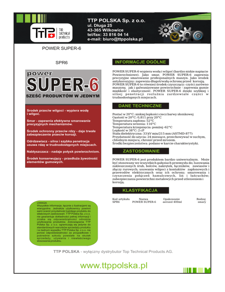 TTP POLSKA Sp. z o.o. ul. Długa 25 43-365 Wilkowice tel/fax: 33 816 04 14 e-mail: [email protected] POWER SUPER-6 INFORMACJE OGÓLNE SPR6 power SUPER-6 SZEŚĆ PRODUKTÓW W JEDNYM SUPERSZYBKI KLEJ POWER SUPER-6 wypiera wodę i wilgoć (bardzo niskie napięcie Powierzchniowe). Jako smar, POWER SUPER-6 zapewnia precyzyjne smarowanie profesjonalnych maszyn. Jako środek antykorozyjny: zapewnia długotrwałą ochronę przed korozją. POWER SUPER-6 to również środek czyszczący: czyści zarówno maszyny, jak i galwanizowane powierzchnie - zapewnia gumie miękkość i elastyczność. POWER SUPER-6 dzięki szybkiej i silnej penetracji rozluźnia zardzewiałe części w trudnodostępnych miejscach. DANE TECHNICZNE Srodek przeciw wilgoci - wypiera wodę i wilgoć. Smar - zapewnia efektywne smarowanie precyzyjnych mechanizmów. Środek ochronny przeciw rdzy - daje trwałe zabezpieczenie przeciw korozji. Odrdzewiacz - silna i szybka penetracja usuwa rdzę w trudnodostępnych miejscach. Nabłyszczacz - nadaje połysk powierzchniom. Środek konserwujący - przedłuża żywotność elementów gumowych. Postać w 20°C: niskiej lepkości ciecz barwy słomkowej Gęstość w 20°C: 0,811 przy 20°C Temperatura zapłonu: 52°C Temperatura wrzenia: 116°C Temperatura krzepnięcia: poniżej -62°C Lepkość w 38°C: 2 cP Stała dielektryczna: 33 kV min/215 mm (ASTMD-877) Przydatność do użycia: 24 miesiące, przechowywać w suchym, chłodnym miejscu, chronić przed mrozem. Środki bezpieczeństwa: podano w karcie charakterystyki. ZASTOSOWANIE POWER SUPER-6 jest produktem bardzo uniwersalnym. Może być stosowany we wszystkich gałęziach przemysłu do; luzowania zakleszczonych śrub, bolców, nakrętek, łączników, zawiasów i złączy rurowych; usuwania wilgoci z kontaktów zapłonowych i przewodów elektrycznych oraz ich ochrony; smarowania i czyszczenia połączeń hamulcowych, lin i łańcuchów; zabezpieczania powierzchni metalowych przed utlenieniem i korozją. KLASYFIKACJA UWAGA Wszystkie informacje, łącznie z ilustracjami są wiarygodne. Jednakże użytkownicy powinni sami ocenić przydatność każdego produktu do właściwych zastosowań. TTP Polska Sp. z o.o. nie gwarantuje dokładności pełnej informacji i zrzeka się odpowiedzialności odnośnie użytkowania produktów. Zobowiązania TTP Polska Sp. z o.o. ograniczają się jedynie do standardowych warunków sprzedaży produktu i w żadnym wypadku TTP Polska Sp. z o.o. nie ponosi odpowiedzialności za przypadkowe i pośrednie szkody powstałe na skutek sprzedaży, używania i niewłaściwego stosowania produktu. Kod artykułu Nazwa SPR6 POWER SUPER-6 Opakowanie aerozol 400ml TTP POLSKA - wyłączny dystrybutor Top Technical Products AG. www.ttppolska.pl Rodzaj smary