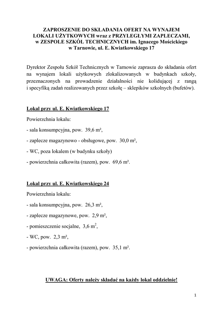 ZAPROSZENIE DO SKŁADANIA OFERT NA WYNAJEM LOKALI UŻYTKOWYCH wraz z PRZYLEGŁYMI ZAPLECZAMI, w ZESPOLE SZKÓL TECHNICZNYCH im. Ignacego Mościckiego w Tarnowie, ul. E. Kwiatkowskiego 17 Dyrektor Zespołu Szkół Technicznych w Tarnowie zaprasza do składania ofert na wynajem lokali użytkowych zlokalizowanych w budynkach szkoły, przeznaczonych na prowadzenie działalności nie kolidującej z rangą i specyfiką zadań realizowanych przez szkołę – sklepików szkolnych (bufetów). Lokal przy ul. E. Kwiatkowskiego 17 Powierzchnia lokalu: - sala konsumpcyjna, pow. 39,6 m², - zaplecze magazynowo - obsługowe, pow. 30,0 m², - WC, poza lokalem (w budynku szkoły) - powierzchnia całkowita (razem), pow. 69,6 m². Lokal przy ul. E. Kwiatkowskiego 24 Powierzchnia lokalu: - sala konsumpcyjna, pow. 26,3 m², - zaplecze magazynowe, pow. 2,9 m², - pomieszczenie socjalne, 3,6 m2, - WC, pow. 2,3 m², - powierzchnia całkowita (razem), pow. 35,1 m². UWAGA: Oferty należy składać na każdy lokal oddzielnie! 1 1. OPISY OBIEKTÓW 1.1. OPIS DOTYCZĄCY LOKALU przy ul. E. Kwiatkowskiego 17 (budynek „główny”) 1.1.1. Wejście do budynku od strony ul. E. Kwiatkowskiego. 1.1.2. Pomieszczenia znajdują się w suterynach – wejście z korytarza (obok szatni). 1.1.3. Ostatnia funkcja – sklepik szkolny (bufet). 1.1.4. Stan techniczny pomieszczeń – dobry. 1.1.5. Instalacja wodnokanalizacyjna - miejska. 1.1.6. Wentylacja pomieszczeń – grawitacyjna (przewietrzanie). 1.1.7. Istniejące instalacje c.o. i ciepłej wody użytkowej. 1.1.8. Instalacja elektryczna 230/380 V. 1.1.9. Media rozliczane w ramach czynszu. 1.1.10. Instalacja telefoniczna – brak niezależnej, zewnętrznej linii telefonicznej w lokalu. 1.2.OPIS DOTYCZĄCY LOKALU przy ul. E. Kwiatkowskiego 24 (budynek „pracowni”) 1.2.1. Wejście do budynku od strony parkingu szkolnego oraz (awaryjne + dostawy towaru) od strony hali sportowej. Dojazd od strony ul. Chemicznej między budynkami „pracowni” i hali sportowej. 1.2.2. Pomieszczenia znajdują się w południowej części korytarza parteru, wejście z korytarza. 1.2.3. Ostatnia funkcja – sklepik szkolny (bufet). 1.2.4. Stan techniczny pomieszczeń – bardzo dobry. 1.2.5. Instalacja wodociągowa i kanalizacyjna – miejska. 1.2.6 Wentylacja pomieszczeń – grawitacyjna (przewietrzanie). 1.2.7 Istniejąca instalacja co. i ciepłej wody użytkowej. 1.2.8 Instalacja elektryczna 230/380 V. 1.2.9 Media rozliczane w ramach czynszu. 1.2.10 Instalacja telefoniczna – brak niezależnej, zewnętrznej linii telefonicznej w lokalu. 2 2. WYNAJMUJĄCY OCZEKUJE OD NAJEMCY 2.1. Prowadzenia działalności, licującej z powagą szkoły, która nie będzie uciążliwa dla okolicznych instytucji oraz nie będzie zakłócała pracy szkoły. 2.2. Nie prowadzenia handlu artykułami szkodliwymi dla zdrowie uczniów, w tym: wyrobami alkoholowymi, tytoniowymi, odurzającymi, energetyzującymi, itp. 2.3. Odpowiedniego przygotowania i wyposażenia pomieszczeń zgodnie wszelkimi przepisami dotyczącymi prowadzonej działalności. 2.4. Utrzymania w pomieszczeniach czystości i właściwych warunków sanitarnych. 2.5.Uzgodnienia z Wynajmującym miejsca umieszczenia, treści, rozmiarów oraz wyglądu tablicy reklamowej. 3. OPŁATA PO STRONIE NAJEMCY: 3.1.Umowy najmu zawierane będą na okres 1 roku kalendarzowego z możliwością przedłużenia na następny rok. 3.2.Wpłaty dokonywane będą przez 10 miesięcy, tj. przez okres funkcjonowania sklepiku szkolnego (bufetu) czyli z wykluczeniem miesięcy wakacyjnych – lipca i sierpnia. 3.3.Czynsz – płatny na podstawie umowy na konto Wynajmującego. 3.4.Wynajmujący zapewnia sobie możliwość corocznej waloryzacji czynszu. 3.5.Koszty zużytej energii elektrycznej, centralnego ogrzewania, wody i ścieków oraz wywozu odpadów komunalnych stanowią opłatę zryczałtowaną ujętą w opłacie najmu. 3.6.Nakłady adaptacyjne poniesione przez najemcę nie podlegają zwrotowi w przypadku rozwiązania umowy z przyczyn leżących po stronie najemcy, a ich wysokość nie może stanowić podstawy do obniżenia opłat czynszowych po zawarciu umowy. 3 4. SKŁADANIE OFERT 4.1. Ofertę należy złożyć na „Formularzu Oferty” wg załączonego do niniejszego zaproszenia wzoru (załącznik nr 1) wraz z dokumentami określonymi w formularzu, oraz opisem planowanej działalności sklepiku szkolnego (bufetu). 4.2. Wzór „Formularza Oferty” dostępny jest na stronie internetowej pod adresem: http://www.bip.zst.tarnow.pl/ (zakładka zamówienia publiczne i tablica ogłoszeń) oraz www.zst.tarnow.pl (zakładka aktualności). 4.3.Ofertę należy składać w zamkniętej kopercie z napisem: „OFERTA NA WYNAJEM LOKALU UŻYTKOWEGO przy ul. E. KWIATKOWSKIEGO 17 w TARNOWIE” lub (i) „OFERTA NA WYNAJEM LOKALU UŻYTKOWEGO przy ul. E. KWIATKOWSKIEGO 24 w TARNOWIE” od poniedziałku do piątku, w godzinach od 8.00 do 15.00 w terminie do dnia 16.08.2011 r. w sekretariacie szkoły przy ul. E. Kwiatkowskiego 17 (I piętro). 4.4.Osoby zainteresowane, mogą przed złożeniem oferty dokonać oględzin pomieszczeń, w poniedziałki i czwartki w godzinach od 8.00 do 12.00 – po zgłoszeniu w sekretariacie szkoły. 4.5.Oferty nie spełniające określonych w niniejszym zaproszeniu wymogów lub złożone po wyznaczonym terminie nie będą rozpatrywane. 4.6.Złożone oferty nie będą zwracane oferentom. 5. ROZPATRZENIE OFERT 5.1.Komisyjne otwarcie ofert nastąpi w dniu 18.08.2011r. o godz. 10.00 w gabinecie dyrektora szkoły. 5.2.Oferty oceniane będą przez Komisję pod względem: proponowanej wysokości czynszu brutto za 1m² oraz koncepcji funkcjonowania sklepiku szkolnego (bufetu). 5.3.Ustala się minimalną cenę najmu za 1m² w wysokości 20,00 zł brutto (słownie zł: dwadzieścia złotych, 00/100), co stosownie do powierzchni całkowitej najmowanego lokalu daje minimalną kwotę miesięczną za całość lokalu (lokal w budynku głównym minimum 1392,00 zł miesięcznie, lok