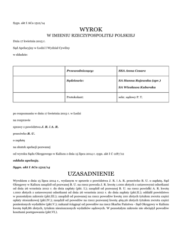 Sygn. akt I ACa 1512/14 WYROK W IMIENIU RZECZYPOSPOLITEJ POLSKIEJ Dnia 17 kwietnia 2015 r. Sąd Apelacyjny w Łodzi I Wydział Cywilny w składzie: Przewodniczący: SSA Anna Cesarz Sędziowie: SA Hanna Rojewska (spr.) SA Wiesława Kuberska Protokolant: sekr. sądowy P. T. po rozpoznaniu w dniu 17 kwietnia 2015 r. w Łodzi na rozprawie sprawy z powództwa J. R. i A. R. przeciwko B. U. o zapłatę na skutek apelacji pozwanej od wyroku Sądu Okręgowego w Kaliszu z dnia 15 lipca 2014 r. sygn. akt I C 1187/12 oddala apelację. Sygn. akt I ACa 1512/14 UZASADNIENIE Wyrokiem z dnia 15 lipca 2014 r., wydanym w sprawie z powództwa J. R. i A. R. przeciwko B. U. o zapłatę, Sąd Okręgowy w Kaliszu zasądził od pozwanej B. U. na rzecz powoda J. R. kwotę 1.000 złotych z ustawowymi odsetkami od dnia 26 września 2012 r. do dnia zapłaty (pkt. I.); zasądził od pozwanej B. U. na rzecz powódki A. R. kwotę 1.000 złotych z ustawowymi odsetkami od dnia 26 września 2012 r. do dnia zapłaty (pkt.II.); oddalił powództwo w pozostałym zakresie (pkt.III.); zasądził od pozwanej na rzecz powodów kwotę 100 złotych tytułem zwrotu części opłaty stosunkowej (pkt.IV.); zasądził od powodów na rzecz pozwanej kwotę 469,26 złotych tytułem zwrotu części poniesionych wydatków (pkt.V.); nakazał ściągnąć od powodów na rzecz Skarbu Państwa - Sąd Okręgowy w Kaliszu kwotę 698,86 złotych, tytułem nieuiszczonych wydatków sądowych. W pozostałym zakresie nie obciążył powodów kosztami postępowania (pkt.VI.). Powyższy wyrok zapadł na podstawie poczynionych przez Sąd pierwszej instancji ustaleń faktycznych, z których wynika między innymi, że powód J. R. mieszkał w O. przy ul. (...) od 1997 r. jednak do 2005 r. przebywał we W., gdzie pracował. W 2001 r. powód zawarł związek małżeński z powódką A. R.. W 2005 r. powodowie zamieszkali w O.. Mieszkanie powodów znajdowało się na pierwszym piętrze, bezpośrednio nad barem (...). Wcześniej do 2006 roku znajdował się tam bar piwny, który był usytuowany w dalszej części budynku, nie bezpośrednio pod mieszkaniem powodów. Później prowadzono tam dyskotekę, która na skutek skarg mieszkańców zastała zamknięta. Powód pracuje w delegacji i do domu przyjeżdżał w weekendy. Naprzeciwko budynku powoda jest tor żużlowy, a w czasie zawodów w niedzielę oraz w czasie treningów jest duży hałas. Powodom nie przeszkadzał hałas z toru żużlowego. W dniu 3 lutego 2007 r. powódka doznała udaru mózgu wskutek pęknięcia tętniaka. Ciąża powódki była zagrożona poronieniem. W październiku i listopadzie 2011 r. konsultowała się psychologicznie. Powód palił papierosy i miał podwyższony cholesterol. W dniu 12 listopada 2010 r. doznał zawału serca. We wrześniu 2011 r. leczył się psychiatrycznie, przyjmował lekarstwa, aktualnie nie leczy się psychiatrycznie. Syn powodów F. urodził się w (...) r. Powódka w 2010 r. była w ciąży z drugim dzieckiem, które urodziło się (...) Powódka słyszała z lokalu pozwanej głośną muzykę, drgania, hałas opuszczanych krat, rąbanie drewna. Mieszkanie powodów składało się z 1 pokoju i kuchni. Okno jest w kuchni, a w pokoju są tylko drzwi na balkon. Słychać było głośne rozmowy klientów baru przed budynkiem. W związku z tym powódka zwróciła uwagę mężowi pozwanej, który odpowiedział jej wulgarnie. Powódka brała ziołowe leki uspokajające. Pozwana B. G., obecnie U., w okresie od sierpnia 2010 r. do sierpnia 2012 r. prowadziła bar piwny Kofeina. Był to lokal serwujący wyłącznie alkohol, bez gastronomii. W lokalu było 5 ław i jeden zaciszny pokój z kanapą oraz stół bilardowy. Ponadto był telewizor z zestawem kina domowego, składającego się z 4 kolumn. Bar znajdował się bezpośrednio pod mieszkaniem powodów. Pozwana dysponowała pozwoleniem na prowadzoną działalność bez określenia godzin działania, z uwzględnieniem ciszy nocnej. W barze zazwyczaj był obecny mąż pozwanej. W tym lokalu (...) razy w 2011 r. odbyły się imprezy typu karaoke, zawsze w niedziele do godz. 22. K. obsługiwał J. M. na własnym sprzęcie muzycznym. Śpiewały wówczas nastolatki (12-13 lat) wraz ze swoimi matkami. Śpiewało do 10 osób, ale zrezygnowano z tej atrakcji, bo nie było chętnych do śpiewania, mimo braku opłat. Na potrzeby karaoke używano 2 kolumn o mocy 230 W, nie wykorzystywano pełnej mocy wzmacniacza (1.200 W). W lokalu nie odbywały się dyskoteki i zabawy taneczne. W telewizorze, który był w pubie, zazwyczaj włączano program muzyczny lub relację sportową. Klienci baru skarżyli się na oblewanie ich przez mieszkańców budynku wodą, obrzucanie niedopałkami papierosów, opluwanie. Lokal był otwarty w tygodniu od godzin porannych do godz. 22.00 a w weekend do godz. 1 lub 2 w nocy. W lokalu znajdował się kominek i czasami łamano drewno. Klientami lokalu była młodzież oraz osoby w średnim wieku, zamieszkałe w najbliższej okolicy. Pozwana podniosła ceny piwa, aby zniechęcić niechcianych klientów. W ciągu tygodnia nie było wielu klientów, natomiast w weekend pub miał więcej gości. Latem 2011 r. do lokalu pozwanej przyjechał patrol policji na interwencję, było to po godzinie 22:00, w tym czasie w pubie przebywał J. K.. Policjanci stwierdzili, że było spokojnie, pouczyli osoby przebywające w barze o ciszy nocnej i zakończyli interwencję. Zdarzyło się kiedyś, że M. D., który był klientem pubu, powód oblał wodą. Świadek zgłosił tą sytuację na Policję, która pouczyła powoda. W pubie Kofeina znajdował się bilard, z którego korzystali goście baru. Dla mieszkańców była to głośna gra. Słychać była odgłos uderzanych bil. Kiedy pub opuszczali klienci, słychać było ich głośne rozmowy i przekleństwa. Właściciel poprzedniego lokalu, po zwróceniu mu uwagi, uciszał klientów, natomiast mąż pozwanej, po zwróceniu uwagi o cichsze zachowanie, nakłaniał klie