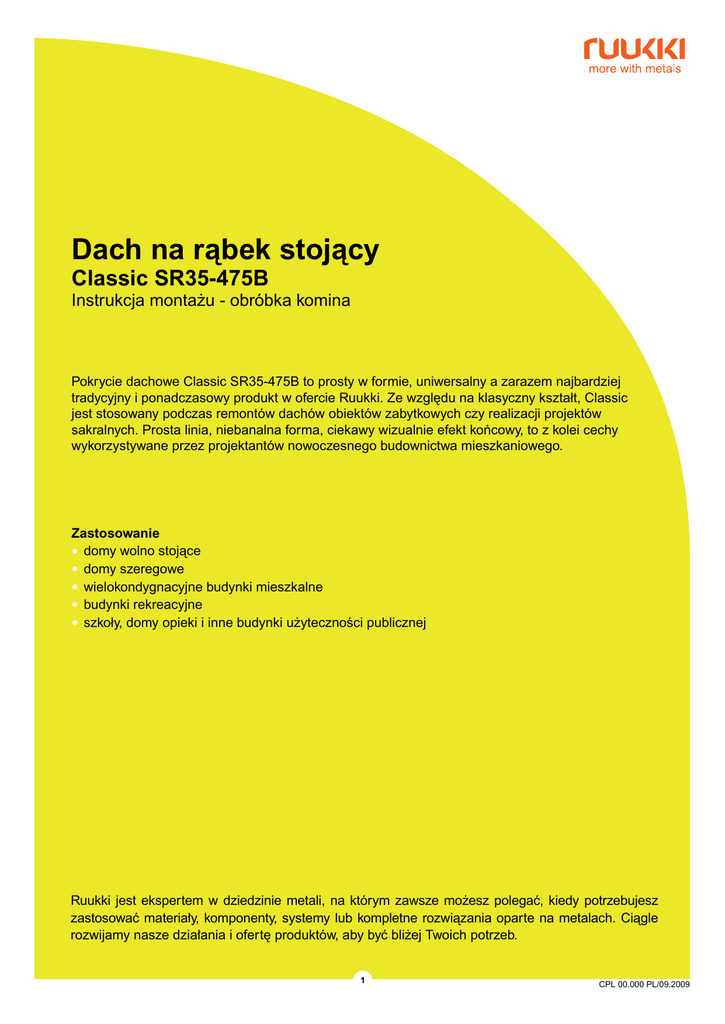 Dach na ràbek stojàcy Classic SR35-475B Instrukcja monta˝u - obróbka komina Pokrycie dachowe Classic SR35-475B to prosty w formie, uniwersalny a zarazem najbardziej tradycyjny i ponadczasowy produkt w ofercie Ruukki. Ze wzgl´du na klasyczny kształt, Classic jest stosowany podczas remontów dachów obiektów zabytkowych czy realizacji projektów sakralnych. Prosta linia, niebanalna forma, ciekawy wizualnie efekt koƒcowy, to z kolei cechy wykorzystywane przez projektantów nowoczesnego budownictwa mieszkaniowego. Zastosowanie • domy wolno stojàce • domy szeregowe • wielokondygnacyjne budynki mieszkalne • budynki rekreacyjne • szkoły, domy opieki i inne budynki u˝ytecznoÊci publicznej Ruukki jest ekspertem w dziedzinie metali, na którym zawsze mo˝esz polegaç, kiedy potrzebujesz zastosowaç materia∏y, komponenty, systemy lub kompletne rozwiàzania oparte na metalach. Ciàgle rozwijamy nasze dzia∏ania i ofert´ produktów, aby byç bli˝ej Twoich potrzeb. 1 CPL 00.000 PL/09.2009 Instrukcja monta˝u • Classic • Obróbka komina Zamocuj arkusze Classica do miejsca, gdzie wyst´puje komin. Wykonaj naci´cie w kominie na gł´bokoÊç 2 cm (zaznaczone linià przerywanà) w odległoÊci około 15 cm od górnej powierzchni łat. Je˝eli zaistnieje taka koniecznoÊç, nabij dodatkowe łaty. Zamocuj arkusze Classic poni˝ej komina tak, aby si´gały ok. 1 cm od dolnej kraw´dzi. Przygotuj ràbki po bokach okna do połàczenia poprzecznego wg zaleceƒ na str. 17 w Instrukcji monta˝u. Zamocuj po bokach arkusze o długoÊci = długoÊç komina + 2 x długoÊç zakładu (według zaleceƒ na str. 17 w Instrukcji monta˝u). Arkusze zagnij tak, aby zachodziły na komin około 10 cm. Arkusz przymocuj do łat – nie mocuj arkusza do Êciany komina! Ràbki na górze arkusza nale˝y przygotowaç do połàczenia poprzecznego wg zaleceƒ na str. 17 w Instrukcji monta˝u. 2 Instrukcja monta˝u • Classic • Obróbka komina Poni˝ej okna zamocuj listwy podgàsiorowe, a do nich obróbk´ si´gajàcà do górnej kraw´dzi obróbek bocznych. Obróbki połàcz metodà na ràbek. Z tyłu komina zamocuj obróbk´ blacharskà si´gajàcà ràbków arkuszy po bokach komina (odgi´ta, by połàczyç z ràbkami). Obróbka powinna si´gaç górnej kraw´dzi obróbek bocznych. Jej szerokoÊç powinna zapewniç mo˝liwoÊç połàczenia na zakład z arkuszami Classica wg zaleceƒ na str. 17 w Instrukcji monta˝u. Zamocuj arkusze Classica nad kominem. Uszczelnij miejsca połàczeƒ uszczelniaczem dekarskim. Zamaluj miejsca, gdzie widoczna jest spodnia powłoka ochronna. Zamocuj obróbki (kàtowniki) tak, aby zachodziły na ju˝ zamocowane obróbki ok. 5 cm. Kàtowniki mocuj do Êciany komina kołkami rozporowymi (kołki nale˝y umieszczaç tak, aby mocowały tylko kàtownik). Kontynuuj układanie arkuszy Classica. 3 Instrukcja monta˝u • Classic • Obróbka komina l Nasi doradcy handlowi z przyjemnoÊcià udzielà Paƒstwu dodatkowych informacji. Szczecin Wrocław Łódê Gdaƒsk Poznaƒ Rzeszów Białystok Warszawa Olsztyn Kielce Kraków tel. +48 502 190 873 tel. +48 504 075 448 tel. +48 502 190 869 tel. +48 504 075 452 tel. +48 502 190 872 tel. +48 502 190 908 tel. +48 504 075 451 tel. +48 516 149 490 tel. +48 504 075 449 tel. +48 502 190 870 tel. +48 502 190 889 Dział Obsługi Klienta tel. +48 46 858 16 00, fax +48 46 858 18 09 Ruukki Polska Sp. z o.o., Jaktorowska 13, 96-300 ˚yrardów, www.ruukki.com/pl W zwiàzku z prowadzonymi pracami badawczymi i rozwojem proponowanego systemu, Ruukki Polska Sp. z o.o. zastrzega sobie prawo do zmian lub poprawek treÊci zawartej w powy˝szym opracowaniu bez wczeÊniejszego uprzedzenia. Niniejsze opracowanie nie stanowi oferty w rozumieniu prawnym. Copyright © 2009 Rautaruukki Corporation. Wszelkie prawa zastrze˝one. Ruukki, More With Metals sà markami Rautaruukki Corporation. Rautaruukki jest zarejestrowanà nazwà Rautaruukki Corporation. Classic jest zarejestrowanà nazwà Rautaruukki Corporation. 4