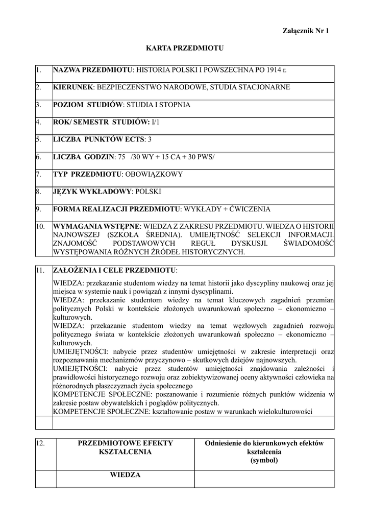 Załącznik Nr 1 KARTA PRZEDMIOTU 1. NAZWA PRZEDMIOTU: HISTORIA POLSKI I POWSZECHNA PO 1914 r. 2. KIERUNEK: BEZPIECZEŃSTWO NARODOWE, STUDIA STACJONARNE 3. POZIOM STUDIÓW: STUDIA I STOPNIA 4. ROK/ SEMESTR STUDIÓW: I/1 5. LICZBA PUNKTÓW ECTS: 3 6. LICZBA GODZIN: 75 /30 WY + 15 CA + 30 PWS/ 7. TYP PRZEDMIOTU: OBOWIĄZKOWY 8. JĘZYK WYKŁADOWY: POLSKI 9. FORMA REALIZACJI PRZEDMIOTU: WYKŁADY + ĆWICZENIA 10. WYMAGANIA WSTĘPNE: WIEDZA Z ZAKRESU PRZEDMIOTU. WIEDZA O HISTORII NAJNOWSZEJ (SZKOŁA ŚREDNIA). UMIEJĘTNOŚĆ SELEKCJI INFORMACJI. ZNAJOMOŚĆ PODSTAWOWYCH REGUŁ DYSKUSJI. ŚWIADOMOŚĆ WYSTĘPOWANIA RÓŻNYCH ŹRÓDEŁ HISTORYCZNYCH. 11. ZAŁOŻENIA I CELE PRZEDMIOTU: WIEDZA: przekazanie studentom wiedzy na temat historii jako dyscypliny naukowej oraz jej miejsca w systemie nauk i powiązań z innymi dyscyplinami. WIEDZA: przekazanie studentom wiedzy na temat kluczowych zagadnień przemian politycznych Polski w kontekście złożonych uwarunkowań społeczno – ekonomiczno – kulturowych. WIEDZA: przekazanie studentom wiedzy na temat węzłowych zagadnień rozwoju politycznego świata w kontekście złożonych uwarunkowań społeczno – ekonomiczno – kulturowych. UMIEJĘTNOŚCI: nabycie przez studentów umiejętności w zakresie interpretacji oraz rozpoznawania mechanizmów przyczynowo – skutkowych dziejów najnowszych. UMIEJĘTNOŚCI: nabycie przez studentów umiejętności znajdowania zależności i prawidłowości historycznego rozwoju oraz zobiektywizowanej oceny aktywności człowieka na różnorodnych płaszczyznach życia społecznego KOMPETENCJE SPOŁECZNE: poszanowanie i rozumienie różnych punktów widzenia w zakresie postaw obywatelskich i poglądów politycznych. KOMPETENCJE SPOŁECZNE: kształtowanie postaw w warunkach wielokulturowości 12. PRZEDMIOTOWE EFEKTY KSZTAŁCENIA WIEDZA Odniesienie do kierunkowych efektów kształcenia (symbol) P_W01 Ma podstawową wiedzę historyczną w zakresie różnorodnych procesów o charakterze społecznym, ekonomicznym i kulturowym towarzyszącym przemianom politycznym w Polsce i na świecie K_W01, K_W04 P_W02 Zna i rozumie mechanizmy przyczynowo – K_W01, K_W04 skutkowe układu sił politycznych i towarzyszące im przeobrażenia ustrojowe czasów najnowszych P_W03 Ma wiedzę w zakresie genezy i funkcjonowania różnorodnych systemów ustrojowych w czasach najnowszych K_W01, K_W04 UMIEJĘTNOŚCI P_U01 Potrafi interpretować i dostrzegać wydarzenia K_W01, K_W04 polityczne w aspekcie wielowymiarowych uwarunkowań o charakterze społecznym, gospodarczym czy kulturowym. P_U02 Umie wskazać i ocenić najważniejsze osiągnięcia i porażki cywilizacyjne na przestrzeni najnowszych dziejów aktywności człowieka K_W01, K_W04 KOMPETENCJE SPOŁECZNE P_K01 Jest przygotowany do kreatywnego zaangażowania społecznego, uznaje i szanuje różne punkty widzenia, jest świadomy znaczenia dziedzictwa kulturowego. 13. K_W01, K_W04 METODY OCENY EFEKTÓW KSZTAŁCENIA Symbol przedmiotowego efektu kształcenia Metody (sposoby) oceny Typ oceny Forma dokumentacji P_W01, P_W02, P_W03, P_U01, P_U02, P_K01, W ramach wykładu: końcowe zaliczenie pisemne Podsumowująca P_W01, P_W02, P_W03, P_U01, P_U02, P_K01, W ramach ćwiczeń: końcowe zaliczenie pisemne, kontrola obecności, aktywność Ocena formująca Protokół, lista obecności Protokół, zestaw pytań. 14. KRYTERIA OCENY OSIĄGNIĘTYCH EFEKTÓW KSZTAŁCENIA Kryterium jakościowo - opisowe Ocena Kryteria jakościowo - opisowe oceny osiągniętych efektów kształcenia 2 (ndst) Student nie opanował treści programowych przedmiotu i nie zrealizował zakładanych przedmiotowych efektów kształcenia. Nie rozumie podstawowych kategorii ani pojęć. Nie jest w stanie wyjaśnić istoty i przyczyn podstawowych dla przedmiotu zjawisk i procesów. Nie potrafi wykorzystać ich do analizy omawianych zagadnień, nie podejmuje także dyskusji na temat ich miejsca i roli w kontekście specyfiki przedmiotu. 3 (dost) Student opanował podstawowe treści programowe przedmiotu oraz zrealizował w niewielkim zakresie zakładane przedmiotowe efekty kształcenia. Poprawnie definiuje, przynajmniej na jeden z możliwych sposobów, podstawowe kategorie i pojęcia oraz potrafi je wykorzystać do analizy omawianych zjawisk i procesów. Potrafi podać różnicę między nimi, wyjaśnić przyczynę najważniejszych zjawisk. Wykazuje małe zainteresowanie problematyką analizowaną w ramach przedmiotu. Nie podejmuje dyskusji na omawiane tematy. 3+(dost+) Student opanował treści programowe przedmiotu oraz zrealizował zakładane przedmiotowe efekty kształcenia na poziomie poprawnym. Definiuje podstawowe kategorie i pojęcia oraz najważniejsze ujęcia teoretyczne. Umie dostrzec złożoność relacji między nimi, nie potrafi jednak wytłumaczyć ich pochodzenia. Potrafi poprawnie zastosować tę wiedzę do analizy omawianych zagadnień. Wykazuje rosnące zainteresowanie problematyką analizowaną w ramach przedmiotu, włącza się do dyskusji na ten temat. 4 (db) Student opanował treści programowe przedmiotu oraz zrealizował zakładane przedmiotowe efekty kształcenia. Definiuje kategorie, pojęcia oraz ujęcia teoretyczne, umie dostrzec złożoność relacji między nimi, potrafi wytłumaczyć ich pochodzenie i różnice, zastosować tę wiedzę do analizy omawianych zagadnień. Wykazuje stałe zainteresowanie omawianą problematyką, inicjuje dyskusje w zakresie podejmowanej tematyki. Wykazuje zrozumienie dla innych niż własne poglądów, podejmuje dyskusje na ich temat. 4+ (db+) Student opanował treści programowe przedmiotu oraz zrealizował zakładane przedmiotowe efekty kształcenia. Swobodnie definiuje i posługuje się kategoriami, pojęciami oraz ujęciami teoretycznymi. Potrafi dyskutować o złożoności relacji między nimi, odwołując się do ich pochodzenia i różnic, nie ma problemów z zastosowaniem tej wiedzy do analizy omawianych zagadnień. Dostrzega wielość poglądów na omawiane zag