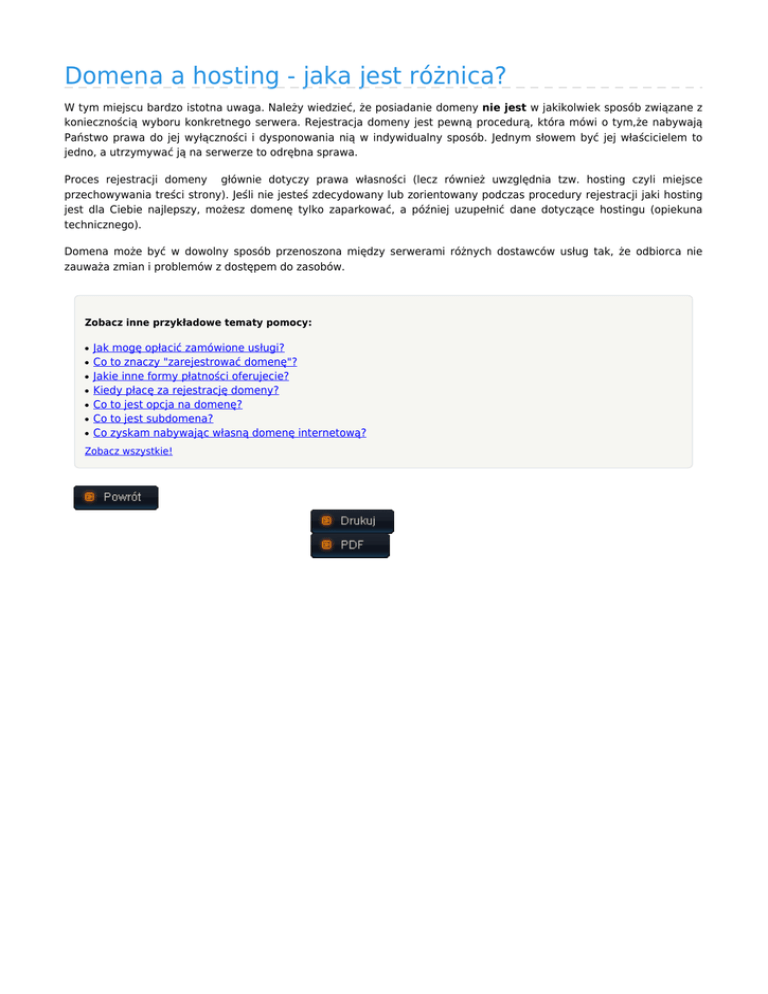 Domena a hosting - jaka jest różnica? W tym miejscu bardzo istotna uwaga. Należy wiedzieć, że posiadanie domeny nie jest w jakikolwiek sposób związane z koniecznością wyboru konkretnego serwera. Rejestracja domeny jest pewną procedurą, która mówi o tym,że nabywają Państwo prawa do jej wyłączności i dysponowania nią w indywidualny sposób. Jednym słowem być jej właścicielem to jedno, a utrzymywać ją na serwerze to odrębna sprawa. Proces rejestracji domeny głównie dotyczy prawa własności (lecz również uwzględnia tzw. hosting czyli miejsce przechowywania treści strony). Jeśli nie jesteś zdecydowany lub zorientowany podczas procedury rejestracji jaki hosting jest dla Ciebie najlepszy, możesz domenę tylko zaparkować, a później uzupełnić dane dotyczące hostingu (opiekuna technicznego). Domena może być w dowolny sposób przenoszona między serwerami różnych dostawców usług tak, że odbiorca nie zauważa zmian i problemów z dostępem do zasobów. Zobacz inne przykładowe tematy pomocy: ● ● ● ● ● ● ● Jak mogę opłacić zamówione usługi? Co to znaczy "zarejestrować domenę"? Jakie inne formy płatności oferujecie? Kiedy płacę za rejestrację domeny? Co to jest opcja na domenę? Co to jest subdomena? Co zyskam nabywając własną domenę internetową? Zobacz wszystkie!