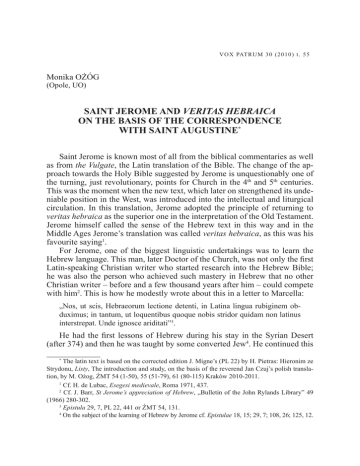 V O X PAT R U M 3 0 ( 2 0 1 0 ) t . 5 5 Monika OŻÓG (Opole, UO) SAINT JEROME AND VERITAS HEBRAICA ON THE BASIS OF THE CORRESPONDENCE WITH SAINT AUGUSTINE* Saint Jerome is known most of all from the biblical commentaries as well as from the Vulgate, the Latin translation of the Bible. The change of the approach towards the Holy Bible suggested by Jerome is unquestionably one of the turning, just revolutionary, points for Church in the 4th and 5th centuries. This was the moment when the new text, which later on strengthened its undeniable position in the West, was introduced into the intellectual and liturgical circulation. In this translation, Jerome adopted the principle of returning to veritas hebraica as the superior one in the interpretation of the Old Testament. Jerome himself called the sense of the Hebrew text in this way and in the Middle Ages Jerome’s translation was called veritas hebraica, as this was his favourite saying1. For Jerome, one of the biggest linguistic undertakings was to learn the Hebrew language. This man, later Doctor of the Church, was not only the first Latin-speaking Christian writer who started research into the Hebrew Bible; he was also the person who achieved such mastery in Hebrew that no other Christian writer – before and a few thousand years after him – could compete with him2. This is how he modestly wrote about this in a letter to Marcella: „Nos, ut scis, Hebraeorum lectione detenti, in Latina lingua rubiginem obduximus; in tantum, ut loquentibus quoque nobis stridor quidam non latinus interstrepat. Unde ignosce ariditati”3. He had the first lessons of Hebrew during his stay in the Syrian Desert (after 374) and then he was taught by some converted Jew4. He continued this The latin text is based on the corrected edition J. Migne’s (PL 22) by H. Pietras: Hieronim ze Strydonu, Listy, The introduction and study, on the basis of the reverend Jan Czuj’s polish translation, by M. Ożog, ŹMT 54 (1-50), 55 (51-79), 61 (80-115) Kraków 2010-2011. 1 Cf. H. de Lubac, Esegesi medievale, Roma 1971, 437. 2 Cf. J. Barr, St Jerome’s appreciation of Hebrew, „Bulletin of the John Rylands Library” 49 (1966) 280-302. 3 Epistula 29, 7, PL 22, 441 or ŹMT 54, 131. 4 On the subject of the learning of Hebrew by Jerome cf. Epistulae 18, 15; 29, 7; 108, 26; 125, 12. * 512 MONIKA OŻÓG education in Bethlehem under Jew Bar Aninas who is told to have come to teach Jerome at night due to Aninas’ fear of other Jews: „Veni rursum Ierosolymam et Bethleem. Quo labore, quo pretio Baraninam nocturnum habui praeceptorem! Timebat enim Iudaeos, et mihi alterum exhibebat Nicodemum”5. Usually, those lessons were private, not necessarily systematic and we know nothing about his teachers’ pedagogical skills. Moreover, he tried very fervently to enrich his enormous library with the texts written just in this language6. At the turn of the years 383 and 384, Jerome started the biggest work of his life, on which he was working for 20 years. At the end of the 4th century, the Latin translations of the Bible were the works of several dozens of translators and they were very inconsistent and abounding with errors. While being the secretary of Pope Damasus, Jerome – at Pope’s request – prepared a uniform text of the Bible, starting from the Old Testament, in which he corrected the translation, drawing on the original version. This work was probably completed quite fast and this was the first part of the Latin Bible. Like in the case of the translation of the Old Testament – to be discussed later on – there were some objections. A great defender of the old Latin version who was against the Jerome’s corrections of the Old Testament was Ambrosiaster7. For Jerome, like for the majority of the Christians of the first centuries, it was certain that all languages had come from the Hebrew language which was to have been the only language until the construction of the Tower of Babel and by this it was more important than other tongues8. From De viris illustribus 135, written in 393, we learn that until this moment, Jerome had already translated the whole Holy Bible, however, when his tendencies to exaggeration are taken into consideration, we might doubt this9. In the letter written to Lucinus in 398, he claimed that the only part he had yet to translate was the Octateuch10. Taking into account Jerome’s big involvement in the Origenism conflict, we might be rather sure that this translation was completed in the years 405-406 (a few months after Paulla’s death), as emerges from Pope Innocent I’s letter11. 5 Epistula 84, 3, PL 22, 745 or ŹMT 61 (in print); cf. J 3, 1; J.A. Loader, Die Problematik des Begriffes hebraica veritas, „Hervormde Teologiese Studies” 64 (2008) 241. 6 On the subject of quick rewriting of lent books from the synagogue cf. Epistula 36, 1. 7 Cf. H. Vogles, Ambrosiaster und Hieronymus, RBen 66 (1956) 16-19. 8 Cf. Epistula 18, 6, PL 22, 365 or ŹMT 54, 48: „Initium oris et communis eloquii, et hoc omne quod loquimur, Hebraeam linguam, qua vetus Testamentum scriptum est, universa antiquitas tradidit. Postquam vero in fabricatione turris per offensam Dei linguarum diversitas attributa est, tunc sermonis varietas in omnes dispersa est nationes”. 9 Cf. De viris illustribus 135, PL 23, 715-720. 10 Cf. Epistula 71, 5. 11 Cf. Innocentius I, Epistula 6, 7, PL 20, 501-502. SAINT JEROME AND VERITAS HEBRAICA 513 Initially, he was not sure about the principles, according to which he should work. The conviction that the Hebrew original should constitute the basis for translation continually grew in him. For some time, he was neither ready nor willing to take up this challenge. His first intention was rather the correction of the accepted version of the Bible based on the Septuagint. And this improvement was to consist in using the tools of text criticism as well as in comparing this text with other Greek versions and the Hebrew original12. Apart fr