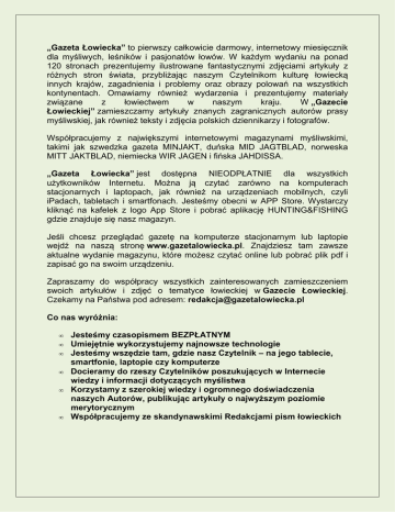 „Gazeta Łowiecka” to pierwszy całkowicie darmowy, internetowy miesięcznik dla myśliwych, leśników i pasjonatów łowów. W każdym wydaniu na ponad 120 stronach prezentujemy ilustrowane fantastycznymi zdjęciami artykuły z różnych stron świata, przybliżając naszym Czytelnikom kulturę łowiecką innych krajów, zagadnienia i problemy oraz obrazy polowań na wszystkich kontynentach. Omawiamy również wydarzenia i prezentujemy materiały związane z łowiectwem w naszym kraju. W „Gazecie Łowieckiej” zamieszczamy artykuły znanych zagranicznych autorów prasy myśliwskiej, jak również teksty i zdjęcia polskich dziennikarzy i fotografów. Współpracujemy z największymi internetowymi magazynami myśliwskimi, takimi jak szwedzka gazeta MINJAKT, duńska MID JAGTBLAD, norweska MITT JAKTBLAD, niemiecka WIR JAGEN i fińska JAHDISSA. „Gazeta Łowiecka” jest dostępna NIEODPŁATNIE dla wszystkich użytkowników Internetu. Można ją czytać zarówno na komputerach stacjonarnych i laptopach, jak również na urządzeniach mobilnych, czyli iPadach, tabletach i smartfonach. Jesteśmy obecni w APP Store. Wystarczy kliknąć na kafelek z logo App Store i pobrać aplikację HUNTING&FISHING gdzie znajduje się nasz magazyn. Jeśli chcesz przeglądać gazetę na komputerze stacjonarnym lub laptopie wejdź na naszą stronę www.gazetalowiecka.pl. Znajdziesz tam zawsze aktualne wydanie magazynu, które możesz czytać online lub pobrać plik pdf i zapisać go na swoim urządzeniu. Zapraszamy do współpracy wszystkich zainteresowanych zamieszczeniem swoich artykułów i zdjęć o tematyce łowieckiej w Gazecie Łowieckiej. Czekamy na Państwa pod adresem: [email protected] Co nas wyróżnia: • • • • • • Jesteśmy czasopismem BEZPŁATNYM Umiejętnie wykorzystujemy najnowsze technologie Jesteśmy wszędzie tam, gdzie nasz Czytelnik – na jego tablecie, smartfonie, laptopie czy komputerze Docieramy do rzeszy Czytelników poszukujących w Internecie wiedzy i informacji dotyczących myślistwa Korzystamy z szerokiej wiedzy i ogromnego doświadczenia naszych Autorów, publikując artykuły o najwyższym poziomie merytorycznym Współpracujemy ze skandynawskimi Redakcjami pism łowieckich DYSTRYBUCJA, czyli jak nas czytać: „Gazeta Łowiecka” jest dostępna NIEODPŁATNIE dla wszystkich użytkowników Internetu. Można ją oglądać zarówno na komputerach stacjonarnych i laptopach, jak również na urządzeniach mobilnych, czyli iPadach, tabletach i smartfonach. Jesteśmy obecni w APP Store. Na naszej stronie należy kliknąć w kafelek APP STORE i pobrań na swój Ipad aplikację HUNTING&FISHING Jeśli chcesz nas czytać na komputerze stacjonarnym lub laptopie, wejdź na naszą stronę www.gazetalowiecka.pl . Znajdziesz tam zawsze aktualne wydanie gazety, które możesz czytać lub pobrać plik pdf i zapisać go na swoim urządzeniu. Nasze wydania znajdziesz również na darmowym portalu issue.com Jeśli posiadasz urządzenie mobile z systemem IOS po prostu pobierz aplikację. Dzięki temu wszystkie pobrane wydania „Gazety Łowieckiej” będziesz miał zawsze pod ręką. Można je czytać w miejscach bez dostępu do Internetu. Strona internetowa i Gazeta dostosowują się do rodzaju urządzenia, rekomendujemy jednak, aby czytać „Gazetę Łowiecką” na tabletach, laptopach lub komputerach stacjonarnych. Naszym zarejestrowanym na stronie www.gazetalowiecka.pl Czytelnikom wysyłamy powiadomienie o ukazaniu się nowego wydania Gazety, a także informacje i aktualności. Każdy Czytelnik może zapisać wybrane lub wszystkie wydania w pamięci swojego urządzenia i wracać do nich w dowolnej chwili. Niezależnie od momentu, kiedy zaczniemy czytać „Gazetę Łowiecką”, mamy dostęp do wszystkich wydań, począwszy od pierwszego numeru. Jesteśmy wszędzie tam, gdzie nasz Czytelnik. Każdy numer „Gazety Łowieckiej” możesz pobrać i przeczytać kiedy tylko i na czym tylko zechcesz.
