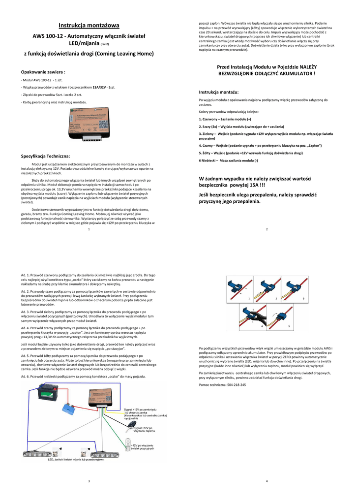 Instrukcja montażowa AWS 100-12 - Automatyczny włącznik świateł LED/mijania (rev.2) z funkcją doświetlania drogi (Coming Leaving Home) pozycji zapłon. Wówczas światła nie będą włączały się po uruchomieniu silnika. Podanie impulsu + na przewód wyzwalający (żółty) spowoduje włączenie wykorzystanych świateł na czas 20 sekund, wystarczający na dojście do celu. Impuls wyzwalający może pochodzić z kierunkowskazu, świateł drogowych (poprzez ich chwilowe włączenie) lub centralki centralnego zamka (jest wtedy możliwość wyboru czy doświetlanie włączy się przy zamykaniu czy przy otwarciu auta). Doświetlanie działa tylko przy wyłączonym zapłonie (brak napięcia na czarnym przewodzie). Przed Instalacją Modułu w Pojeździe NALEŻY BEZWZGLĘDNIE ODŁĄCZYĆ AKUMULATOR ! Opakowanie zawiera : - Moduł AWS 100-12 - 1 szt. - Wiązkę przewodów z wtykiem i bezpiecznikiem 15A/32V - 1szt. Instrukcja montażu: - Złączki do przewodów 5szt. i oczka 2 szt. Po wyjęciu modułu z opakowania najpierw podłączamy wiązkę przewodów załączoną do zestawu. - Kartę gwarancyjną oraz instrukcję montażu. Kolory przewodów odpowiadają kolejno: 1. Czerwony – Zasilanie modułu (+) 2. Szary (2x) – Wyjścia modułu (zwierające do + zasilania) 3. Zielony – Wejście (podanie sygnału +12V wyłącza wyjścia modułu np. włączając światła pozycyjne) 4. Czarny – Wejście (podanie sygnału + po przekręceniu kluczyka na poz. „Zapłon”) 5. Żółty – Wejście (podanie +12V wyzwala funkcję doświetlania drogi) Specyfikacja Techniczna: 6 Niebieski – Masa zasilania modułu (-) Moduł jest urządzeniem elektronicznym przystosowanym do montażu w autach z instalacją elektryczną 12V. Posiada dwa oddzielne kanały sterujące/wykonawcze oparte na niezależnych przekaźnikach. Służy do automatycznego włączania świateł lub innych urządzeń zewnętrznych po odpaleniu silnika. Moduł dokonuje pomiaru napięcia w instalacji samochodu i po przekroczeniu progu ok. 13,3V uruchamia wewnętrzne przekaźniki podające +zasilania na obydwa wyjścia modułu (szare). Wyłączenie zapłonu lub włączenie świateł pozycyjnych (postojowych) powoduje zanik napięcia na wyjściach modułu (wyłączenie sterowanych świateł). W żadnym wypadku nie należy zwiększać wartości bezpiecznika powyżej 15A !!! Jeśli bezpiecznik ulega przepaleniu, należy sprawdzić przyczynę jego przepalenia. Dodatkowo sterownik wyposażony jest w funkcję doświetlania drogi do/z domu, garażu, bramy tzw. Funkcja Coming Leaving Home. Można jej również używać jako podstawową funkcjonalność sterownika. Wystarczy połączyć ze sobą przewody czarny z zielonym i podłączyć wspólnie w miejsce gdzie pojawia się +12V po przekręceniu kluczyka w 1 2 Ad. 1. Przewód czerwony podłączamy do zasilania (+) możliwie najbliżej jego źródła. Do tego celu najlepiej użyć konektora typu „oczko” który zaciskamy na końcu przewodu a następnie nakładamy na śrubę przy klemie akumulatora i dokręcamy nakrętką. Ad. 2. Przewody szare podłączamy za pomocą łączników zawartych w zestawie odpowiednio do przewodów zasilających prawą i lewą żarówkę wybranych świateł. Przy podłączeniu bezpośrednio do świateł mijania lub odbiorników o znacznym poborze prądu zalecane jest lutowanie przewodów. Ad. 3. Przewód zielony podłączamy za pomocą łącznika do przewodu podającego + po włączeniu świateł pozycyjnych (postojowych). Umożliwia to wyłączenie wyjść modułu i tym samym wyłączenie włączonych przez moduł świateł. Ad. 4. Przewód czarny podłączamy za pomocą łącznika do przewodu podającego + po przekręceniu kluczyka w pozycję „zapłon”. Jest on konieczny oprócz wzrostu napięcia powyżej progu 13,3V do automatycznego załączenia przekaźników wyjściowych. Jeśli moduł będzie używany tylko jako doświetlanie drogi, przewód ten należy połączyć wraz z przewodem zielonym w miejsce pojawienia się napięcia „po stacyjce”. Ad. 5. Przewód żółty podłączamy za pomocą łącznika do przewodu podającego + po zamknięciu lub otwarciu auta. Może to być kierunkowskaz (mruganie przy zamknięciu lub otwarciu), chwilowe włączenie świateł drogowych lub bezpośrednio do centralki centralnego zamka. Jeśli funkcja nie będzie używana przewód można odpiąć z wiązki. Ad. 6. Przewód niebieski podłączamy za pomocą konektora „oczko” do masy pojazdu. Po podłączeniu wszystkich przewodów wtyk wiązki umieszczamy w gnieździe modułu AWS i podłączamy odłączony uprzednio akumulator. Przy prawidłowym podpięciu przewodów po odpaleniu silnika i ustawieniu włącznika świateł w pozycji ZERO powinny automatycznie uruchomić się wybrane światła (LED, mijania lub dowolne inne). Po przełączeniu na światła pozycyjne (każde inne również) lub wyłączeniu zapłonu, moduł powinien się wyłączyć. Po zamknięciu/otwarciu centralnego zamka lub chwilowym włączeniu świateł drogowych, przy wyłączonym silniku, powinna zadziałać funkcja doświetlania drogi. Pomoc techniczna: 504-218-245 3 4