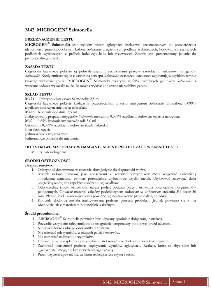 M42 MICROGEN® Salmonella PRZEZNACZENIE TESTU ® MICROGEN Salmonella jest szybkim testem aglutynacji lateksowej przeznaczonym do potwierdzenia identyfikacji prawdopodobnych kolonii Salmonella z agarowych podłoŜy wybiórczych, hodowanych na stałych podłoŜach wybiórczych z próbek ludzkiego kału lub z Ŝywności. Zestaw jest przeznaczony jedynie do profesjonalnego uŜytku. ZASADA TESTU Cząsteczki lateksowe pokryte są poliwalentnymi przeciwciałami przeciw szerokiemu zakresowi antygenów Salmonella. Kiedy zmiesza się je z zawiesiną szczepu Salmonella, cząsteczki lateksowe aglutynują w szybkim tempie tworząc widoczne grudki. MICROGEN® Salmonella wykrywa > 99% ruchliwych gatunków Salmonella, a wczesne badania wykazały takŜe, Ŝe moŜna wykryć konkretne nieruchliwe gatunki. SKŁAD TESTU M42a Odczynnik lateksowy Salmonella: 2,5 ml Cząsteczki lateksowe pokryte króliczymi przeciwciałami przeciw antygenom Salmonella. Utrwalone 0,099% azydkiem sodowym (niebieska nakrętka). M42b Kontrola dodatnia: 2,5 ml Inaktywowany preparat antygenów Salmonella utrwalony 0,099% azydkiem sodowym (czarna nakrętka). M40 0,85% izotoniczny roztwór soli: 5,0 ml Utrwalony 0,099% azydkiem sodowym (biała nakrętka). Instrukcja uŜycia Jednorazowe karty reakcyjne Jednorazowe patyczki do mieszania DODATKOWE MATERIAŁY WYMAGANE, ALE NIE WCHODZĄCE W SKŁAD TESTU • ezy bateriologiczne ŚRODKI OSTROśNOŚCI Bezpieczeństwo: 1. Odczynniki dostarczone w zestawie słuŜą jedynie do diagnostyki in vitro. 2. Azydek sodowy uŜywany jako konserwant w zestawie odczynników moŜe reagować z ołowianą i miedzianą armaturą, tworząc potencjalnie wybuchowe azydki metali. Utylizować zalewając duŜą objętością wody, aby zapobiec osadzaniu się azydków. 3. Odpowiednie środki ostroŜności naleŜy podjąć podczas pracy i usuwania potencjalnych organizmów patogennych. OdkaŜać materiał zakaźny podchlorynem sodowym w końcowym stęŜeniu 3% przez 30 min. Płynne ścieki zawierające kwas powinno się neutralizować przed dalszą obróbką. 4. Kontrola dodatnia została inaktywowana podczas procesu produkcji. Jednak powinno się z nią obchodzić jak z materiałem potencjalnie zakaźnym. Środki proceduralne: ® 1. MICROGEN Salmonella powinien być uŜywany zgodnie z dołączoną instrukcją. 2. Pozwolić wszystkim odczynnikom na osiągnięcie temperatury pokojowej przed uŜyciem. 3. Nie rozcieńczać Ŝadnego odczynnika z zestawu. 4. Nie mieszać odczynników z róŜnych partii i zestawów. 5. Nie zamraŜać Ŝadnych odczynników. 6. UwaŜać, Ŝeby zakraplacz z odczynnikiem lateksowym nie dotknął próbek bakteryjnych. 7. Zachować ostroŜność podczas zapisywania wyników aglutynacji. Reakcje, które są zbyt silne lub „włókniste” mogą nie być prawdziwą aglutynacją. 8. Przed uŜyciem upewnić się, Ŝe karta reakcyjna jest czysta i sucha. M42 MICROGEN® Salmonella Strona 1 PRZECHOWYWANIE I TERMIN WAśNOŚCI ® MICROGEN Salmonella powinien być przechowywany w temp. 2 - 8°C, kiedy nie jest uŜywany. Zestawu nie naleŜy uŜywać po upływie daty waŜności wydrukowanej na naklejce na kartonie. PRÓBKI Testem MICROGEN™ Salmonella moŜna badać kolonie rosnące na płytkach z agarem wybiórczym. PROCEDURA WYKONAWCZA Kontrola jakości: NaleŜy za kaŜdym razem, kiedy uŜywa się zestaw, wykonać następujące sprawdziany: 1. Kontrola odczynnika: dodać 1 kroplę lateksu MICROGEN Salmonella (M42a) do 1 kropli roztworu soli M40 na tym samym polu na karcie reakcyjnej. Wymieszać i rozprowadzić płyn na całej wewnętrznej powierzchni zaznaczonego pola jednorazowym patyczkiem. Obracać kartę delikatnie przez 2 minuty i obserwować, czy wystąpi aglutynacja. JeŜeli widać jakąkolwiek aglutynację, albo lateks, albo sól fizjologiczna są zanieczyszczone i powinny być wyrzucone. 2. Kontrola dodatnia: dodać jedną kroplę kontroli dodatniej (M42b) do 1 pola karty reakcyjnej. Dodać 1 kroplę lateksu MICROGEN Salmonella (M42a) na to samo pole i wymieszać. Nie pozwolić, Ŝeby zakraplacz od lateksu dotknął kontrolę dodatnią. Obracać delikatnie kartę. Po 2 minutach powinna być widoczna aglutynacja, wskazująca na wynik dodatni. JeŜeli nie widać aglutynacji, powinno się uŜyć świeŜy zestaw. Sposób wykonania testu: 1. Nanieść 1 kroplę soli fizjologicznej (M40) na pole reakcyjne na karcie reakcyjnej. 2. Przy pomocy ezy pobrać kolonię z wybiórczej płytki agarowej i zawiesić w kropli soli na karcie reakcyjnej, aby otrzymać gęstą, jednorodną zawiesinę. Zawiesinę powinno się wykonywać jedynie z kolonii, których morfologia przypomina Salmonella spp. 3. Obracać delikatnie kartę przez 2 minuty i obserwować, czy zachodzi aglutynacja lub wykłaczanie. JeŜeli zawiesina pozostaje jednorodna, przejść do punktu 4 (zob. Ograniczenia Testu punkt 1). JeŜeli zawiesina jest „włóknista” lub „ziarnista”, próbki nie moŜna badać testem MICROGEN Salmonella, poniewaŜ moŜe on dawać fałszywie dodatnią aglutynację, kiedy doda się lateks. W tym przypadku naleŜy uŜyć alternatywna metodę badawczą. 4. Wymieszać lateks MICROGEN Salmonella przez delikatne odwracanie buteleczki i dodać 1 kroplę obok zawiesiny bakteryjnej. Nie pozwolić, Ŝeby zakraplacz z lateksem dotknął zawiesinę bakteryjną. 5. Wymieszać zawiesinę czystym patyczkiem i obrócić delikatnie kartę 2 lub 3 razy. Nadmierne obracanie karty nie jest konieczne. Obserwować oznaki aglutynacji podczas maksymalnie 2 minut. 6. Po odczytaniu wyrzucić uŜyte karty i patyczki do mieszania do odpowiedniego środka dezynfekcyjnego. INTERPRETACJA WYNIKÓW Aglutynacja w ciągu 2 minut jest wynikiem dodatnim i wskazuje na obecność Salmonella w próbce. Brak aglutynacji wskazuje, Ŝe Salmonella jest nieobecna w badanym posiewie. OGRANICZENIA TESTU 1. Wyniki powinny być interpretowane w połączeniu ze wszystkimi dostępnymi informacjami klinicznymi i laboratoryjnym. 2. Wiadomo, Ŝe szorstkie szczepy Sal