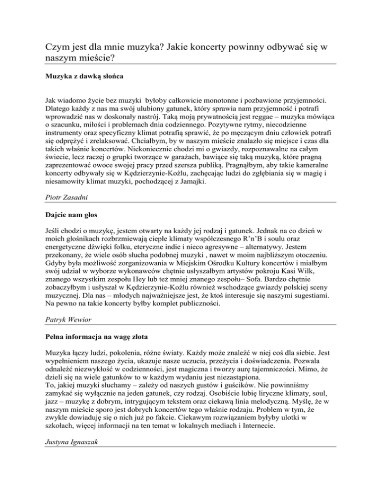 Czym jest dla mnie muzyka? Jakie koncerty powinny odbywać się w naszym mieście? Muzyka z dawką słońca Jak wiadomo życie bez muzyki byłoby całkowicie monotonne i pozbawione przyjemności. Dlatego każdy z nas ma swój ulubiony gatunek, który sprawia nam przyjemność i potrafi wprowadzić nas w doskonały nastrój. Taką moją prywatnością jest reggae – muzyka mówiąca o szacunku, miłości i problemach dnia codziennego. Pozytywne rytmy, niecodzienne instrumenty oraz specyficzny klimat potrafią sprawić, że po męczącym dniu człowiek potrafi się odprężyć i zrelaksować. Chciałbym, by w naszym mieście znalazło się miejsce i czas dla takich właśnie koncertów. Niekoniecznie chodzi mi o gwiazdy, rozpoznawalne na całym świecie, lecz raczej o grupki tworzące w garażach, bawiące się taką muzyką, które pragną zaprezentować owoce swojej pracy przed szersza publiką. Pragnąłbym, aby takie kameralne koncerty odbywały się w Kędzierzynie-Koźlu, zachęcając ludzi do zgłębiania się w magię i niesamowity klimat muzyki, pochodzącej z Jamajki. Piotr Zasadni Dajcie nam głos Jeśli chodzi o muzykę, jestem otwarty na każdy jej rodzaj i gatunek. Jednak na co dzień w moich głośnikach rozbrzmiewają ciepłe klimaty współczesnego R’n’B i soulu oraz energetyczne dźwięki folku, eteryczne indie i nieco agresywne – alternatywy. Jestem przekonany, że wiele osób słucha podobnej muzyki , nawet w moim najbliższym otoczeniu. Gdyby była możliwość zorganizowania w Miejskim Ośrodku Kultury koncertów i miałbym swój udział w wyborze wykonawców chętnie usłyszałbym artystów pokroju Kasi Wilk, znanego wszystkim zespołu Hey lub też mniej znanego zespołu– Sofa. Bardzo chętnie zobaczyłbym i usłyszał w Kędzierzynie-Koźlu również wschodzące gwiazdy polskiej sceny muzycznej. Dla nas – młodych najważniejsze jest, że ktoś interesuje się naszymi sugestiami. Na pewno na takie koncerty byłby komplet publiczności. Patryk Wewior Pełna informacja na wagę złota Muzyka łączy ludzi, pokolenia, różne światy. Każdy może znaleźć w niej coś dla siebie. Jest wypełnieniem naszego życia, ukazuje nasze uczucia, przeżycia i doświadczenia. Pozwala odnaleźć niezwykłość w codzienności, jest magiczna i tworzy aurę tajemniczości. Mimo, że dzieli się na wiele gatunków to w każdym wydaniu jest niezastąpiona. To, jakiej muzyki słuchamy – zależy od naszych gustów i guścików. Nie powinniśmy zamykać się wyłącznie na jeden gatunek, czy rodzaj. Osobiście lubię liryczne klimaty, soul, jazz – muzykę z dobrym, intrygującym tekstem oraz ciekawą linia melodyczną. Myślę, że w naszym mieście sporo jest dobrych koncertów tego właśnie rodzaju. Problem w tym, że zwykle dowiaduję się o nich już po fakcie. Ciekawym rozwiązaniem byłyby ulotki w szkołach, więcej informacji na ten temat w lokalnych mediach i Internecie. Justyna Ignaszak Nieważny gatunek – ważne przesłanie Idąc ulica widzimy mnóstwo osób ze słuchawkami w uszach, mijamy młodych mieszkańców Kędzierzyna-Koźla, którzy niosą różne instrumenty. Zawsze ciekawiło mnie czego słuchają i co myślą pochłonięci w swoim muzycznym świecie. Muzyka wyzwala w nas najlepsze odczucia, pozwala bardzo często odciąć się od szarej rzeczywistości. Każdy z nas ma swoja ulubioną muzykę , piosenkę, która przywołuje wspomnienia, ma taki utwór, którego już pierwsze dźwięki wywołują smutek lub uśmiech na twarzy. Osobiście słucham wielu gatunków muzyki, można powiedzieć, że z wiekiem zmienia się to paradoksalnie. Od popu przechodziłam do reggae. Potem przyszedł okres punk rocka i metalu. Teraz nie mam jednego, ulubionego gatunku muzycznego. Najbliższa memu sercu jest jednak muzyka rockowa, metal, rock alternatywny i reggae. Musze przyznać, że nawet przekonałam się do hip-hopu. To nieważne, czego się słucha. Każdy z gatunków jest wyjątkowy, każdy ma swoje przesłanie – o tym powinniśmy pamiętać. W Kędzierzynie-Koźlu brakuje właśnie takiej różnorodności , jeśli już pojawia się artysta godny uwagi to takie koncerty są słabo nagłaśniane. Myślę , że nasze miasto powinno dołożyć wszelkich starań, by w muzycznym repertuarze kulturalnym każdy znalazł coś dla siebie. Joanna Rejch