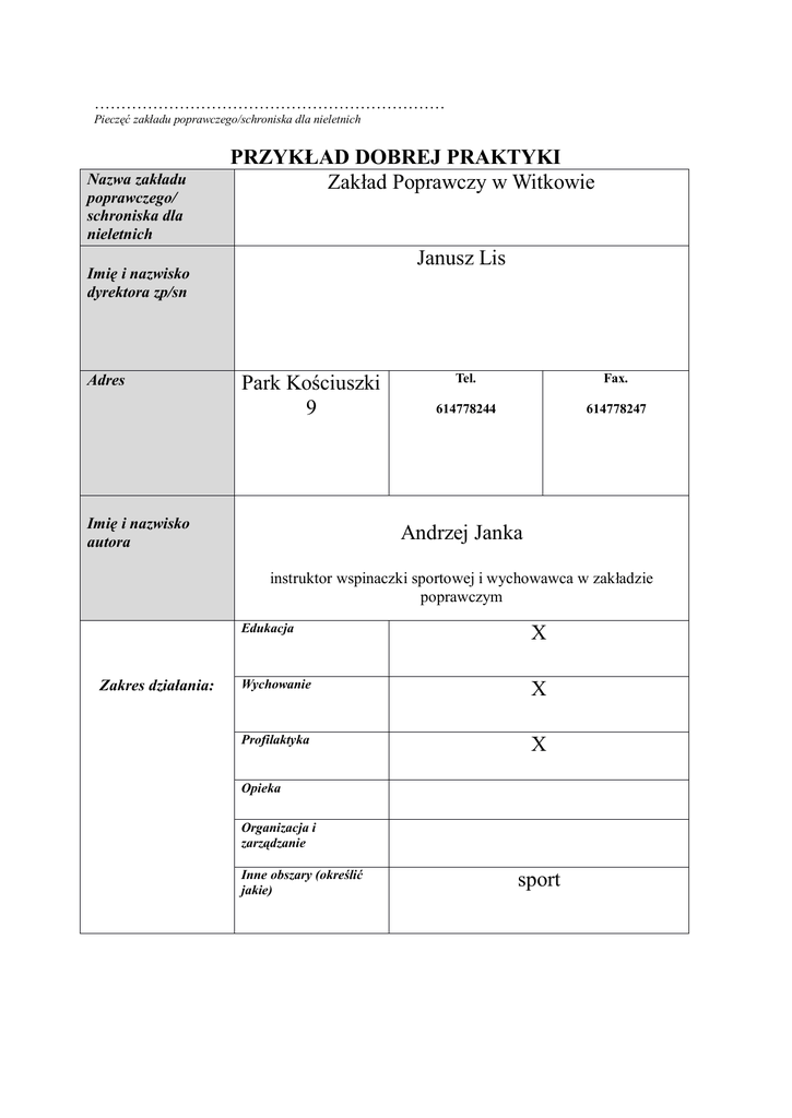 ………………………………………………………… Pieczęć zakładu poprawczego/schroniska dla nieletnich Nazwa zakładu poprawczego/ schroniska dla nieletnich PRZYKŁAD DOBREJ PRAKTYKI Zakład Poprawczy w Witkowie Janusz Lis Imię i nazwisko dyrektora zp/sn Adres Park Kościuszki 9 Imię i nazwisko autora Tel. Fax. 614778244 614778247 Andrzej Janka instruktor wspinaczki sportowej i wychowawca w zakładzie poprawczym Zakres działania: Edukacja X Wychowanie X Profilaktyka X Opieka Organizacja i zarządzanie Inne obszary (określić jakie) sport Temat działania: Propagowanie oraz uprawianie sportów wspinaczkowych i turystyki górskiej w ramach Sekcji Wspinaczkowej ZP Witkowo Liczba uczestników objętych przedsięwzięciem: Około 30 (wychowankowie zakładu) w skali roku oraz kilkadziesiąt osób – zawodników klubów wspinaczkowych i górskich Okres trwania działania: cały rok Cele podejmowanych działań: -propagowanie sportów wspinaczkowych i turystyki górskiej - promocja zdrowego stylu życia, - regularna praca treningowa na sztucznej ścianie wspinaczkowej - organizacja zawodów sportowych oraz obozów wspinaczkowych i turystycznych - propagowanie odpowiedzialnych zachowań w oparciu o kodeks etyki górskiej, - współpraca ze środowiskiem górskim i wspinaczkowym (kluby i sekcje województwa wielkopolskiego) Zwięzły opis realizacji: Zakład Poprawczy w Witkowie jako jedyny w Polsce prowadzi regularne zajęcia sportowe z zakresu wspinaczki sportowej, Przedsięwzięcie realizowane jest w cyklu ciągłym od 2006 roku na własnym obiekcie wspinaczkowym (ścianka wspinaczkowa „Szlifiernia”). W ramach Sekcji Wspinaczkowej prowadzimy treningi, organizujemy zawody wspinaczkowe, na które zapraszamy zawodników z zaprzyjaźnionych klubów górskich, organizujemy obozy sportowe w rejonach skalnych (Jura Krakowsko – Częstochowska, Rudawy Janowickie, Tatry). Organizuje prelekcje i spotkania z „ludźmi gór” - znanymi himalaistami, alpinistami, podróżnikami. Na stałe współpracujemy z Klubem Sportów Górskim „Direta” w Gnieźnie. Naszą drugą specjalnością jest szkoła przetrwania – survival. Zakład Poprawczy jest organizatorem warsztatów szkoły przetrwania oraz Ogólnopolskiego Rajdu „Jesienna Akademia Przygody”, w których uczestniczą reprezentanci zakładów poprawczych, schronisk dla nieletnich i różnych placówek wychowawczych. Dotychczas zostało zorganizowanych 9 edycji. Rajdy odbywały się na Pojezierzu Gnieźnieńskim, Jurze Krakowsko – Częstochowskiej, Rudawach, Janowickich, Karkonoszach, Pojezierzu Drawsko – Pomorskim. Wszelkie działania związane ze sportami ekstremalnymi i outdoorowymi oraz turystyką i survivalem opisujemy na portalu „Strefa sportów ekstremalnych ZP Witkowo” www.wspinanie-witkowo.net Uzyskane efekty: • Propagując sporty ekstremalne pokazujemy młodzieży alternatywne sposoby spędzania wolnego czasu, wyposażamy w pasje, uczymy zasad etyki, którymi kierują się ludzie gór, turyści, alpiniści. Niepisany kodeks honorowy górskiego środowiska oparty jest na wzajemnym zaufaniu i gotowości do niesienia pomocy osobom w niebezpieczeństwie. • Wyposażamy naszych podopiecznych w umiejętności radzenia sobie w trudnych sytuacjach, przezwyciężania własnych słabości. • Współpracujemy ze środowiskiem zewnętrznym, klubami i ciekawymi ludźmi, którzy mogą być wzorami do naśladowania. • Wychowankowie uczą się systematyczności i wytrwałości - warunków do osiągnięcia sukcesów sportowych, a także celów życiowych. Napotkane problemy: Nie zawsze sytuacja wychowawcza bądź ekonomiczna zakładu pozwala na organizację obozów i rajdów. Zdarza się, że też, że z tych samych powodów zainteresowanie naszymi działaniami placówek z Polski jest nieduże. Zawsze jednak możemy liczyć na stałych bywalców naszych imprez. Zawsze też możemy liczyć na zrozumienie i wsparcie naszych współpracowników (koledzy z Klubu Sportów Górskich „Direta”). Wnioski z realizacji i plany na przyszłość: Działania, które podejmujemy są już tradycją w naszej placówce, dlatego warto je kontynuować w przyszłości. Cieszą się sporym zainteresowaniem podopiecznych. A to daje nam większą możliwość oddziaływań wychowawczych. W przyszłości będziemy kierować ofertę do większej liczby placówek. Dysponujemy odpowiednią bazą oraz kadrą do realizacji naszych przedsięwzięć. Materiały, które mogą być potrzebne do prawidłowej realizacji usprawnienia np. wzory dokumentów i formularzy, schematy, programy szkoleń, materiały multimedialne itd. • • • Obiekt ścianka wspinaczkowa „Szlifiernia” w ZP Witkowo sprzęt i wyposażenie specjalistyczne do wspinaczki i asekuracji urządzenia multimedialne do prowadzenia prelekcji Link do strony, na której znajdują się dodatkowe informacje o realizacji przedsięwzięcia w placówce oraz prezentacja dobrej praktyki – WWW.zp/sdn: www.zpwitkowo.pl oraz www.wspinanie-witkowo.net Wyrażam zgodę na zamieszczenie na stronie internetowej Ministra Sprawiedliwości informacji na temat przedstawionego przykładu dobrej praktyki. ……….................................... . Miejscowość, data nieletnich ...…... ……..………………………………………………………… Podpis dyrektora zakładu poprawczego/schroniska dla UWAGA! Ministerstwo Sprawiedliwości zastrzega sobie prawo do zamieszczenia na stronie internetowej urzędu tylko wybranych przykładów dobrej praktyki.