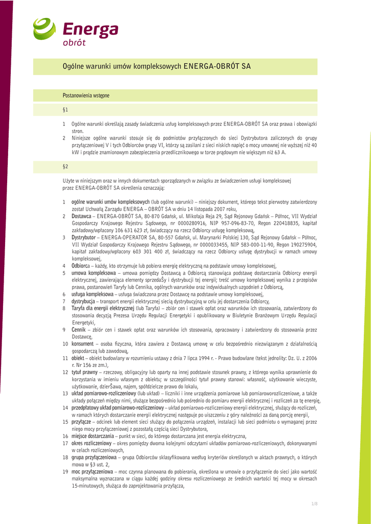 Ogólne warunki umów kompleksowych ENERGA-OBRÓT SA Postanowienia wstępne §1 1 2 Ogólne warunki określają zasady świadczenia usług kompleksowych przez ENERGA-OBRÓT SA oraz prawa i obowiązki stron. Niniejsze ogólne warunki stosuje się do podmiotów przyłączonych do sieci Dystrybutora zaliczonych do grupy przyłączeniowej V i tych Odbiorców grupy VI, którzy są zasilani z sieci niskich napięć o mocy umownej nie wyższej niż 40 kW i prądzie znamionowym zabezpieczenia przedlicznikowego w torze prądowym nie większym niż 63 A. §2 Użyte w niniejszym oraz w innych dokumentach sporządzanych w związku ze świadczeniem usługi kompleksowej przez ENERGA-OBRÓT SA określenia oznaczają: 1 2 3 4 5 6 7 8 9 10 11 12 13 14 15 16 17 18 19 ogólne warunki umów kompleksowych (lub ogólne warunki) – niniejszy dokument, którego tekst pierwotny zatwierdzony został Uchwałą Zarządu ENERGA – OBRÓT SA w dniu 14 listopada 2007 roku, Dostawca – ENERGA-OBRÓT SA, 80-870 Gdańsk, ul. Mikołaja Reja 29, Sąd Rejonowy Gdańsk – Północ, VII Wydział Gospodarczy Krajowego Rejestru Sądowego, nr 0000280916, NIP 957-096-83-70, Regon 220418835, kapitał zakładowy/wpłacony 106 631 623 zł, świadczący na rzecz Odbiorcy usługę kompleksową, Dystrybutor – ENERGA-OPERATOR SA, 80-557 Gdańsk, ul. Marynarki Polskiej 130, Sąd Rejonowy Gdańsk – Północ, VII Wydział Gospodarczy Krajowego Rejestru Sądowego, nr 0000033455, NIP 583-000-11-90, Regon 190275904, kapitał zakładowy/wpłacony 603 301 400 zł, świadczący na rzecz Odbiorcy usługę dystrybucji w ramach umowy kompleksowej, Odbiorca – każdy, kto otrzymuje lub pobiera energię elektryczną na podstawie umowy kompleksowej, umowa kompleksowa – umowa pomiędzy Dostawcą a Odbiorcą stanowiąca podstawę dostarczania Odbiorcy energii elektrycznej, zawierająca elementy sprzedaŜy i dystrybucji tej energii; treść umowy kompleksowej wynika z przepisów prawa, postanowień Taryfy lub Cennika, ogólnych warunków oraz indywidualnych uzgodnień z Odbiorcą, usługa kompleksowa – usługa świadczona przez Dostawcę na podstawie umowy kompleksowej, dystrybucja – transport energii elektrycznej siecią dystrybucyjną w celu jej dostarczenia Odbiorcy, Taryfa dla energii elektrycznej (lub Taryfa) – zbiór cen i stawek opłat oraz warunków ich stosowania, zatwierdzony do stosowania decyzją Prezesa Urzędu Regulacji Energetyki i opublikowany w Biuletynie Branżowym Urzędu Regulacji Energetyki, Cennik – zbiór cen i stawek opłat oraz warunków ich stosowania, opracowany i zatwierdzony do stosowania przez Dostawcę, konsument – osoba fizyczna, która zawiera z Dostawcą umowę w celu bezpośrednio niezwiązanym z działalnością gospodarczą lub zawodową, obiekt – obiekt budowlany w rozumieniu ustawy z dnia 7 lipca 1994 r. - Prawo budowlane (tekst jednolity: Dz. U. z 2006 r. Nr 156 ze zm.), tytuł prawny – rzeczowy, obligacyjny lub oparty na innej podstawie stosunek prawny, z którego wynika uprawnienie do korzystania w imieniu własnym z obiektu; w szczególności tytuł prawny stanowi: własność, użytkowanie wieczyste, użytkowanie, dzierŜawa, najem, spółdzielcze prawo do lokalu, układ pomiarowo-rozliczeniowy (lub układ) – liczniki i inne urządzenia pomiarowe lub pomiaroworozliczeniowe, a także układy połączeń między nimi, służące bezpośrednio lub pośrednio do pomiaru energii elektrycznej i rozliczeń za tę energię, przedpłatowy układ pomiarowo-rozliczeniowy – układ pomiarowo-rozliczeniowy energii elektrycznej, służący do rozliczeń, w ramach których dostarczanie energii elektrycznej następuje po uiszczeniu z góry należności za daną porcję energii, przyłącze – odcinek lub element sieci służący do połączenia urządzeń, instalacji lub sieci podmiotu o wymaganej przez niego mocy przyłączeniowej z pozostałą częścią sieci Dystrybutora, miejsce dostarczania – punkt w sieci, do którego dostarczana jest energia elektryczna, okres rozliczeniowy – okres pomiędzy dwoma kolejnymi odczytami układów pomiarowo-rozliczeniowych, dokonywanymi w celach rozliczeniowych, grupa przyłączeniowa – grupa Odbiorców sklasyfikowana według kryteriów określonych w aktach prawnych, o których mowa w §3 ust. 2, moc przyłączeniowa – moc czynna planowana do pobierania, określona w umowie o przyłączenie do sieci jako wartość maksymalna wyznaczana w ciągu każdej godziny okresu rozliczeniowego ze średnich wartości tej mocy w okresach 15-minutowych, służąca do zaprojektowania przyłącza, 1/8 20 grupa taryfowa – grupa Odbiorców, dla których stosuje się jeden zestaw cen lub stawek opłat i warunków ich stosowania, sklasyfikowana według kryteriów określonych w Taryfie lub Cenniku, 21 moc umowna – moc czynna pobierana, określona umownie, wyznaczana w ciągu każdej godziny okresu rozliczeniowego ze średnich wartości tej mocy rejestrowanych w okresach 15-minutowych, 22 BOK (Biuro Obsługi Klienta) – powszechnie dostępny lokal przeznaczony do stałej obsługi świadczonej przez przedstawicieli Dostawcy na rzecz Odbiorców w zakresie wynikającym z ogólnych warunków i z informacji publikowanych przez Dostawcę, 23 nielegalne pobieranie energii – pobieranie energii bez zawarcia umowy, z całkowitym albo częściowym pominięciem układu pomiarowo-rozliczeniowego lub poprzez ingerencję w ten układ mającą wpływ na zafałszowanie pomiarów dokonywanych przez układ pomiarowo-rozliczeniowy, 24 przedstawiciel Dostawcy – osoba upoważniona przez Dostawcę do wykonywania obowiązków i czynności związanych ze świadczeniem usługi kompleksowej, 25 przedstawiciel Dystrybutora – osoba upoważniona przez Dystrybutora do wykonywania obowiązków i czynności związanych ze świadczeniem usługi kompleksowej. §3 1 2 Do świadczonej usługi kompleksowej stosuje się postanowienia umowy kompleksowej, ogólnych warunków oraz Taryfy lub Cennika. W 