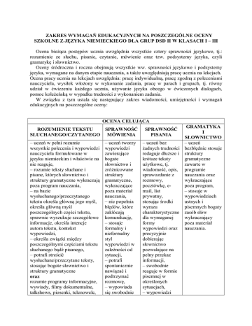ZAKRES WYMAGAŃ EDUKACYJNYCH NA POSZCZEGÓLNE OCENY SZKOLNE Z JĘZYKA NIEMIECKIEGO DLA GRUP DSD II W KLASACH I – III Ocena bieżąca postępów ucznia uwzględnia wszystkie cztery sprawności językowe, tj.: rozumienie ze słuchu, pisanie, czytanie, mówienie oraz tzw. podsystemy języka, czyli gramatykę i słownictwo. Oceny śródroczna i roczna obejmują wszystkie ww. sprawności językowe i podsystemy języka, wymagane na danym etapie nauczania, a także uwzględniają pracę ucznia na lekcjach. Ocena pracy ucznia na lekcjach uwzględnia: pracę indywidualną, pracę zgodną z poleceniami nauczyciela, wysiłek włożony w wykonanie zadania, pracę w parach i grupach, tj. równy udział w ćwiczeniu każdego ucznia, używanie języka obcego w ćwiczonych dialogach, pomoc koleżeńską w wypadku trudności z wykonaniem zadania. W związku z tym ustala się następujący zakres wiadomości, umiejętności i wymagań edukacyjnych na poszczególne oceny: OCENA CELUJĄCA ROZUMIENIE TEKSTU SPRAWNOŚĆ SŁUCHANEGO/CZYTANEGO MÓWIENIA – uczeń w pełni rozumie wszystkie polecenia i wypowiedzi nauczyciela formułowane w języku niemieckim i właściwie na nie reaguje, – rozumie teksty słuchane i pisane, których słownictwo i struktury gramatyczne wykraczają poza program nauczania, – na bazie wysłuchanego/przeczytanego tekstu określa główną jego myśl, określa główną myśl poszczególnych części tekstu, sprawnie wyszukuje szczegółowe informacje, określa intencje autora tekstu, kontekst wypowiedzi, – określa związki między poszczególnymi częściami tekstu słuchanego bądź pisanego, – potrafi streścić wysłuchane/przeczytane teksty, stosując bogate słownictwo i struktury gramatyczne oraz rozumie programy informacyjne, wywiady, filmy dokumentalne, talkshows, piosenki, telenowele, – uczeń tworzy wypowiedzi zawierające bogate słownictwo i zróżnicowane struktury gramatyczne, wykraczające poza materiał nauczania, – nie popełnia błędów, które zakłócają komunikację, – stosuje formalny i nieformalny styl wypowiedzi w zależności od sytuacji, – potrafi spontanicznie nawiązać i podtrzymać rozmowę, – wypowiada się swobodnie GRAMATYKA I SŁOWNICTWO – uczeń bez – uczeń żadnych trudności bezbłędnie stosuje redaguje dłuższe i struktury krótsze teksty gramatyczne użytkowe, tj. zawarte w wiadomość, opis, programie sprawozdanie z nauczania oraz rozmowy, wykraczające pocztówkę, epoza program, mail, list – stosuje w prywatny, wypowiedziach stosując środki ustnych i wyrazu pisemnych bogaty charakterystyczne zasób słów dla wymaganej wykraczający formy poza materiał wypowiedzi oraz nauczania. precyzyjnie dobierając słownictwo pozwalające na pełny przekaz informacji, – swobodnie reaguje w formie pisemnej w określonych sytuacjach, – wypowiedzi SPRAWNOŚĆ PISANIA audiobooki, filmy fabularne, referaty, programy rozrywkowe, wiadomości radiowe, wywiady, filmy dokumentalne, piosenki, telenowele, referaty, reklamy, programy kulinarne, prognozę pogody, reklamy na poziomie C1 i C2. bez przygotowania, – wypowiedzi są płynne, – wypowiedzi są całkowicie poprawne fonetycznie, bez błędów w wymowie i intonacji oraz potrafi budować rozbudowane argumenty, tworzy dłuższe referaty o wyraźnej strukturze, streszcza artykuły prasowe, interpretuje sztuki sceniczne, potrafi wyrażać opinie i brać czynny udział w dyskusji. pisemne są zgodne z tematem, bogate pod względem treści, spójne i logiczne, – wypowiedzi pisemne zawierają słownictwo i struktury gramatyczne wykraczające poza program nauczania, – wypowiedzi pisemne zawierają tylko sporadyczne błędy, które nie wpływają na zrozumienie tekstu, – wypowiedzi pisemne nie zawierają błędów interpunkcyjnych oraz potrafi napisać rozprawkę, opinię, streszczenie, opisuje i interpretuje grafiki, diagramy, potrafi pisemnie argumentować, bezbłędnie przekazuje informacje zawarte w tekście. OCENA BARDZO DOBRA ROZUMIENIE TEKSTU SPRAWNOŚĆ SŁUCHANEGO/CZYTANEGO MÓWIENIA SPRAWNOŚĆ PISANIA GRAMATYKA I SŁOWNICTWO – uczeń rozumie wszystkie polecenia i wypowiedzi nauczyciela formułowane w języku niemieckim i właściwie na nie reaguje, – rozumie teksty słuchane i pisane mniej więcej w 90%, – na bazie wysłuchanego/przeczytanego tekstu określa główną jego myśl, określa główną myśl poszczególnych części tekstu, wyszukuje szczegółowe informacje, określa intencje autora tekstu, określa kontekst wypowiedzi, – określa związki między poszczególnymi częściami tekstu słuchanego bądź pisanego, – potrafi streścić wysłuchane/przeczytane teksty, stosując słownictwo i struktury gramatyczne objęte programem nauczania oraz rozumie wiadomości radiowe, wywiady, filmy dokumentalne, piosenki, telenowele, referaty, reklamy, programy kulinarne, prognozę pogody. – uczeń wypowiada się swobodnie, stosując bogaty zasób słów i struktury gramatyczne zawarte w programie nauczania, – bardzo sporadycznie popełnia błędy, które nie zakłócają komunikacji, – potrafi nawiązać i podtrzymać rozmowę, – wypowiedzi są płynne, – wypowiedzi są poprawne fonetycznie, bez błędów w wymowie i intonacji oraz potrafi budować argumenty, tworzy referaty o wyraźnej strukturze, streszcza artykuły prasowe, potrafi wyrażać opinie i brać czynny udział w dyskusji. – uczeń bez trudności redaguje dłuższe i krótsze teksty użytkowe, tj. wiadomość, opis, sprawozdanie z rozmowy, pocztówkę, email, list prywatny, stosując środki wyrazu charakterystyczne dla wymaganej formy wypowiedzi oraz precyzyjnie dobierając słownictwo pozwalające na pełny przekaz informacji, – swobodnie reaguje w formie pisemnej w określonych sytuacjach, – wypowiedzi pisemne są zgodne z tematem, bogate pod względem treści, spójne i logiczne, – wypowiedzi pisemne zawierają słownictwo i struktury gramatyczne zawarte w programie n