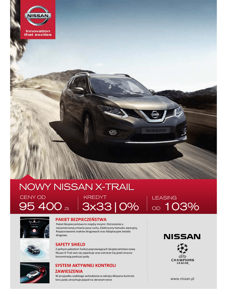 NOWY NISSAN X-TRAIL CENY OD 95 400 KREDYT ZŁ 3x33 | 0% LEASING OD 103% PAKIET BEZPIECZEŃSTWA Pakiet Bezpieczeństwa to między innymi: Ostrzeżenie o niezamierzonej zmianie pasa ruchu, Elektryczny hamulec awaryjny, Rozpoznawanie znaków drogowych oraz Adaptacyjne światła drogowe. SAFETY SHIELD Z pełnym pakietem funkcji poprawiających bezpieczeństwo nowy Nissan X‐Trail sam się zaparkuje oraz ostrzeże Cię jeżeli stracisz koncentrację podczas jazdy. SYSTEM AKTYWNEJ KONTROLI ZAWIESZENIA W przypadku szybkiego wchodzenia w zakręty Aktywna kontrola toru jazdy utrzymuje pojazd na obranym torze www.nissan.pl CENY PROMOCYJNE - PRODUKCJA EURO6 Silniki diesla VISIA ACENTA TEKNA dCi 130 (320 Nm) 5.7 l/100 km 103 900 113 900 136 400 dCi 130 Xtronic (320 Nm) 5.8 l/100 km - 121 900 144 400 dCi 130 All Mode 4x4 i (320 Nm) 6.2 l/100 km - 121 900 144 400 7.9 l/100 km 95 400 105 400 127 900 VISIA ACENTA TEKNA 3 900 - - Silniki benzynowe DIG-T 160 (240 Nm) WYPOSAŻENIE OPCJONALNE Pakiet Bezpieczeństwa Visia Rozpoznawanie znaków drogowych, Elektryczny hamulec awaryjny, Ostrzeżenie o niezamierzonej zmianie pasa ruchu, Czujniki parkowania, Automatycznie ściemniające się lusterko wsteczne Pakiet Bezpieczeństwa Acenta Adaptacyjne światła drogowe, Rozpoznawanie znaków drogowych, Elektryczny hamulec awaryjny, Ostrzeżenie o niezamierzonej zmianie pasa ruchu - 3 500 S NissanConnect + System kamer 360°1 Zintegrowany system nawigacji - 6 000 S Okno dachowe Okno dachowe z filtrem UV oraz elektrycznie regulowaną przesłoną - 3 500 S Pakiet Acenta + System I-Key, Elektrycznie otwierana klapa bagażnika, Relingi dachowe, 19" felgi ze stopów metali lekkich - 5 700 S 6500 4 000 Trzeci rząd siedzeń 4 000 (zawiera okno dachowe) 3 200 Lakier metalizowany NISSAN 5★ Rozszerzona Gwarancja 2 3 do 5 lat lub 150 000 km 5 340 1 - Niektóre zdalne funkcje mogą wymagać zsynchronizowanego telefonu lub urządzenia, ktore nie są na wyposażeniu samochodu. Sieci komórkowe są dostarczane przez operatorów sieci mobilnych i są poza kontrolą Nissana. Informujemy, że system ten umożliwia połączenie z internetem za pomocą telefonu zsynchronizowanego z systemem Bluetooth. Przy korzystaniu z sieci bezprzewodowej zastosowane będzie standardowe minutowe naliczanie. Niektóre z usług mogą być niedostępnie, zgodnie z zasadami obowiązującymi na danym rynku. Pokrycie systemu nawigacji nie jest w pełni zweryfikowane w przypadku dróg lokalnych. W celu uzyskania szczegółowych informacji prosimy kontaktować się z Dealerem firmy Nissan. 2 - 7 miejsc, opcja niedostępna w konfiguracji z silnikiem benzynowym DIG-T 160 3 - Nissan 5★ Rozszerzona Gwarancja Umowa Ubezpieczenia Grupowego jest produktem ubezpieczeniowym; w celu uzyskania bliższych informacji prosimy zapoznać się z broszurą informacyjną oraz Ogólnymi Warunkami Ubezpieczenia dostępnymi u Autoryzowanych Dealerów. CENY PODSTAWOWE - PRODUKCJA EURO6 Silniki diesla VISIA ACENTA TEKNA dCi 130 (320 Nm) 5.7 l/100 km 106 900 116 900 139 400 dCi 130 Xtronic (320 Nm) 5.8 l/100 km - 124 900 147 400 dCi 130 All Mode 4x4 i (320 Nm) 6.2 l/100 km - 124 900 147 400 7.9 l/100 km 98 400 108 400 130 900 VISIA ACENTA TEKNA 3 900 - - Silniki benzynowe DIG-T 160 (240 Nm) WYPOSAŻENIE OPCJONALNE Pakiet Bezpieczeństwa Visia Rozpoznawanie znaków drogowych, Elektryczny hamulec awaryjny, Ostrzeżenie o niezamierzonej zmianie pasa ruchu, Czujniki parkowania, Automatycznie ściemniające się lusterko wsteczne Pakiet Bezpieczeństwa Acenta Adaptacyjne światła drogowe, Rozpoznawanie znaków drogowych, Elektryczny hamulec awaryjny, Ostrzeżenie o niezamierzonej zmianie pasa ruchu - 3 500 S NissanConnect + System kamer 360°1 Zintegrowany system nawigacji - 6 000 S Okno dachowe Okno dachowe z filtrem UV oraz elektrycznie regulowaną przesłoną - 3 500 S Pakiet Acenta + System I-Key, Elektrycznie otwierana klapa bagażnika, Relingi dachowe, 19" felgi ze stopów metali lekkich - 5 700 S 6500 4 000 Trzeci rząd siedzeń 4 000 (zawiera okno dachowe) 3 200 Lakier metalizowany NISSAN 5★ Rozszerzona Gwarancja 2 3 do 5 lat lub 150 000 km 5 340 1 - Niektóre zdalne funkcje mogą wymagać zsynchronizowanego telefonu lub urządzenia, ktore nie są na wyposażeniu samochodu. Sieci komórkowe są dostarczane przez operatorów sieci mobilnych i są poza kontrolą Nissana. Informujemy, że system ten umożliwia połączenie z internetem za pomocą telefonu zsynchronizowanego z systemem Bluetooth. Przy korzystaniu z sieci bezprzewodowej zastosowane będzie standardowe minutowe naliczanie. Niektóre z usług mogą być niedostępnie, zgodnie z zasadami obowiązującymi na danym rynku. Pokrycie systemu nawigacji nie jest w pełni zweryfikowane w przypadku dróg lokalnych. W celu uzyskania szczegółowych informacji prosimy kontaktować się z Dealerem firmy Nissan. 2 - 7 miejsc, opcja niedostępna w konfiguracji z silnikiem benzynowym DIG-T 160 3 - Nissan 5★ Rozszerzona Gwarancja Umowa Ubezpieczenia Grupowego jest produktem ubezpieczeniowym; w celu uzyskania bliższych informacji prosimy zapoznać się z broszurą informacyjną oraz Ogólnymi Warunkami Ubezpieczenia dostępnymi u Autoryzowanych Dealerów. NOWY NISSAN X-TRAIL | WYPOSAŻENIE Bezpieczeństwo VISIA ACENTA ABS + EBD TEKNA Układ wspomagania hamowania (Brake Assistant) ESP System wspomagania ruszania pod górę - USS System aktywnej kontroli zawieszenia System kontroli ruchów nadwozia Aktywna kontrola toru jazdy Aktywny hamulec silnikowy (Tylko ze skrzynią biegów Xtronic) - Rozpoznawanie znaków drogowych Elektryczny hamulec awaryjny Ostrzeżenie o niezamierzonej zmianie pasa ruchu Automatycznie ściemniające się lusterko wsteczne Adaptacyjne światła drogowe - Pakiet Bezpieczeństwa Zestaw systemów bezpieczeństwa Safety Shield - - Inteligentny asystent parkowania - - Ostrzeżenie o pojeździe w martwym polu - - Ostrzeżenie o zmęczeniu kierowcy - - Ostrzeżenie o poruszających się obiektach - - 6 podus