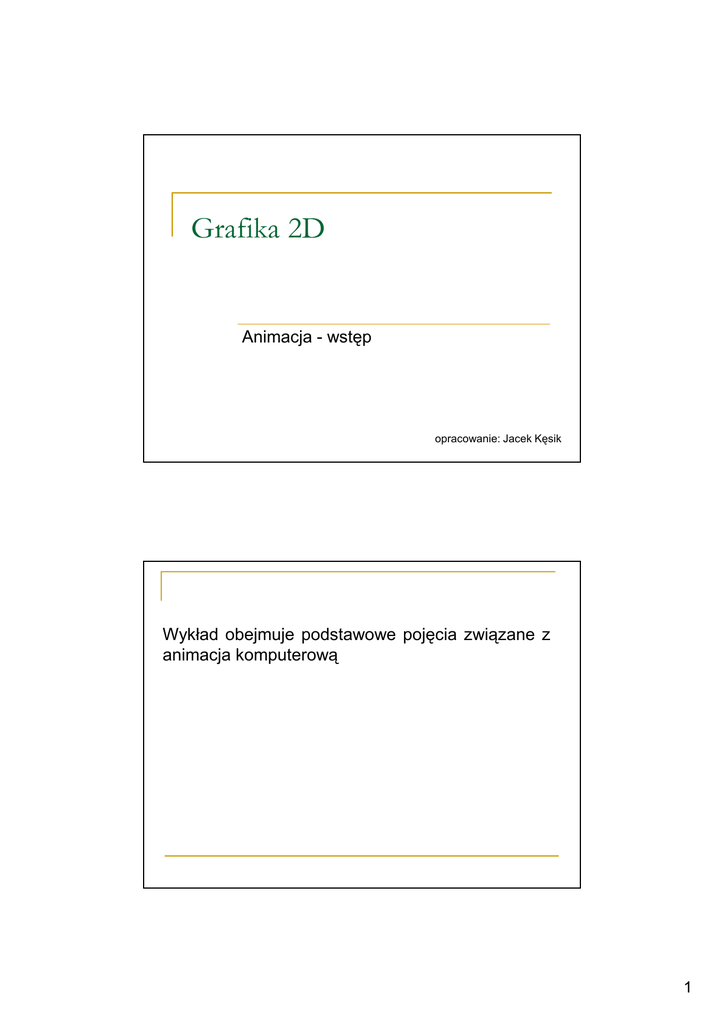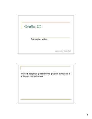 Grafika 2D Animacja - wstęp opracowanie: Jacek Kęsik Wykład obejmuje podstawowe pojęcia związane z animacja komputerową 1 Animacja – podstawowe pojęcia Scena Rodzaje animacji Symbole Animacja Animacja Bardzo szybkie wyświetlanie sekwencji obrazów zawierających grafikę 2D lub 3D w celu wytworzenia iluzji ruchu. Uzyskuje się optyczną iluzję ruchu spowodowaną fenomenem utrzymywania się powidoku na siatkówce oka przez około 1/25 sekundy UwaŜa się, Ŝe minimalna prędkość animacji powodująca jeszcze wraŜenie ruchu to 12 klatek/s podczas gdy wartość 70 klatek/s jest wartością graniczną uzyskania wraŜenia poprawy jakości (płynności) animacji Animacja jest procesem (automatycznego) generowania serii obrazów, gdy kolejny obraz przedstawia pewną zmianę w stosunku do poprzedniego. 2 Animacja Pierwsza animacja komputerowa Została stworzona przez Edwarda E. Zająca, pracownika AT&T Bell Labs. w 1963 r. Miała obrazować działanie systemu Ŝyroskopowego, utrzymującego orbitującego satelitę skierowanego zawsze w stronę ziemi http://econ.arizona.edu/zajac/ZajacVideoPage.htm Animacja Podstawowe pojęcia Scena Tak jak w przypadku rzeczywistego przedstawienia, w animacji moŜemy mówić o „scenie” i „kulisach” Scena animacji jest to obszar widziany przez widza. W przypadku animacji 2D jest to pewien prostokąt Elementy animacji wykraczające poza scenę są obcinane zgodnie z zasadami clippingu Z punktu widzenia odtwarzania animacji, „kulisy” – obszar roboczy poza sceną, nie jest potrzebny 3 Animacja Podstawowe pojęcia Scena i obszar roboczy Obszar roboczy jest jednak znacznym ułatwieniem dla projektanta animacji. Łatwiej jest stworzyć i zarządzać całą animacją odbywającą się częściowo na scenie niŜ jej częściami z koniecznością ich synchronizacji Animacja Podstawowe pojęcia Rodzaje animacji • Animacja poklatkowa • Metoda klatek kluczowych – keyframing • Motion capture • Przesuwanie kamer i oświetlenia • Morphing (płynne przekształcanie) i warping (zniekształcanie obrazów) – odpowiednikiem jest Shape Tween we Flashu Łączenie hierarchiczne system kości 4 Animacja Podstawowe pojęcia Rodzaje animacji – animacja poklatkowa (Stop motion) Bezpośrednie przeniesienie do animacji komputerowej zasad animacji analogowej Rejestracja obrazów statycznych (klatek animacji). KaŜdy kolejny obraz róŜni się w niewielkim stopniu od poprzedniego W animacjach analogowych nie było moŜliwości uzyskania efektu rozmycia ruchu, co moŜna wprowadzic w animacji komputerowej Animacja Podstawowe pojęcia Rodzaje animacji – klatki kluczowe (keyframing, tweening) Pochodzi jeszcze z animacji analogowych. Klatki kluczowe – główne elementy animacji były tworzone przez głównego animatora. Klatki pośrednie uzupełniał jego zespół W przypadku animacji komputerowej rolę zespołu przejmuje odpowiedni algorytm Klatki kluczowe definiują początek i koniec sekwencji. Klatki pośrednie określają czas trwania przejścia Keyframing ma sens dla animacji dłuŜszych od kilku klatek, gdy zmiana następuje w sposób płynny i niezbyt gwałtowny 5 Animacja Podstawowe pojęcia Rodzaje animacji – klatki kluczowe (keyframing) Algorytmy generowania klatek pośrednich bazują na tych samych zasadach co algorytmy przetwarzania obiektów wektorowych – przemieszczanie wierzchołków i ponowne łączenie liniami z uwzględnieniem zmian parametrów opisujących je krzywych. Bardziej złoŜonym problemem jest sytuacja róŜnej ilości wierzchołków obiektu początkowego i końcowego. Skomplikowane kształty obiektów mogą spowodować „ogłupienie” algorytmu Animacja Podstawowe pojęcia Rodzaje animacji – motion capture Metoda wykorzystywana głównie do tworzenia realistycznych animacji ruchu człowieka. Bazuje na odczycie połoŜenia strategicznych elementów ciała ludzkiego w ruchu Przechwytywanie połoŜeń najczęściej realizowane jest przez optyczny odczyt pozycji markerów umieszczonych na ciele lub odpowiednim stroju 6 Animacja Podstawowe pojęcia Rodzaje animacji – motion capture Wadą rozwiązania optycznego jest przesłanianie markerów zmuszające do budowania specjalistycznych (i bardzo drogich) studio Ostatnio popularne staje się wykorzystanie czujników inercyjnych zastępujących markery – uwolnienie od konkretnego obszaru Animacja Podstawowe pojęcia Rodzaje animacji – przesuwanie kamer i oświetlenia Animacja wykorzystywana raczej w przypadku grafiki 3D. Obiekty na scenie pozostają w bezruchu. Przemieszczana jest kamera i/lub źródła światła. W tym drugim przypadku animowane są cienie na powierzchni obiektów 7 Animacja Podstawowe pojęcia Rodzaje animacji – morphing Technika przekształcania obrazu polegająca na płynnej zmianie jednego obrazu w inny Polega na takim odkształcaniu łączonych obrazów, aby przez cały czas przejścia obraz pozostawał wyraźny, a zmiana kształtów odbywała się w sposób płynny https://secure.wikimedia.org/wikipedia/pl/wiki/Morfing Animacja Podstawowe pojęcia Rodzaje animacji – morphing Odmianą morfingu jest warping, gdzie obraz końcowy jest zniekształconą wersją obrazu początkowego. Często stosowany do tworzenia róŜnego rodzaju karykatur 8 Animacja Podstawowe pojęcia Rodzaje animacji – animacje powiązane Hierarchia animacji Animacja układów złoŜonych, gdzie chcemy wymusić określone zachowanie jednego elementu będącego częścią większej całości. Posiadającego tym samym ograniczenia w swobodzie ruchu Hierarchia pozwala określić zaleŜności pomiędzy poszczególnymi segmentami obiektu złoŜonego – nadrzędnymi (rodzicami) i podrzędnymi (dziećmi) Łączenia hierarchicznego uŜywa się do powiązania ze sobą poszczególnych segmentów układu np. postaci lub kości szkieletu. Animacja Podstawowe pojęcia Rodzaje animacji – animacje powiązane Dwa podstawowe rodzaje Animowanie sekwencyjne (forward kinematics) Przemieszcza