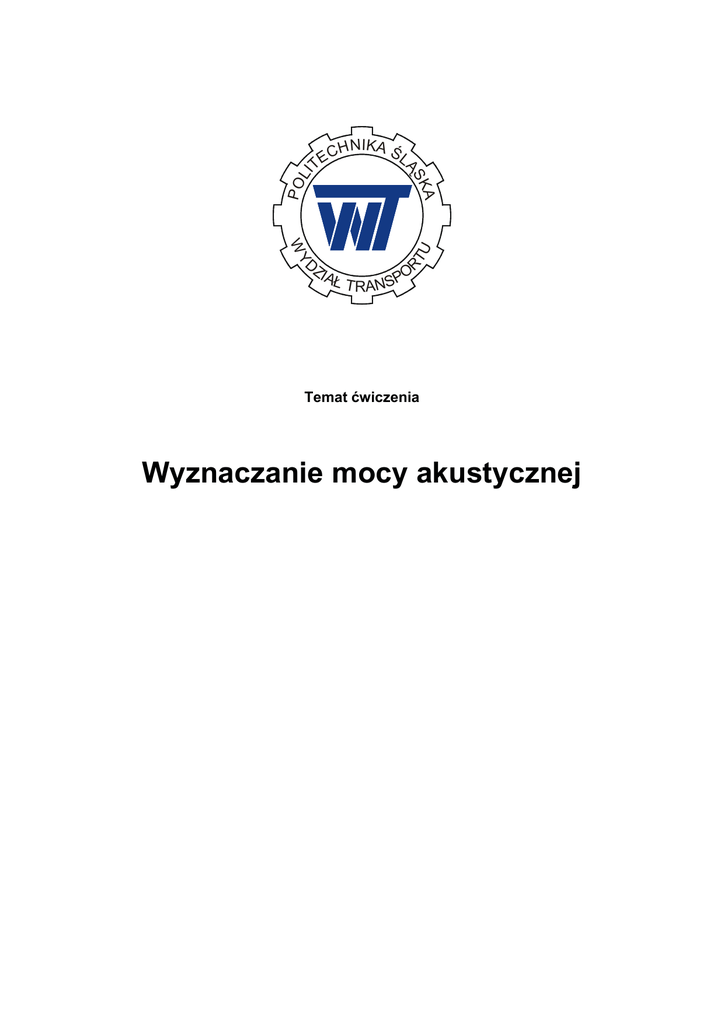 Y RT U PO LI W DZ I HNIKA ŚL KA ĄS C TE O AŁ T RANSP Temat ćwiczenia Wyznaczanie mocy akustycznej Cel ćwiczenia Pomiary poziomu natęŜenia dźwięku źródła hałasu. Wyznaczanie mocy akustycznej źródła hałasu. Wyznaczanie widmowej charakterystyki akustycznej źródła dźwięku. Wiadomości wstępne Charakterystyka maszyn i urządzeń jako źródeł hałasu wymaga podania takich wielkości, które umoŜliwiłyby ich obiektywną ocenę w warunkach pracy. Do takiej oceny niezbędne są informacje o wysiłku źródła (moc, poziom) oraz o widmie częstotliwościowym źródła. W pewnych przypadkach mogą to być informacje wzajemnie ze sobą powiązane, takie jak: moc akustyczna, poziom mocy akustycznej i poziom hałasu. Są to informacje traktujące sumarycznie całe widmo emitowanego hałasu. Drugi rodzaj informacji to dane o widmie hałasu w postaci poziomów w pasmach tercjowych, oktawowych lub innych zwanych poziomami widmowymi. Takie dane umoŜliwiają ocenę porównawczą maszyn oraz ocenę poziomu hałasu maszyny w dowolnych znanych warunkach akustycznych. Cel badań w tym przedmiocie stanowią więc charakterystyki hałasowe maszyn jako źródeł hałasu. Charakterystyki te mogą być wykorzystane do sporządzania atestu akustycznego maszyny. Ponadto badania te słuŜą identyfikacji i lokalizacji źródeł hałasu w celu ich minimalizacji. Metody wyznaczania poziomu mocy akustycznej Istnieją dwa przeciwne podejścia do określania poziomu mocy akustycznej źródła: pomiary w strefie, gdzie dominuje pole bezpośrednie, czyli blisko źródła dźwięku gdzie wpływ dźwięków odbitych od ścian pomieszczenia i jego wyposaŜenia moŜna uwzględnić wykonując korektę (poprawkę środowiskową). pomiary w strefie, w której dominuje pole pogłosowe, czyli z daleka od źródła. W obydwu grupach metod wyznaczania poziomu mocy akustycznej duŜy wpływ ma charakterystyka środowiska badawczego. Druga grupa metod (gdy opieramy się na pomiarach wykonanych w polu pogłosowym) jest moŜliwa do zrealizowania tylko w pomieszczeniach specjalnie do tego celu zbudowanych (komory pogłosowe). W przypadku metod opartych o pomiary w polu swobodnym zaleŜy nam na tym, aby pole pogłosowe miało jak najmniejszy wpływ na uzyskane wyniki. Środowiska badawcze spełniające takie wymagania to: komory bezechowe lub półbezechowe wolne przestrzenie na otwartym terenie duŜe pomieszczenia lub poddane adaptacji akustycznej Ewentualny zakłócenia pochodzące od dźwięków odbitych (pole pogłosowe) naleŜy uwzględnić wprowadzając poprawkę środowiskową K2. Poprawkę K2 moŜna wyznaczyć dwoma metodami: K2 wyznaczona z oceny pochłaniania środowiska badawczego K2 oceniana za pomocą źródła dźwięku odniesienia. W przypadku korzystania ze źródła dźwięku odniesienia poprawkę określa się poprzez ustalenie róŜnicy w poziomach mocy akustycznej wyznaczonej w czasie pomiaru i podanej przez producenta źródła dźwięku. Metoda oparta na ocenie stopnia pochłaniania dźwięku przez środowisko opiera się na załoŜeniu, Ŝe pole akustyczne pogłosowe jest rozproszone, to znaczy jednorodne i ustalone. Poprawkę K2 moŜna wtedy wyznaczyć z chłonności akustycznej pomieszczenia badawczego i pola powierzchni pomiarowej. K2 = 10 log [1+4 S/A] [dB] S – pole powierzchni pomiarowej A – chłonność akustyczna pomieszczenia [m2] wyznaczona z zaleŜności: A = α Sv α – średni współczynnik pochłaniania dźwięku Sv – całkowite pole powierzchni ograniczającej pomieszczenie badawcze Średni współczynnik pochłaniania dźwięku α moŜna wyznaczyć na podstawie: oszacowania współczynnika pochłaniania dźwięku kaŜdego elementu powierzchni pomieszczenia badawczego pomiaru czasu pogłosu pomieszczenia badawczego w strefie, w której znajduje się badane źródło pomiarów akustycznych wykonanych jednocześnie na dwóch powierzchniach otaczających źródło dźwięku Bez względu na zastosowaną metodę wyznaczania mocy akustycznej wyznaczanie emisji hałasu danego źródła jest zakłócone przez emisję dźwiękową, zwaną „hałasem tła”. NaleŜy w związku z tym wprowadzić poprawkę uwzględniającą hałas tła K1. Jej wartość jest wskaźnikiem jakościowym, związanym z klasą dokładności. Zastosowane kryterium odnosi się do wartości róŜnicy ∆Lp między mierzonymi poziomami ciśnienia akustycznego z włączonym i wyłączonym źródłem badanym. Wartość poprawki K1 oblicza się z wzoru: K1 = -10 log (1 – 10-0,1∆Lp ) [dB] ∆Lp = L’p - L’’p L’p – równowaŜny poziom dźwięku uśredniony na powierzchni pomiarowej w czasie pracy badanego źródła L’’p – równowaŜny poziom dźwięku hałasu tła uśredniony na powierzchni pomiarowej przy wyłączonym źródle uwaga JeŜeli ∆Lp > 10 dB wtedy K1 = 0 Program ćwiczenia Wyznaczanie poziomu mocy akustycznej metodą orientacyjną wg ISO 3746 (wyznaczanie wartości mocy akustycznej NA , wyznaczanie charakterystyki widmowej badanego źródła hałasu) 1. Wyznaczyć prostopadłościan odniesienia obejmujący badane źródło hałasu (l1, l2, l3) Rys. 1. Lokalizacja punktów pomiarowych na prostopadłościennej powierzchni pomiarowej 2. Określić liczbę punktów pomiarowych zgodnie z wartościami podanymi w tabeli: Tabela 1. Liczba wymaganych pozycji mikrofonu wg wielkości maszyny dla norm ISO 3744 i ISO 3746 rozmiary l1, l2, l3 źródła EN ISO 3744 EN ISO 37461) wm (klasa 2) (klasa 3) l1≤1 , l2≤1 , l3≤2 9 5 (małe źródło) l1≤1 , l2≤1 , 2<l3≤5 17 9 (źródło wysokie i wąskie) 4<l1≤7 , l2≤1 , l3≤2 19 11 (źródło wydłuŜone) 1<l1≤4 , l2≤4 , 2<l3≤5 36 20 (źródło średniej wielkości) 4<l1≤7 , 1<l2≤4 , 2<l3≤5 46 26 (duŜe źródło) 3. Przyjąć wartość d określającą rozmiary powierzchni pomiarowej 0,25 ≤ d ≤ 1 [m] 4. Określić lokalizację punktów pomiarowych na powierzchni pomiarowej 5. Wyznaczyć wartość poprawki K2 przyjmują
