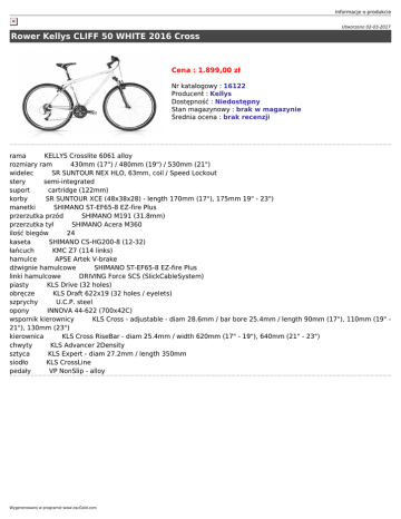 Informacje o produkcie Utworzono 02-03-2017 Rower Kellys CLIFF 50 WHITE 2016 Cross Cena : 1.899,00 zł Nr katalogowy : 16122 Producent : Kellys Dostępność : Niedostępny Stan magazynowy : brak w magazynie Średnia ocena : brak recenzji rama KELLYS Crosslite 6061 alloy rozmiary ram 430mm (17") / 480mm (19") / 530mm (21") widelec SR SUNTOUR NEX HLO, 63mm, coil / Speed Lockout stery semi-integrated suport cartridge (122mm) korby SR SUNTOUR XCE (48x38x28) - length 170mm (17"), 175mm 19" - 23") manetki SHIMANO ST-EF65-8 EZ-fire Plus przerzutka przód SHIMANO M191 (31.8mm) przerzutka tył SHIMANO Acera M360 ilość biegów 24 kaseta SHIMANO CS-HG200-8 (12-32) łańcuch KMC Z7 (114 links) hamulce APSE Artek V-brake dżwignie hamulcowe SHIMANO ST-EF65-8 EZ-fire Plus linki hamulcowe DRIVING Force SCS (SlickCableSystem) piasty KLS Drive (32 holes) obręcze KLS Draft 622x19 (32 holes / eyelets) szprychy U.C.P. steel opony INNOVA 44-622 (700x42C) wspornik kierownicy KLS Cross - adjustable - diam 28.6mm / bar bore 25.4mm / length 90mm (17"), 110mm (19" 21"), 130mm (23") kierownica KLS Cross RiseBar - diam 25.4mm / width 620mm (17" - 19"), 640mm (21" - 23") chwyty KLS Advancer 2Density sztyca KLS Expert - diam 27.2mm / length 350mm siodło KLS CrossLine pedały VP NonSlip - alloy Wygenerowano w programie www.oscGold.com