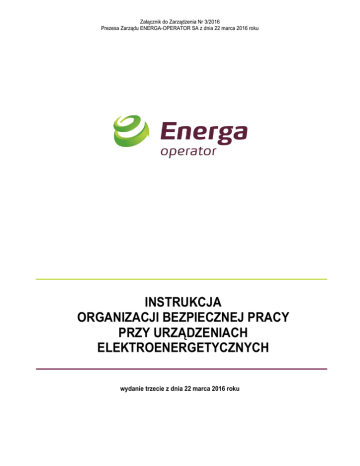 Załącznik do Zarządzenia Nr 3/2016 Prezesa Zarządu ENERGA-OPERATOR SA z dnia 22 marca 2016 roku INSTRUKCJA ORGANIZACJI BEZPIECZNEJ PRACY PRZY URZĄDZENIACH ELEKTROENERGETYCZNYCH wydanie trzecie z dnia 22 marca 2016 roku Spis treści 1. CEL WPROWADZENIA INSTRUKCJI I ZAKRES STOSOWANIA 2. DEFINICJE 3. OPIS POSTĘPOWANIA 3.1. Organizacja prac 3.1.1. Zasady podstawowe 3.1.2. Osoby odpowiedzialne za organizację i wykonywanie prac 3.1.3. Podstawy wykonywania prac 3.1.4. Polecenie pisemne 3.1.5. Zasady organizacji prac 3.1.6. Zasady dodatkowe w zakresie organizacji prac 3.1.7. Zasady organizacji prac wykonywanych przez wykonawców zewnętrznych 3.2. Wykonywanie prac eksploatacyjnych 3.2.1. Podział prac 3.2.2. Prace przy wyłączonym napięciu 3.2.2.1. Zasady ogólne 3.2.2.2. Czynności łączeniowe 3.2.2.3. Sprawdzanie braku napięcia 3.2.2.4. Uziemianie i zwieranie 3.2.2.5. Wygradzanie i oznaczanie 3.2.3. Prace pod napięciem 3.2.3.1. Zasady ogólne 3.2.3.2. Kwalifikacje i obowiązki osób organizujących i wykonujących prace 3.2.3.3. Metody pracy 3.2.3.4. Warunki pracy 3.2.3.5. Warunki środowiskowe 3.2.3.6. Sprzęt i narzędzia oraz środki ochrony indywidualnej 3.2.3.7. Organizacja pracy 3.2.4. Prace w pobliżu napięcia 3.2.4.1. Zasady ogólne 3.2.4.2. Ochrona przez zachowanie odstępów 3.2.4.3. Ochrona za pomocą sprzętu ochronnego 3.2.5. Prace bez wyłączenia napięcia 3.3. Prace budowlane i pomocnicze 3.4. Prace przy użyciu sprzętu zmechanizowanego 3.5. Zasady ochrony przeciwpożarowej 4. SPIS ZAŁĄCZNIKÓW 5. AKTY PRAWNE I DOKUMENTY ZWIĄZANE 5.1. Regulacje zewnętrzne 5.2. Regulacje wewnętrzne procesowe 6. ODPOWIEDZIALNOŚĆ Instrukcja organizacji bezpiecznej pracy przy urządzeniach elektroenergetycznych, wydanie trzecie z dnia 22 marca 2016 roku 3 3 7 7 7 12 14 14 18 21 23 23 23 25 25 26 26 27 29 30 30 31 31 31 32 32 33 34 34 34 35 35 36 39 40 41 41 41 42 42 2/42 1. CEL WPROWADZENIA INSTRUKCJI I ZAKRES STOSOWANIA Celem instrukcji jest określenie wymagań bezpieczeństwa w zakresie organizacji oraz wykonywania prac przy czynnych urządzeniach elektroenergetycznych oraz w ich pobliżu. Za nadzór nad stosowaniem niniejszej instrukcji odpowiedzialny jest właściciel megaprocesów „Zarządzanie pracami na sieci”, „Wykonawstwo prac na sieci” oraz „Prowadzenie ruchu sieci dystrybucyjnej”. Za nadzór nad zapisami niniejszej instrukcji odpowiedzialny jest właściciel megaprocesu „BHP i PPOŻ”. Instrukcja obowiązuje osoby organizujące oraz wykonujące prace przy urządzeniach elektroenergetycznych oraz w ich pobliżu na stanowiskach dozoru i eksploatacji u: a) prowadzących eksploatację, b) wykonawców zewnętrznych. Postanowienia instrukcji mają zastosowanie przy organizowaniu i wykonywaniu wszelkich prac przy czynnych urządzeniach elektroenergetycznych oraz w ich pobliżu, będących własnością ENERGA-OPERATOR SA. Postanowień instrukcji nie stosuje się do prac wykonywanych przy urządzeniach elektroenergetycznych napięcia bardzo niskiego oraz urządzeniach elektroenergetycznych powszechnego użytku. 2. DEFINICJE Czynności łączeniowe czynności powodujące zmianę stanu położenia łączników oraz włożenie lub wyjęcie wkładek bezpiecznikowych. Dedykowany system informatyczny system informatyczny wspomagający planowanie i wykonywanie prac eksploatacyjnych i awaryjnych przy urządzeniach elektroenergetycznych oraz w ich pobliżu, obowiązujący w ENERGA-OPERATOR SA. Dyspozycja mocy komórka organizacyjna ENERGA-OPERATOR SA odpowiedzialna za prowadzenie ruchu sieci dystrybucyjnej zgodnie z podziałem kompetencji. Dyspozytor uprawniony i upoważniony pracownik dyspozycji mocy operatywnie kierujący ruchem sieci dystrybucyjnej i koordynujący wykonywanie prac z ruchem sieci na wskazanym obszarze operatywnego kierownictwa. Dziennik operacyjny dokument w wersji papierowej lub elektronicznej, prowadzony przez Dyspozytora oraz inne osoby prowadzące zapisy ruchowe. Ekran element z materiału izolacyjnego lub nie izolacyjnego, stosowany w celu uniemożliwienia zbliżenia się do dowolnej będącej pod napięciem części urządzenia elektroenergetycznego lub jego wyposażenia. ENERGA-OPERATOR SA spółka Grupy Kapitałowej ENERGA pełniąca funkcję Operatora Systemu Dystrybucyjnego określoną w Ustawie Prawo energetyczne. Instrukcja organizacji bezpiecznej pracy przy urządzeniach elektroenergetycznych, wydanie trzecie z dnia 22 marca 2016 roku 3/42 Instrukcja eksploatacji zatwierdzona przez ENERGA-OPERATOR SA instrukcja określająca procedury i zasady prowadzenia eksploatacji danych grup urządzeń elektroenergetycznych. Instrukcja wykonywania prac zatwierdzona przez ENERGA-OPERATOR SA instrukcja określająca kwalifikacje osób, organizację, zasady i sposoby bezpiecznego wykonywania czynności i prac, wymagany sprzęt ochronny oraz środki ochrony indywidualnej, która może stanowić załącznik do instrukcji eksploatacji. Książka instruktaży dokument w formie papierowej lub elektronicznej służący do potwierdzania przeprowadzenia lub otrzymania instruktażu w strefie pracy. Napięcie bardzo niskie napięcie znamionowe nieprzekraczające 50 V prądu przemiennego lub 120 V prądu stałego. Napięcie niskie (nN) napięcie znamionowe nie wyższe niż 1 kV. Napięcie średnie (SN) napięcie znamionowe wyższe od 1 kV i niższe od 110 kV. Napięcie wysokie (WN) napięcie znamionowe równe 110 kV. Napięcie najwyższe (NN) napięcie znamionowe wyższe od 110 kV. Obiekt elektroenergetyczny obiekt zawierający urządzenia elektroenergetyczne, przeznaczone do przesyłania, przetwarzania, rozdzielania i odbioru energii elektrycznej, łącznie ze służącymi mu budynkami i terenem, na którym się znajduje. Obudowa izolacyjna część zapewniająca ochronę urządzenia przed określonymi wpływami otoczenia i dotykiem bezpośrednim z dowolnej strony. Osłona izolacyjna sztywna lub elastyczna osłona wykonana z materiału izolacyjnego, wykorzystyw
