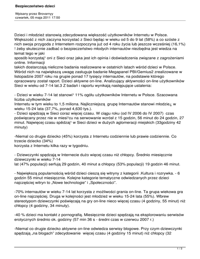 Bezpieczeństwo dzieci Wpisany przez Brovarnyy czwartek, 05 maja 2011 17:50 Dzieci i młodzież stanowią zdecydowana większość użytkowników Internetu w Polsce. Większość z nich zaczyna korzystać z Sieci będąc w wieku od 5 do 9 lat (58%) a co szóste z nich swoja przygoda z Internetem rozpoczyna już od 4 roku życia lub jeszcze wcześniej (16,1%) ! żeby skutecznie zadbać o bezpieczeństwo młodych internautów niezbędna jest wiedza na temat tego w jaki sposób korzystaj¹ oni z Sieci oraz jaka jest ich opinia i doświadczenia związane z zagrożeniami online. Informacji takich dostarczają nieliczne badania realizowane w ostatnich latach wśród dzieci w Polsce. Wśród nich na największą uwagę zasługuje badanie Megapanel PBI/Gemius2 zrealizowane w listopadzie 2007 roku na grupie ponad 17 tysięcy internautów, na podstawie którego opracowany został raport. Dzieci aktywne on-line. Analizujący aktywności on-line użytkowników Sieci w wieku od 7-14 lat.3 Z badań i raportu wynikają następujące ustalenia: - Dzieci w wieku 7-14 lat stanowi¹ 11% ogółu użytkowników Internetu w Polsce. Szacowana liczba użytkowników Internetu w tym wieku to 1,5 miliona. Najliczniejszą grupę Internautów stanowi młodzie¿ w wieku 15-24 lata (37,7%, ponad 4,630 tys.). - Dzieci spędzają w Sieci coraz więcej czasu. W ciągu roku (od IV 2006 do IV 2007) czas poświęcany przez nie w miesi¹cu na serwowanie wzrósł z 15 godzin, 56 minut do 24 godzin, 27 minut. Najwięcej czasu spêdzaj¹ w Sieci dzieci w dużych aglomeracji miejskich (33godziny 42 minuty) -Niemal co drugie dziecko (45%) korzysta z Internetu codziennie lub prawie codziennie. Co trzecie dziecko (34%) korzysta z Internetu kilka razy w tygodniu. - Dziewczynki spędzają w Internecie dużo więcej czasu niż chłopcy. Średnio miesięcznie dziewczynki w wieku 7-14 lat (47% populacji) serfują 29 godzin, 40 minut a chłopcy (53% populacji) 19 godzin 46 minut. - Największą popularnością wśród dzieci cieszą się witryny z kategorii .Kultura i rozrywka. - 6 godzin 55 minut miesięcznie. Kolejne kategorie tematyczne odwiedzanych przez dzieci najczęściej witryn to „Nowe technologie” i „Społeczności”. -70% internautów w wieku 7-14 lat korzysta z możliwości grania on-line. Ta grupa wiekowa gra on-line najczęściej. Druga w kolejności jest młodzież w wieku 15-24 lata (55%). Wbrew stereotypom dziewczynki poświęcają na gry on-line nieco więcej czasu (4 godziny, 55 minut) niż chłopcy (4 godziny, 34 minuty). -40 % dzieci ma kontakt z pornografią. Miesięcznie dzieci spędzają na eksplorowaniu serwisów erotycznych średnio ok. godziny (57 min 36 s - średni czas w czerwcu 2007 r.) -Niemal co drugie dziecko aktywne on-line odwiedza serwisy blogowe. Przy czym dziewczynki spędzają „na blogach” zdecydowanie więcej czasu (4 godziny 15 minut) niż chłopcy (32 1/3 Bezpieczeństwo dzieci Wpisany przez Brovarnyy czwartek, 05 maja 2011 17:50 minuty) Z pozostałych danych badawczych warte odnotowania są następujące dane: -Zdecydowana większość dzieci w wieku 12-17 lat korzysta z Internetu u siebie w domu (95,7%) . Drugim miejscem, pod względem liczby wskazań, jest szkoła 46,0%. Co czwarte dziecko korzysta z Internetu u znajomych (25,3%). Miejsca, w których dzieci korzystają z Internetu U siebie w domu- 95.7% W szkole- 46% U znajomych- 25.3% W kawiarence internetowej- 6.6% W innych miejscach- 3.2% Usługi internetowe, z których dzieci najczęściej korzystają: Komunikatory- 92.1% WWW- 91.4% E-mail- 85.3% Gry online- 51% - 38% dzieci korzystających z komunikatorów wykorzystuje funkcję komunikacji głosowej -64% dzieci zawiera znajomości w Internecie znajomości! Znaczna część spośród nich przekazuje osobom poznanym w Internecie prywatne informacje o sobie, jak adres domowy (10%), numer telefonu (45%) adres e-mail (78%). Ponad 58% dzieci wysłało osobie poznanej w Sieci swoje zdjęcie (47, 4% robi to regularnie) Informacje ujawniane przez dzieci Adres domowy- 10% 2/3 Bezpieczeństwo dzieci Wpisany przez Brovarnyy czwartek, 05 maja 2011 17:50 Numer telefonu- 45% Adres e-mail- 78% 3/3