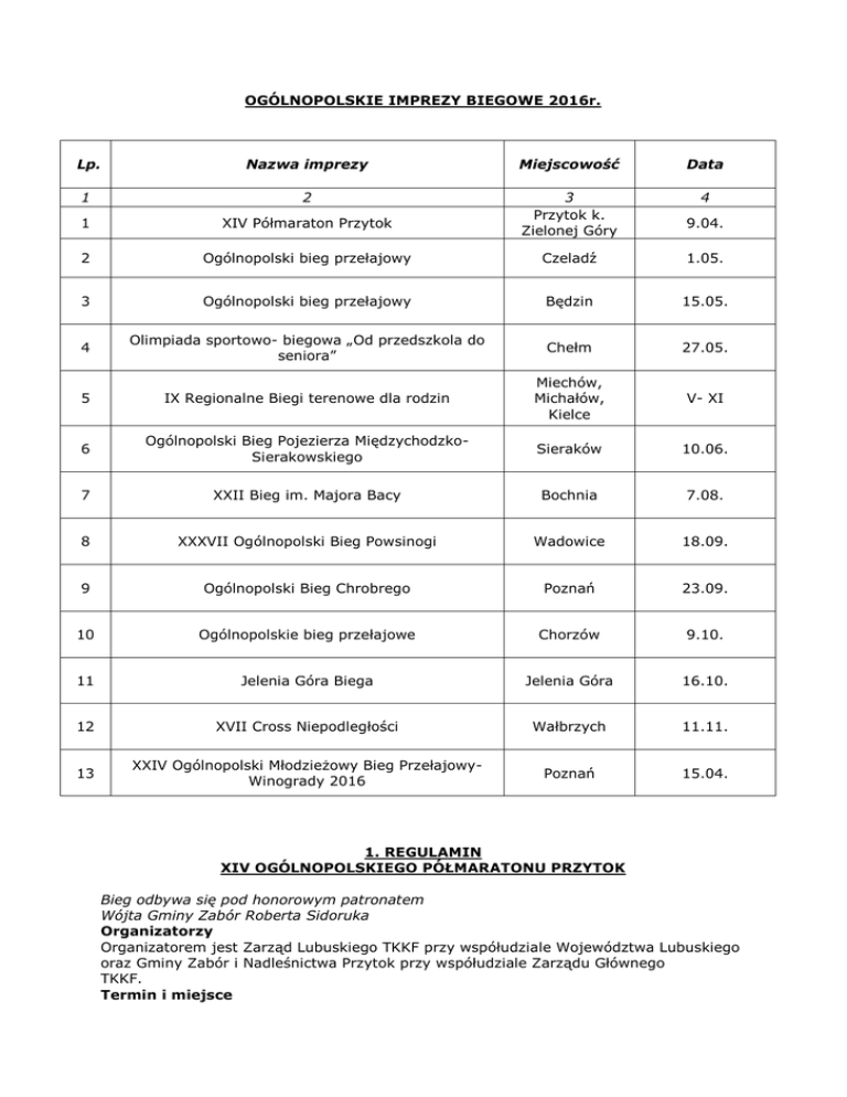 OGÓLNOPOLSKIE IMPREZY BIEGOWE 2016r. Lp. Nazwa imprezy Miejscowość Data 1 2 4 1 XIV Półmaraton Przytok 3 Przytok k. Zielonej Góry 2 Ogólnopolski bieg przełajowy Czeladź 1.05. 3 Ogólnopolski bieg przełajowy Będzin 15.05. 4 Olimpiada sportowo- biegowa „Od przedszkola do seniora” Chełm 27.05. 5 IX Regionalne Biegi terenowe dla rodzin Miechów, Michałów, Kielce V- XI 6 Ogólnopolski Bieg Pojezierza MiędzychodzkoSierakowskiego Sieraków 10.06. 7 XXII Bieg im. Majora Bacy Bochnia 7.08. 8 XXXVII Ogólnopolski Bieg Powsinogi Wadowice 18.09. 9 Ogólnopolski Bieg Chrobrego Poznań 23.09. 10 Ogólnopolskie bieg przełajowe Chorzów 9.10. 11 Jelenia Góra Biega Jelenia Góra 16.10. 12 XVII Cross Niepodległości Wałbrzych 11.11. 13 XXIV Ogólnopolski Młodzieżowy Bieg PrzełajowyWinogrady 2016 Poznań 15.04. 9.04. 1. REGULAMIN XIV OGÓLNOPOLSKIEGO PÓŁMARATONU PRZYTOK Bieg odbywa się pod honorowym patronatem Wójta Gminy Zabór Roberta Sidoruka Organizatorzy Organizatorem jest Zarząd Lubuskiego TKKF przy współudziale Województwa Lubuskiego oraz Gminy Zabór i Nadleśnictwa Przytok przy współudziale Zarządu Głównego TKKF. Termin i miejsce 1. Bieg odbędzie się 9 kwietnia 2016 roku (sobota) na terenie gminy Zabór, woj. lubuskie. 2. Start nastąpi o godz. 1100. Trasa 1. Uczestnicy biegu rywalizować będą na dystansie 21,097 km, na trasie o nawierzchni asfaltowej posiadającej atest PZLA, przy ograniczonym ruchu drogowym. 2. Start i meta znajdują się w parku pałacowym przy Młodzieżowym Ośrodku Socjoterapii w Przytoku. 3. Punkty z napojami będą w miejscowościach Czarna (9,4 km) i Zabór (14,0 km). Uczestnictwo i zgłoszenia 1. Uczestnik biegu musi mieć ukończone 18 lat. 2. Gwarantuje się przyjęcie 300 zawodników, którzy dokonają zgłoszenia i wpłaty wpisowego. Decydować będzie kolejność wpłat. 3. Uczestnicy akcji „Półmaraton Przytok z Gazetą Wyborczą”, którzy po raz pierwszy wystartują w biegu będą przyjęci poza limitem. 4. Zgłoszenia oraz opłaty startowe w kwocie 50 zł przyjmowane będą tylko elektronicznie – do 1 kwietnia 2016 r. włącznie poprzez stronę internetową: http://www.super-sport.com.pl 5. Przelewy realizowane będą za pomocą usługi DOTPAY. Za datę wniesienia opłaty startowej przyjmuje się termin dokonania płatności. 6. Wniesiona opłata nie podlega zwrotowi. 7. Lista zawodników zakwalifikowanych zostanie opublikowana na stronie Lubuskiego TKKF http://www.tkkf.zgora.pl do dnia 4 kwietnia 2016 r. 8. Pakiety startowe wydawane będą w biurze zawodów po okazaniu dokumentu tożsamości i podpisaniu oświadczenia o stanie zdrowia umożliwiającym start w biegu. 9. Przyjęcie numeru startowego uważa się za jednoznaczne z akceptacją regulaminu imprezy. Zakwaterowanie i wyżywienie Istnieje możliwość skorzystania z noclegów i wyżywienia w Młodzieżowym Ośrodku Socjoterapii w Przytoku. Świadczenia te można zamawiać telefonicznie pod numerem 68 327 44 10. Klasyfikacja końcowa Prowadzone będą indywidualne klasyfikacje generalne kobiet i mężczyzn oraz w kategoriach wiekowych: Mężczyźni Kobiety M 20 – 18–29 lat (1987-1998) K 20 – 18–29 lat (1987-1998) M 30 – 30–39 lat (1977-1986) K 30 – 30–39 lat (1977-1986) M 40 – 40–49 lat (1967-1976) K 40 – 40–49 lat (1967-1976) M 50 – 50–59 lat (1957-1966) K 50 – 50 i więcej lat (do 1966) M 60 – 60–69 lat (1947-1956) M 70 – 70 i więcej lat (do 1946) UWAGA! Uzyskane wyniki zaliczone zostaną do klasyfikacji końcowej Korony Przytoku. Nagrody 1. Zawodnicy, którzy zajmą trzy czołowe miejsca w klasyfikacjach generalnych otrzymają puchary. 2. Najlepsi w kategoriach wiekowych otrzymają medale i nagrody rzeczowe. 3. Najlepszy zawodnik i zawodniczka – mieszkańcy województwa Lubuskiego otrzymają puchary Prezesa Lubuskiego Związku Lekkiej Atletyki. 4. Najlepszy zawodnik i zawodniczka – mieszkańcy Gminy Zabór otrzymają nagrody niespodzianki. 5. Zawodnik, który zajmie 13 miejsce w klasyfikacji generalnej otrzyma „upominek pocieszenia”. 6. Najstarszy zawodnik, który ukończy bieg otrzyma nagrodę Nadleśniczego Nadleśnictwa Przytok. 7. Zawodnik, który ostatni ukończy bieg otrzyma nagrodę Wójta Gminy Zabór. 8. Wszyscy uczestnicy biegu otrzymają pamiątkowe medale. Postanowienia końcowe 1. Uczestnicy biegu nie będą ubezpieczeni przez organizatorów od następstw nieszczęśliwych wypadków. 2. Organizatorzy zapewnią opiekę lekarską oraz napoje na trasie biegu i ciepły posiłek regeneracyjny na mecie. 3. Uczestników obowiązuje strój oraz obuwie sportowe w czasie biegu i w trakcie dekoracji. 4. Organizatorzy nie będą odpowiadali za przedmioty pozostawione bez zabezpieczenia lub skradzione podczas imprezy. 2. REGULAMIN Ogólnopolskiego programu Bieg po Zdrowie- Marszobiegi i Nordic Walking najprostszą formą aktywności fizycznej OGÓLNOPOLSKI BIEG PRZEŁAJOWY CZELADŹ DNIA 01.05.2016r. 1. Cel imprezy: - popularyzacja masowych biegów przełajowych wśród społeczeństwa oraz ogólnopolskiego programu „Bieg po Zdrowie, - promocja Miasta Czeladź, - impreza sportowo – rekreacyjna organizowana w ramach „Dni Czeladzi 2016”. 2. Organizator - MOSiR Czeladź, -Terenowe Ognisko TKKF „Saturn” Czeladź. 3. Współorganizatorzy Śląskie Towarzystwo Krzewienia Kultury Fizycznej w Katowicach, Miejski Szkolny Związek Sportowy, Urząd Miasta Czeladź. Patronat medialny - „Polska Dziennik Zachodni” 4. Termin i miejsce: 01.05.2016r. (niedziela) Stadion MOSiR Czeladź, ul. Sportowa 7 5. Zgłoszenia i zapisy: Biuro zawodów - Stadion Sportowy MOSiR Czeladź (Trybuna) w godz. 8.45 – 10.45. Zgłaszający wskazuje przynależność organizacyjną (klub, szkoła, ognisko oraz miasto). Zgłoszenia wypisuje się drukowanymi literami. Zgłoszenia zbiorowego dokonuje kierownik grupy. Bieg odbędzie się niezależnie od warunków atmosferycznych. 6. Uczestnictwo: Uczestnikiem może być każda osoba zdol