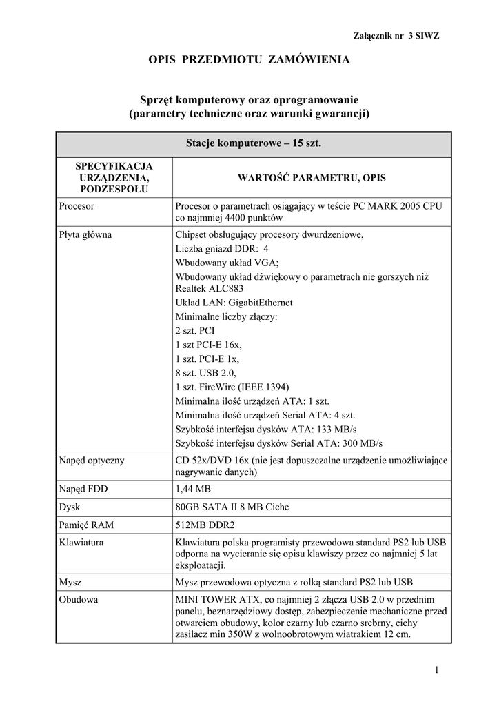 Załącznik nr 3 SIWZ OPIS PRZEDMIOTU ZAMÓWIENIA Sprzęt komputerowy oraz oprogramowanie (parametry techniczne oraz warunki gwarancji) Stacje komputerowe – 15 szt. SPECYFIKACJA URZĄDZENIA, PODZESPOŁU WARTOŚĆ PARAMETRU, OPIS Procesor Procesor o parametrach osiągający w teście PC MARK 2005 CPU co najmniej 4400 punktów Płyta główna Chipset obsługujący procesory dwurdzeniowe, Liczba gniazd DDR: 4 Wbudowany układ VGA; Wbudowany układ dźwiękowy o parametrach nie gorszych niż Realtek ALC883 Układ LAN: GigabitEthernet Minimalne liczby złączy: 2 szt. PCI 1 szt PCI-E 16x, 1 szt. PCI-E 1x, 8 szt. USB 2.0, 1 szt. FireWire (IEEE 1394) Minimalna ilość urządzeń ATA: 1 szt. Minimalna ilość urządzeń Serial ATA: 4 szt. Szybkość interfejsu dysków ATA: 133 MB/s Szybkość interfejsu dysków Serial ATA: 300 MB/s Napęd optyczny CD 52x/DVD 16x (nie jest dopuszczalne urządzenie umożliwiające nagrywanie danych) Napęd FDD 1,44 MB Dysk 80GB SATA II 8 MB Ciche Pamięć RAM 512MB DDR2 Klawiatura Klawiatura polska programisty przewodowa standard PS2 lub USB odporna na wycieranie się opisu klawiszy przez co najmniej 5 lat eksploatacji. Mysz Mysz przewodowa optyczna z rolką standard PS2 lub USB Obudowa MINI TOWER ATX, co najmniej 2 złącza USB 2.0 w przednim panelu, beznarzędziowy dostęp, zabezpieczenie mechaniczne przed otwarciem obudowy, kolor czarny lub czarno srebrny, cichy zasilacz min 350W z wolnoobrotowym wiatrakiem 12 cm. 1 Załącznik nr 3 SIWZ Wymagane dokumenty 1. Deklaracje producenta o zgodności z dyrektywami: 73/23/EEC oraz 89/336/EEC. 2. Wydruk ze strony internetowej firmy Microsoft potwierdzający zgodność oferowanego zestawu z oprogramowaniem Windows XP Pro. 3. Deklaracja producenta komputerów dotycząca wartości poziomu ciśnienia akustycznego zgodnie z normami PN-ISO 9296:1999 oraz PN-EN 27779:1999 nie przekraczającego 27 dB (nie dotyczy hałasu emitowanego przez CD, DVD oraz stacje dyskietek), sporządzonej na podstawie raportu z badań jednostki niezależnej. Należy dołączyć wynik badań. 4. Certyfikat ISO CE, ISO 9001 dla producenta komputera. 5. Wykonawca musi posiadać autoryzację serwisową producenta i poświadczyć ten fakt jego oświadczeniem. Okres gwarancji 24 m-ce w miejscu użytkowania Kolor Czarny, srebrny Monitory LCD – 21 szt. SPECYFIKACJA URZĄDZENIA, WŁAŚCIWOŚCI WARTOŚĆ PARAMETRU, OPIS Przekątna ekranu 17 cali (43 cm) Panel max. 2 ms Czas reakcji TN Wide Angle Rozdzielczość fizyczna 1.3 megapiksela (1280 x 1024) Kontrast min.700 :1 Jasność nominalna min.300 cd / m² Wielkość plamki (pion. x poz.) max.0.264 x 0.264 mm Kąt widzialności (CR > 10) min. poziomo/pionowo: 160°/160°; prawo/lewo: 80°/80°, góra/dół: 80°/80° Wyświetlane kolory min. 16.22 mln Częstotliwość pozioma 31 - 80 (wejście cyfrowe), 24 - 80 (wejście analogowe) KHz Częstotliwość pionowa 55 - 75 Hz Szerokość pasma wizyjnego 135 MHz Plug & play VESA DDC 2B™ Wejścia DVI-D, D-Sub mini 15 pin Wyjścia słuchawkowe 2 Załącznik nr 3 SIWZ Głośniki min. 2 x 1,5W Ergonomia TCO'03, MPR III (prEN50279), ISO 13406-2 Bezpieczeństwo TÜV GS, FCC-B, UL / C-UL, CE, VCCI-B Zasilanie AC 100 - 240 V, 50 / 60 Hz Zasilacz wewnętrzny Zużycie energii 39 W w trybie pracy, maks. 2 W w trybie Power management Zarządzanie energią VESA DPMS, ENERGY STAR® Funkcja "portretowa" 90° Gwarancja Wymagane 36 miesięcy w miejscu użytkowania Kolor Czarny, srebrny Monitor LCD - 1 szt. Przekątna ekranu 22 cale - panorama Panel TN Czas reakcji max. 5 ms Rozdzielczość fizyczna 1,8 megapiksela (1680 x 1050) Kontrast min.1000 :1 Jasność nominalna min.300 cd / m² Wielkość plamki (pion. x poz.) max.0.282 x 0.282 mm Kąt widzialności (CR > 10) min. poziomo/pionowo: 170°/160°; prawo/lewo: 90°/90°, góra/dół: 90°/80° Kąt widzialności (CR > 5) min. poziomo/pionowo: 180°/170°; prawo/lewo: 90°/90°, góra/dół: 90°/80° Wyświetlane kolory min. 16.7 mln Częstotliwość pozioma 31 - 83 KHz Częstotliwość pionowa 56 - 75 Hz Szerokość pasma wizyjnego 162 MHz Plug & play VESA DDC 2B™ Wejścia D-Sub mini 15 pin Wyjścia słuchawkowe Głośniki min. 2 x 1W 3 Załącznik nr 3 SIWZ Ergonomia TCO'03, MPR III (prEN50279), ISO 13406-2 Bezpieczeństwo TÜV GS, FCC-B, UL / C-UL, CE, VCCI-B, GOST-R Zasilanie AC 100 - 240 V, 50 / 60 Hz Zasilacz wewnętrzny Zużycie energii 60 W w trybie pracy, maks. 2 W w trybie Power management Zarządzanie energią VESA DPMS, ENERGY STAR® Gwarancja Wymagane 36 miesięcy w miejscu użytkowania Kolor Czarny, srebrny Drukarki laserowe – 5 szt. SPECYFIKACJA URZĄDZENIA, WŁAŚCIWOŚCI WARTOŚĆ PARAMETRU, OPIS Klasa produktu drukarka laserowa Typ wydruku monochromatyczny druk laserowy Rozmiar papieru A4, A5, Letter, Legal, Executive, B5 (JIS), B5 (ISO), C5, DL, Monarch, Com-10 Rozdzielczość 1200 x 1200 dpi Szybkość wydruku powyżej 17 str./min Moduł druku dwustronnego (duplex) ręczny (z obsługą przez sterownik) Zainstalowana pamięć min. 8 MB Porty I/O port USB (zgodny ze specyfikacją USB 2.0), interfejs sieciowy RJ-45 Ethernet 10/100 Czas oczekiwania na wydruk pierwszej strony maks. 8 sekund Zasilanie napięcie wejściowe 220-240 V (+/- 10%), 50/60 Hz (+/-2 Hz) Pojemność podajnika papieru min. 250 arkuszy papieru formatu A4 Gramatura papieru co najmniej w przedziale od 60 do 160 g/m2 Okres gwarancja Wymagane 12 miesięcy w miejscu użytkowania Inne możliwość drukowania kopert, prosta droga papieru, sterowniki dla Windows 95/98/Me/NT/2000/2000/XP Licencji na oprogramowanie użytkowe komputerów Lp. Nazwa oprogramowania 1. Windows XP PL Professional z SP 2 (licencja typu OEM) Ilość 15 2. Office 2007 Government PL wersja Standard (licencja typu MOLP) 15 3. NOD32 PL 15 4 Załącznik nr 3 SIWZ 4. Nośnik zawierający oprogramowanie Windows XP PL Professional z SP 2 15 5. Nośnik zawierający oprogramowanie Office 2007 Government PL 1 5