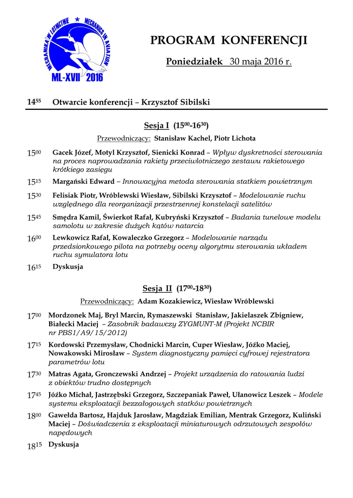 PROGRAM KONFERENCJI Poniedziałek 30 maja 2016 r. 1455 Otwarcie konferencji – Krzysztof Sibilski Sesja I (1500-1630) Przewodniczący: Stanisław Kachel, Piotr Lichota 1500 Gacek Józef, Motyl Krzysztof, Sienicki Konrad – Wpływ dyskretności sterowania na proces naprowadzania rakiety przeciwlotniczego zestawu rakietowego krótkiego zasięgu 1515 Margański Edward – Innowacyjna metoda sterowania statkiem powietrznym 1530 Felisiak Piotr, Wróblewski Wiesław, Sibilski Krzysztof – Modelowanie ruchu względnego dla reorganizacji przestrzennej konstelacji satelitów 1545 Smędra Kamil, Świerkot Rafał, Kubryński Krzysztof – Badania tunelowe modelu samolotu w zakresie dużych kątów natarcia 1600 Lewkowicz Rafał, Kowaleczko Grzegorz – Modelowanie narządu przedsionkowego pilota na potrzeby oceny algorytmu sterowania układem ruchu symulatora lotu 1615 Dyskusja Sesja II (1700-1830) Przewodniczący: Adam Kozakiewicz, Wiesław Wróblewski 1700 Mordzonek Maj, Bryl Marcin, Rymaszewski Stanisław, Jakielaszek Zbigniew, Białecki Maciej – Zasobnik badawczy ZYGMUNT-M (Projekt NCBIR nr PBS1/A9/15/2012) 1715 Kordowski Przemysław, Chodnicki Marcin, Cuper Wiesław, Jóźko Maciej, Nowakowski Mirosław – System diagnostyczny pamięci cyfrowej rejestratora parametrów lotu 1730 Matras Agata, Gronczewski Andrzej – Projekt urządzenia do ratowania ludzi z obiektów trudno dostępnych 1745 Jóźko Michał, Jastrzębski Grzegorz, Szczepaniak Paweł, Ułanowicz Leszek – Modele systemu eksploatacji bezzałogowych statków powietrznych 1800 Gawełda Bartosz, Hajduk Jarosław, Magdziak Emilian, Mentrak Grzegorz, Kuliński Maciej – Doświadczenia z eksploatacji miniaturowych odrzutowych zespołów napędowych 1815 Dyskusja PROGRAM KONFERENCJI Wtorek 31 maja 2016 r. Sesja III (900-1100) Przewodniczący: Aleksander Olejnik, Józef Pietrucha 900 Chmielewski Piotr, Wróblewski Wiesław – Techniczne aspekty budowy bezzałogowego samolotu stratosferycznego o dużej długotrwałości lotu 915 Ciopcia Marcin, Szczepański Cezary – Koncepcja bezzałogowego śmigłowca wielowirnikowego o obracanych gondolach silników 930 Czechowicz Bogusław, Hajduk Jarosław, Kuliński Maciej – Rozwój i doświadczenia z eksploatacji zestawu manewrujących celów powietrznych (ZSMCP) 945 Jastrzębski Grzegorz, Ułanowicz Leszek, Szczepaniak Paweł, Jóźko Michał – Przegląd i kryteria doboru wyrzutni BSP (UAV) 1000 Krzonkalla Jarosław, Bęczkowski Grzegorz, Krajniewski Sławomir, Mordzonek Maj, Rymaszewski Stanisław, Zgrzywa Franciszek – Systemy rejestracji parametrów lotu w lotnictwie wojskowym 1015 Krzymień Wiesław – Uwagi do wymagań przepisów budowy wiatrakowców 1030 Panas Andrzej, Mordzonek Maj, Nowakowski Mirosław, Samczyński Piotr, Kulpa Krzysztof – Zastosowanie technik mikrofalowych do obserwacji powierzchni ziemi (Projekt NCBiR nr PBS1/A9/15/2012) 1045 Dyskusja Sesja IV (1130-1330) Przewodniczący: Józef Gacek, Wiesław Krzymień 1130 Sibilska-Mroziewicz Anna, Ładyżyńska-Kozdraś Edyta, Falkowski Krzysztof – Modelowanie ruchu wózka startowego wyrzutni magnetycznej samolotów bezzałogowych – analiza działających sił 1145 Pietrucha Józef – Mechanizm czerpania energii z falującego strumienia płynu a teoria silnika flatterowego Duncana 1200 Krzysztofik Izabela, Koruba Zbigniew – Koncepcja sterowania głowicą obserwacyjno-śledzącą z klasycznym napędem giroskopowym umieszczoną na pokładzie obiektu latającego 1215 Lasek Maciej – Odtwarzanie przebiegu zdarzeń lotniczych 1230 Wawrzynów Natalia, Gronczewski Andrzej – Wpływ oblodzenia na nośność skrzydła samolotu 1245 Chodnicki Marcin, Kordowski Przemysław, Nowakowski Mirosław, Kowaleczko Grzegorz – Systemy bezpieczeństwa w bezzałogowych statkach powietrznych 1300 Krzysiak Andrzej – Eksperymentalne badania charakterystyk aerodynamicznych samolotu z uszkodzonym skrzydłem 1315 Dyskusja 1330-1400 Prezentacja firmy Materialise Sesja V (1500-1630) Przewodniczący: Elżbieta Jarzębowska, Franciszek Dul 1500 Graffstein Jerzy – Symulacja przebiegu automatycznie sterowanego manewru omijania ruchomej przeszkody w warunkach podejścia do lądowania 1515 Sibilski Krzysztof, Żyluk Andrzej, Kmiecik Marcin – Samolokalizacja i stabilizacja orientacji przestrzennej czterowirnikowego mikrowiropłata za pomocą sygnałów optycznych w pomieszczeniach zakrytych 1530 Marynoshenko Oleksandr, Głębocki Robert – Algorytm dla lotu bezzałogowych aparatów latających w formacji 1545 Romaniuk Sławomir, Ambroziak Leszek, Gosiewski Zdzisław – Algorytm dwuwymiarowego samolokalizowania się stacji bazowych w systemie radiolokalizacyjnym 1600 Placek Robert, Miller Marek, Ruchała Paweł – Wpływ jakości powierzchni modelu profilu laminarnego na wyniki uzyskiwane w opływie transonicznym 1615 Dyskusja Sesja VI (1700-1830) Przewodniczący: Edyta Ładyżyńska-Kozdraś, Maciej Lasek 1700 Olejnik Aleksander, Kachel Stanisław, Rogólski Robert, Benaouali Abdelkader, Łącki Tomasz – Optymalizacja konstrukcji łoża silnikowego lekkiego samolotu patrolowego z uwzględnieniem ekstremalnych obciążeń w locie 1715 Panas Andrzej J., Błaszczyk Janusz, Dudziński Andrzej, Figur Krzysztof, Foltyńska Anna, Krupińska Anna, Nowakowski Mirosław – Badania wpływu temperatury na zmiany właściwości cieplnych i mechanicznych osnowy lotniczego konstrukcyjnego materiału kompozytowego 1730 Adamski Mirosław, Gibuła Jarosław – Projekt koncepcyjny i wykonanie broni w układzie Gaussa 1745 Nowakowski Mirosław, Sibilski Krzysztof, Figur Krzysztof, Lorenc Wojciech – Analiza i wypracowanie najkorzystniejszego systemu żywic na bazie epoksydów 1800 Nowakowski Mirosław, Sibilski Krzysztof, Lorenc Wojciech, Nykaza Agata – Opracowanie technologii laminowania arkusza do wykonania próbek 1815 Dyskusja Specjalna sesja wieczorna (po kolacji) Przewodniczący: Krzysztof Sibilski, Andrzej Żyluk Łucjanek Wiesław – Rys 