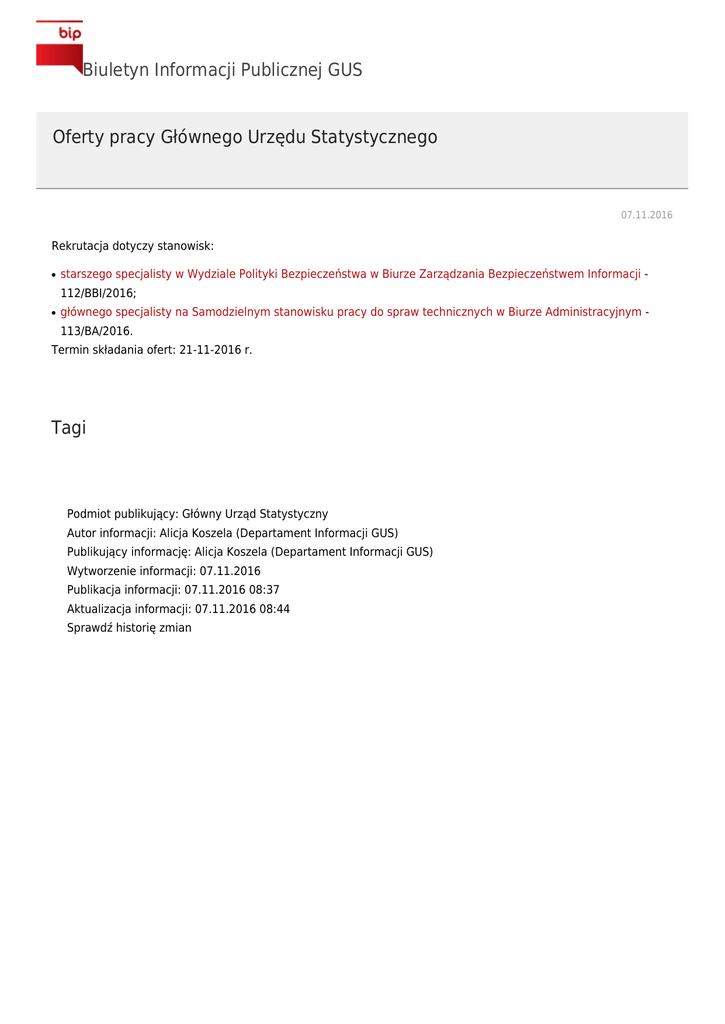 Biuletyn Informacji Publicznej GUS / Aktualności / Oferty pracy