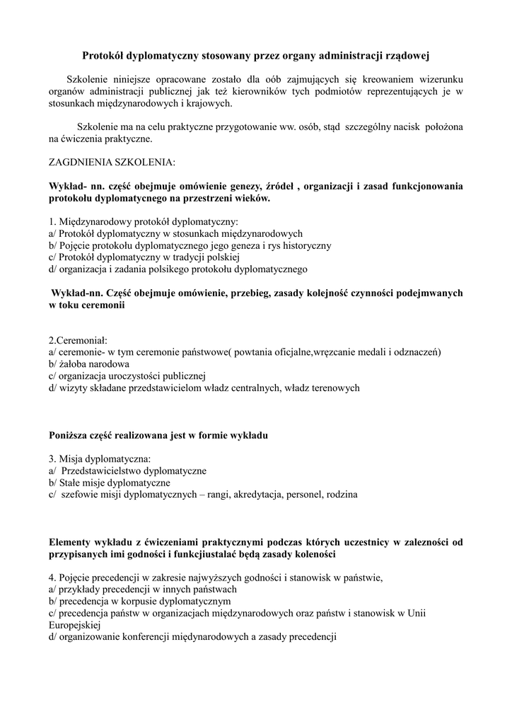 Protokół dyplomatyczny stosowany przez organy administracji rządowej Szkolenie niniejsze opracowane zostało dla oób zajmujących się kreowaniem wizerunku organów administracji publicznej jak też kierowników tych podmiotów reprezentujących je w stosunkach międzynarodowych i krajowych. Szkolenie ma na celu praktyczne przygotowanie ww. osób, stąd szczególny nacisk położona na ćwiczenia praktyczne. ZAGDNIENIA SZKOLENIA: Wykład- nn. część obejmuje omówienie genezy, źródeł , organizacji i zasad funkcjonowania protokołu dyplomatycnego na przestrzeni wieków. 1. Międzynarodowy protokół dyplomatyczny: a/ Protokół dyplomatyczny w stosunkach międzynarodowych b/ Pojęcie protokołu dyplomatycznego jego geneza i rys historyczny c/ Protokół dyplomatyczny w tradycji polskiej d/ organizacja i zadania polsikego protokołu dyplomatycznego Wykład-nn. Część obejmuje omówienie, przebieg, zasady kolejność czynności podejmwanych w toku ceremonii 2.Ceremoniał: a/ ceremonie- w tym ceremonie państwowe( powtania oficjalne,wręzcanie medali i odznaczeń) b/ żałoba narodowa c/ organizacja uroczystości publicznej d/ wizyty składane przedstawicielom władz centralnych, władz terenowych Poniższa część realizowana jest w formie wykładu 3. Misja dyplomatyczna: a/ Przedstawicielstwo dyplomatyczne b/ Stałe misje dyplomatyczne c/ szefowie misji dyplomatycznych – rangi, akredytacja, personel, rodzina Elementy wykładu z ćwiczeniami praktycznymi podczas których uczestnicy w zalezności od przypisanych imi godności i funkcjiustalać będą zasady koleności 4. Pojęcie precedencji w zakresie najwyższych godności i stanowisk w państwie, a/ przykłady precedencji w innych państwach b/ precedencja w korpusie dyplomatycznym c/ precedencja państw w organizacjach międzynarodowych oraz państw i stanowisk w Unii Europejskiej d/ organizowanie konferencji międynarodowych a zasady precedencji Wykład, przedstawienie przykładów korespondencji, pisanie przykładowych lstów, zaproszeń , zawiadomień itp 5.Korespondencja: a/ zasady i formy pisania listów, zwroty wsępne, grzecznościowe, końcowe, b/ korespondencja dyplomatyczna- forma,styl korespondencji dyplomatycznej,pisma ceremonialne w korespondencji dyplomatycznej,pisma okazjonalne w korespondencji dyplomatycznej,notyfikowanie Wykład i ćwiczenia w grupach 6.. Tytulatura:nazewnictwo państw i tytułowanie ich przedstawicieli, tytuły stosowane w korespondencji oficjalnej a/ tytułowanie najwyższych przedstawicieli państw (głów państw, szefów rządów i ambasadorów) w korespondencji i w rozmowie b/ tytułowanie w korespondencji i w rozmowie najwyższych przedstawicieli duchowieństwa c/ tytulatura arystokracji , szczególne zasady w tytulaturze arystokracji brytyjskiej Wykład z elementami ćwiczeń np: planowanie przebiegu przykładowej wizyty zagranicznego gościa itp 7.. Wizyty zagraniczne ich przebieg i znaczenie: a/ typy wizyt ze szczególnym uwzględnieniem wizyt papieskich b/ zasady w oparciu o które można przygoować każdą wizytę c/ ustalanie przebiegu wizyty zagranicznej d/ ceremonia powitania głowy obcego państwa, nieformalne powitanie e/ zasady kwaterowania gościa, przygotowywani i podawania posiłków f/ wymiana upominków, rozmowy delegacji Wykład i ćwiczenie prakyczne np: rozmowa przy stole, nakrywanie do stołu, precedencja przy stole 8. Przyjęcia a/ wstępne przygotowanie przyjęcia b/ typy przyjęć c/ zaproszenia d/ typy stołów, plan stołu e/ miejsca honorowe przy stole, rozsadzanie przy stole f/ nakrycia,sztućce, podawanie, serwis g/ kolejność i dobór dań,wybór win i innych alkoholi h/ ach, ci wegetarianie! Elementy wykładu z ćwiczeniami praktycznymi w grupach obejmującymi przedstawianie siebie i innych, podawnie i całowanie dłoni,pozegnania itd. 9. Etykieta, czyli zasady dobrego wychowania na co dzień a/ etykieta, czyli dobre maniery b/ pojęcia i zasady rządzące dobrym wychowaniem c/ powitania d/ pozdrawianie nieznajomych e/ pierwszeństwo przy wchodzeniu,wchodzenie do miejsc publicznych i po schodach f/ kolejność zajmowania miejsc g/ uścisk dłoni h/ ucałowanie dłoni- całować czy też nie? i/ przedstawianie i rozmowa j/ formy zwracania się w rozmowie k/ zasady prowadzenia rozmów telefonicznych l/ zasady wręczania prezentów, kwiatów m/ wychodzenie, pożegnania, wychodzenie po angielsku i sytuacje niezręczne n/ różnice w zwyczajach wynikające z różnorodności kulturowej o/ wizytówki- rodzaje wizytówek ich forma i wygląd,zakres używalności wizytówki Wykład i ćwiczenia w oparciu o przedstwione dobre i negatywne przykładu strojów, zasady doboru kolorystyki dla pań i panów 10. Ubiór- nas strój codzienny i świąteczny, czyli typy strojów i zasady ich doboru.