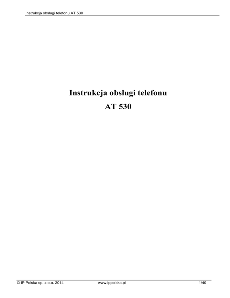 Instrukcja obsługi telefonu AT 530 Instrukcja obsługi telefonu AT 530 © IP Polska sp. z o.o. 2014 www.ippolska.pl 1/40 Instrukcja obsługi telefonu AT 530 1 PREZENTACJA AT 530 ..................................................................................................................................................... 4 1 .1 WYGLĄD ................................................................................................................................................................................... 4 1 .2 PORTY ...................................................................................................................................................................................... 4 1 .3 OPROGRAMOWANIE ................................................................................................................................................................. 5 1 .4 STANDARDY I PROTOKOŁY ...................................................................................................................................................... 5 1 .5 STANDARDY ............................................................................................................................................................................. 5 1 .6 ŚRODOWISKO DZIAŁANIA ......................................................................................................................................................... 6 1 .7 OPAKOWANIE ........................................................................................................................................................................... 6 1.8 INSTALACJA ................................................................................................................................... ........................................ 6 2 KONFIGURACJA PRZEZ PRZEGLĄDARKĘ INTERNETOWĄ ......................................................... 7 2.1 DOSTĘP DO STRONY USTAWIEŃ ............................................................................................................................................. 7 2 .2 AKTUALNY STATUS TELEFONU ................................................................................................................................................. 8 2 .3 SIEĆ ............................................................................................................... .................................. 9 2 .3.1 Konfiguracja WAN ............................................................................................................................................ 9 2 .3.2 Konfiguracja LAN ............................................................................................................................................. 10 2 .4 VoIP ................................................................................................................................................... 11 2 .4.1 Konfiguracja SIP ............................................................................................................................................... 11 2 .4.2 Konfiguracja IAX ............................................................................................................................................... 13 2 .5 USTAWIENIA ZAAWANSOWANE ................................................................................................................................................. 14 2 .5.1 Serwer DHCP ................................................................................................................................................... 14 2 .5.2 NAT ................................................................................................................................................................. 15 2 .5.3 Net Service ...................................................................................................................................................... 16 2 .5.4 Ustawienia firewall ............................................................................................................................................. 17 2 .5.5 Ustawienia QoS ................................................................................................................................................ 18 2 .5.6 Zaawansowane ustawienia SIP .......................................................................................................................... 19 2 .5.7 Digital Map ....................................................................................................................................................... 20 2 .5.8 Usługi dodatkowe ............................................................................................................................................. 21 2 .5.9 MMI Filter ........................................................................................................................................................ 23 2 .5.10 Ustawienia Audio ............................................................................................................................................ 24 2 .5.11 VPN............................................................................................................................................................... 25 2 .6 USTAWIENIA REGUŁ WYBIERANIA NUMERU ............................................................................................................................ 26 2 .7 ZARZĄDZANIE KONFIGURACJĄ ................................................................................................................................................. 27 2 .8 AKTUALIZACJA ......................................................................................................................................................................... 27 2.8.1 Aktualizacja przez WWW .................................................................