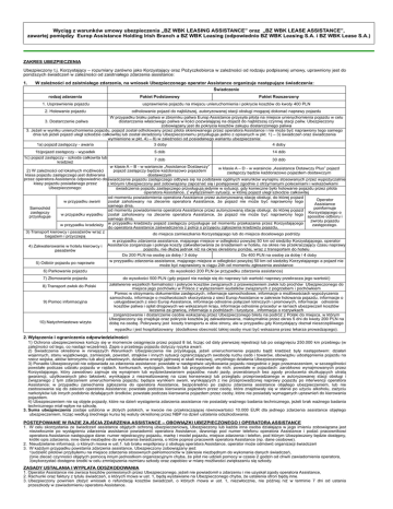 Wyciąg z warunków umowy ubezpieczenia „BZ WBK LEASING ASSISTANCE” oraz „BZ WBK LEASE ASSISTANCE”, zawartej pomiędzy Europ Assistance Holding Irish Branch a BZ WBK Leasing (odpowiednio BZ WBK Leasing S.A. i BZ WBK Lease S.A.) ZAKRES UBEZPIECZENIA Ubezpieczony t.j. Korzystający – rozumiany zarówno jako Korzystający oraz Pożyczkobiorca w zależności od rodzaju podpisanej umowy, uprawniony jest do poniższych świadczeń w zalezności od zaistniałego zdarzenia assistance: 1. W zależności od zaistniałego zdarzenia, na wniosek Ubezpieczonego operator Assistance organizuje następujące świadczenia: Świadczenie rodzaj zdarzenia Pakiet Podstawowy Pakiet Rozszerzony 1. Usprawnienie pojazdu usprawnienie pojazdu na miejscu unieruchomienia i pokrycie kosztów do kwoty 400 PLN 2. Holowanie pojazdu odholowanie pojazd do najbliższej, autoryzowanej stacji obsługi mogącej dokonać naprawy pojazdu W przypadku braku paliwa w zbiorniku paliwa Europ Assistance przysyła pilota na miejsce unieruchomienia pojazdu w celu 3. Dostarczenie paliwa dostarczenia właściwego paliwa w ilości pozwalającej na dojazd do najbliższej czynnej stacji paliw. Ubezpieczony zobowiązany jest do pokrycia kosztów zakupu dostarczonego paliwa 3. Jeżeli w wyniku unieruchomienia pojazdu, pojazd został odholowany przez pilota skierowanego przez operatora Assistance i nie może być naprawiony tego samego dnia lub jeżeli pojazd uległ szkodzie całkowitej lub został skradziony Ubezpieczonemu przysługuje jedno z opisanych w pkt. 1) – 3) świadczeń oraz świadczenia wymienione w pkt. 4) – 8) w zależności od posiadanego wariantu ubezpieczenia: 1a) pojazd zastępczy - awaria 3 doby 4 doby 1b)pojazd zastępczy - wypadek 5 dób 14 dób 1c) pojazd zastępczy - szkoda całkowita lub kradzież 7 dób 30 dób w klasie A – B - w wariancie „Assistance Dostawczy” w klasie A – D - w waraincie „Assistance Dotawczy Plus” pojazd 2) W zależności od lokalnych możliwości pojazd zastępczy będzie każdorazowo pojazdem zastępczy będzie każdorazowo pojazdem dostawczym klasa pojazdu zastępczego jest dobierana dostawczym przez operatora Assistance odpowiednio do świadczenie pojazdu zastępczego odbywa się na podstawie ogólnych warunków wynajmu stosowanych przez wypożyczalnie klasy pojazdu posiadanego przez z którymi Ubezpieczony jest zobowiązany zapoznać się i postępować zgodnie z otrzymanymi poleceniami i wskazówkami Ubezpieczonego: świadczenia pojazdu zastępczego przysługują jedynie w sytuacji, gdy konieczne było holowanie pojazdu przez pilota operatora Assistance, z wyłączeniem sytuacji, w której pojazd uległ szkodzie całkowitej od momentu powiadomienia operatora Assistance przez autoryzowaną stację obsługi, do której pojazd Operator w przypadku awarii został zaholowany na zlecenie operatora Assistance, że pojazd nie może być naprawiony tego Assistance samego dnia, Samochód poinformuje od momentu powiadomienia operatora Assistance przez autoryzowaną stację obsługi, do której pojazd zastępczy Korzystającego o w przypadku wypadku został zaholowany na zlecenie operatora Assistance, że pojazd nie może być naprawiony tego przysługuje sposobie odbioru i samego dnia, zwrotu pojazdu w przypadku kradzieży w przypadku kradzieży pojazd zastępczy przysługuje od momentu przekazania przez Korzystającego zastępczego. do operatora Assistance zaświadczenia z policji o przyjęciu zgłoszenia kradzieży pojazdu, 3) Transport kierowcy i pasażerów wraz z do miejsca zamieszkania Korzystającego lub do miejsca docelowego podróży bagażem i przyczepą w przypadku zdarzenia assistance, mającego miejsce w odległości powyżej 50 km od siedziby Korzystającego, operator 4) Zakwaterowanie w hotelu kierowcy i Assistance zorganizuje i pokryje koszty zakwaterowania ze śniadaniem w hotelu, na okres nie przekraczający czasu naprawy pojazdu, nie dłużej jednak niż na okres określony poniżej, wraz z transportem do hotelu pasażerów Do 200 PLN na osobę za dobę / 3 doby Do 400 PLN na osobę za dobę / 4 doby 5) Odbiór pojazdu po naprawie 6) Parkowanie pojazdu 7) Złomowanie pojazdu 8) Transport zwłok do Polski 9) Pomoc informacyjna 10) Natychmiastowa wizyta w przypadku zdarzenia assistance, mającego miejsce w odległości powyżej 50 km od siedziby Korzystającego a pojazd nie może być naprawiony w ciągu 24h od momentu zgłoszenia assistance do wysokości 200 PLN (w przypadku zdarzenia assistance) do wysokości 500 PLN (gdy pojazd nie nadaje się do naprawy lub wartość naprawy przekracza jego wartość) załatwienie wszelkich formalności i pokrycie kosztów związanych z przewiezieniem zwłok lub prochów Ubezpieczonego do miejsca jego pochówku w Polsce z wyłączeniem wydatków związanych z pogrzebem i pochówkiem Pomoc w otrzymaniu dokumentów zastępczych, informacje samochodowe, informacje o możliwościach wypożyczenia samochodu, informacje o możliwościach skorzystania z sieci Europ Assistance w zakresie holowania pojazdu, informacje o usługodawcach z sieci Europ Assistance, informacje odnośnie połączeń lotniczych i promowych, informacje odnośnie kosztów paliwa i opłat drogowych we wskazanym kraju, informacje odnośnie procedur w ramach ubezpieczeń kosztów leczenia za granicą, informacje o podróżach i turystyce , informacje o rozrywkach zorganizowanie i dostarczenie osobie wskazanej przez Ubezpieczonego biletu na podróż z Polski do miejsca, w którym Ubezpieczony się znajduje oraz pokrycie kosztów jej zakwaterowania, maksymalnie przez okres 5 dni do kwoty 200 PLN na dobę na osobę. Pokrywany jest koszty transportu w obie strony, ale w przypadku gdy Korzystający doznał nieszczęśliwego wypadku i jest hospitalizowany (dodatkowo obecność takiej osoby musi być wskazana przez lekarza prowadzącego). 2. Wyłączenia i ograniczenia odpowiedzialności: 1) Ochrona ubezpieczeniowa kończy się w momencie osiągnięcia przez pojazd 8 lat