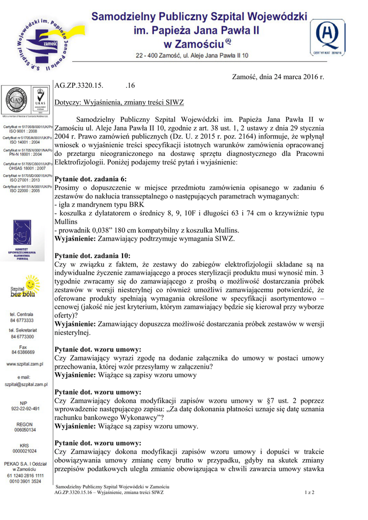 Zamość, dnia 24 marca 2016 r. AG.ZP.3320.15. .16 Dotyczy: Wyjaśnienia, zmiany treści SIWZ Samodzielny Publiczny Szpital Wojewódzki im. Papieża Jana Pawła II w Zamościu ul. Aleje Jana Pawła II 10, zgodnie z art. 38 ust. 1, 2 ustawy z dnia 29 stycznia 2004 r. Prawo zamówień publicznych (Dz. U. z 2015 r. poz. 2164) informuje, że wpłynął wniosek o wyjaśnienie treści specyfikacji istotnych warunków zamówienia opracowanej do przetargu nieograniczonego na dostawę sprzętu diagnostycznego dla Pracowni Elektrofizjologii. Poniżej podajemy treść pytań i wyjaśnienie: Pytanie dot. zadania 6: Prosimy o dopuszczenie w miejsce przedmiotu zamówienia opisanego w zadaniu 6 zestawów do nakłucia transseptalnego o następujących parametrach wymaganych: - igła z mandrynem typu BRK - koszulka z dylatatorem o średnicy 8, 9, 10F i długości 63 i 74 cm o krzywiźnie typu Mullins - prowadnik 0,038” 180 cm kompatybilny z koszulka Mullins. Wyjaśnienie: Zamawiający podtrzymuje wymagania SIWZ. Pytanie dot. zadania 10: Czy w związku z faktem, że zestawy do zabiegów elektrofizjologii składane są na indywidualne życzenie zamawiającego a proces sterylizacji produktu musi wynosić min. 3 tygodnie zwracamy się do zamawiającego z prośbą o możliwość dostarczania próbek zestawów w wersji niesterylnej co również umożliwi zamawiającemu potwierdzić, że oferowane produkty spełniają wymagania określone w specyfikacji asortymentowo – cenowej (jakość nie jest kryterium, którym zamawiający będzie się kierował przy wyborze oferty)? Wyjaśnienie: Zamawiający dopuszcza możliwość dostarczania próbek zestawów w wersji niesterylnej. Pytanie dot. wzoru umowy: Czy Zamawiający wyrazi zgodę na dodanie załącznika do umowy w postaci umowy przechowania, której wzór przesyłamy w załączeniu? Wyjaśnienie: Wiążące są zapisy wzoru umowy Pytanie dot. wzoru umowy: Czy Zamawiający dokona modyfikacji zapisów wzoru umowy w §7 ust. 2 poprzez wprowadzenie następującego zapisu: „Za datę dokonania płatności uznaje się datę uznania rachunku bankowego Wykonawcy”? Wyjaśnienie: Wiążące są zapisy wzoru umowy. Pytanie dot. wzoru umowy: Czy Zamawiający dokona modyfikacji zapisów wzoru umowy i dopuści w trakcie obowiązywania umowy zmianę ceny brutto w przypadku, gdyby na skutek zmiany przepisów podatkowych uległa zmianie obowiązująca w chwili zawarcia umowy stawka Samodzielny Publiczny Szpital Wojewódzki w Zamościu AG.ZP.3320.15.16 – Wyjaśnienie, zmiana treści SIWZ 1z2 podatku VAT? (§12 ust. 3). Wyjaśnienie: Wiążące są zapisy wzoru umowy. Pytanie dot. wzoru umowy: Czy w celu miarkowania kar umownych Zamawiający dokona modyfikacji postanowień projektu przyszłej umowy w zakresie zapisów §9 ust. 1: 1. Sprzedający zapłaci na rzecz Kupującego karę umowną: 1) w przypadku niedotrzymania terminu utworzenia Banku w wysokości 0,2% wartości brutto sprzętu mającego być przedmiotem Banku zgodnie z §2 ust. 1 za każdy dzień roboczy zwłoki, jednak nie więcej niż 10% wartości brutto niedotrzymanego w terminie sprzętu mającego być przedmiotem Banku. 2) w przypadku niedotrzymania terminu wykonania dostawy przedmiotu umowy albo poszczególnych jego części w wysokości 0,2% wartości brutto opóźnionej części dostawy za każdy dzień roboczy zwłoki, jednak nie więcej niż 10% wartości brutto opóźnionej części dostawy. Wyjaśnienie: Wiążące są zapisy wzoru umowy. Jednocześnie, zgodnie z art. 38 ust. 4 ustawy Pzp informujemy, że zostaje zmieniona treść specyfikacji istotnych warunków zamówienia w zakresie opisu przedmioty zamówienia zadania 8. Zamiast opisu: „Parametry wymagane: - cewniki do wprowadzania elektrody ablacyjnej, przynajmniej 4 krzywizny do wyboru, średnica wewn. kompatybilna z cewnikiem 7F.” jest: „Parametry wymagane: - koszulki wprowadzające umożliwiające wprowadzenie elektrody ablacyjnej, przynajmniej 4 krzywizny koszulki do wyboru, średnica wewn. koszulki kompatybilna z cewnikiem ablacyjnym 7F.” Dyrektor Samodzielnego Publicznego Szpitala Wojewódzkiego w Zamościu lek. med. Andrzej Mielcarek Samodzielny Publiczny Szpital Wojewódzki w Zamościu AG.ZP.3320.15.16 – Wyjaśnienie, zmiana treści SIWZ 2z2