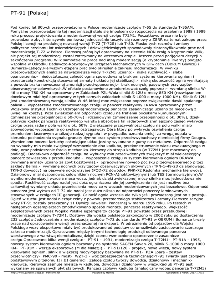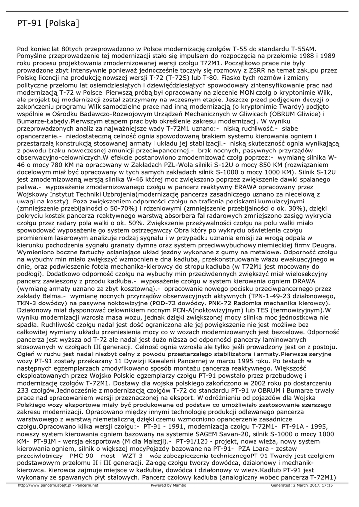 PT-91 [Polska] Pod koniec lat 80tych przeprowadzono w Polsce modernizację czołgów T-55 do standardu T-55AM. Pomyślne przeprowadzenie tej modernizacji stało się impulsem do rozpoczęcia na przełomie 1988 i 1989 roku procesu projektowania zmodernizowanej wersji czołgu T72M1. Początkowo prace nie były prowadzone zbyt intensywnie ponieważ jednocześnie toczyły się rozmowy z ZSRR na temat zakupu przez Polskę licencji na produkcję nowszej wersji T-72 (T-72S) lub T-80. Fiasko tych rozmów i zmiany polityczne przełomu lat osiemdziesiątych i dziewięćdziesiątych spowodowały zintensyfikowanie prac nad modernizacją T-72 w Polsce. Pierwszą próbą był opracowany na zlecenie MON czołg o kryptonimie Wilk, ale projekt tej modernizacji został zatrzymany na wczesnym etapie. Jeszcze przed podjęciem decyzji o zakończeniu programu Wilk samodzielne prace nad inną modernizacją (o kryptonimie Twardy) podjęto wspólnie w Ośrodku Badawczo-Rozwojowym Urządzeń Mechanicznych w Gliwicach (OBRUM Gliwice) i Bumarze-Łabędy.Pierwszym etapem prac było określenie zakresu modernizacji. W wyniku przeprowadzonych analiz za najważniejsze wady T-72M1 uznano:- niską ruchliwość.- słabe opancerzenie.- niedostateczną celność ognia spowodowaną brakiem systemu kierowania ogniem i przestarzałą konstrukcją stosowanej armaty i układu jej stabilizacji.- niską skuteczność ognia wynikającą z powodu braku nowoczesnej amunicji przeciwpancernej.- brak nocnych, pasywnych przyrządów obserwacyjno-celowniczych.W efekcie postanowiono zmodernizować czołg poprzez:- wymianę silnika W46 o mocy 780 KM na opracowany w Zakładach PZL-Wola silniki S-12U o mocy 850 KM (rozwiązaniem docelowym miał być opracowany w tych samych zakładach silnik S-1000 o mocy 1000 KM). Silnik S-12U jest zmodernizowaną wersją silnika W-46 której moc zwiększono poprzez zwiększenie dawki spalanego paliwa.- wyposażenie zmodernizowanego czołgu w pancerz reaktywny ERAWA opracowany przez Wojskowy Instytut Techniki Uzbrojenia(modernizację pancerza zasadniczego uznano za niecelową z uwagi na koszty). Poza zwiększeniem odporności czołgu na trafienia pociskami kumulacyjnymi (zmniejszenie przebijalności o 50-70%) i rdzeniowymi (zmniejszenie przebijalności o ok. 30%), dzięki pokryciu kostek pancerza reaktywnego warstwą absorbera fal radarowych zmniejszono zasięg wykrycia czołgu przez radary pola walki o ok. 50%. Zwiększenie przeżywalności czołgu na polu walki miało spowodować wyposażenie go system ostrzegawczy Obra który po wykryciu oświetlenia czołgu promieniem laserowym analizuje rodzaj sygnału i w przypadku uznania emisji za wrogą odpala w kierunku pochodzenia sygnału granaty dymne oraz system przeciwwybuchowy niemieckiej firmy Deugra. Wymieniono boczne fartuchy osłaniające układ jezdny wykonane z gumy na metalowe. Odporność czołgu na wybuchy min miało zwiększyć wzmocnienie dna kadłuba, przekonstruowanie włazu ewakuacyjnego w dnie, oraz podwieszenie fotela mechanika-kierowcy do stropu kadłuba (w T72M1 jest mocowany do podłogi). Dodatkowo odporność czołgu na wybuchy min przeciwdennych zwiększyć miał wielosekcyjny pancerz zawieszony z przodu kadłuba.- wyposażenie czołgu w system kierowania ogniem DRAWA (wymianę armaty uznano za zbyt kosztowną).- opracowanie nowego pocisku przeciwpancernego przez zakłady Belma.- wymianę nocnych przyrządów obserwacyjnych aktywnych (TPN-1-49-23 działonowego, TKN-3 dowódcy) na pasywne noktowizyjne (POD-72 dowódcy, PNK-72 Radomka mechanika kierowcy). Działonowy miał dysponować celownikiem nocnym PCN-A(noktowizyjnym) lub TES (termowizyjnym).W wyniku modernizacji wzrosła masa wozu, jednak dzięki zwiększonej mocy silnika moc jednostkowa nie spadła. Ruchliwość czołgu nadal jest dość ograniczona ale jej powiększenie nie jest możliwe bez całkowitej wymiany układu przeniesienia mocy co w wozach modernizowanych jest bezcelowe. Odporność pancerza jest wyższa od T-72 ale nadal jest dużo niższa od odporności pancerzy laminowanych stosowanych w czołgach III generacji. Celność ognia wzrosła ale tylko jeśli prowadzony jest on z postoju. Ogień w ruchu jest nadal niezbyt celny z powodu przestarzałego stabilizatora i armaty.Pierwsze seryjne wozy PT-91 zostały przekazany 11 Dywizji Kawalerii Pancernej w marcu 1995 roku. Po testach w następnych egzemplarzach zmodyfikowano sposób montażu pancerza reaktywnego. Większość eksploatowanych przez Wojsko Polskie egzemplarzy czołgu PT-91 powstało przez przebudowę i modernizację czołgów T-72M1. Dostawy dla wojska polskiego zakończono w 2002 roku po dostarczeniu 233 czołgów.Jednocześnie z modernizacją czołgów T-72 do standardu PT-91 w OBRUM i Bumarze trwały prace nad opracowaniem wersji przeznaczonej na eksport. W odróżnieniu od pojazdów dla Wojska Polskiego wozy eksportowe miały być produkowane od podstaw co umożliwiało zastosowanie szerszego zakresu modernizacji. Opracowano między innymi technologię produkcji odlewanego pancerza warstwowego z warstwą niemetaliczną dzięki czemu wzmocniono opancerzenie zasadnicze czołgu.Opracowano kilka wersji czołgu:- PT-91 - 1991, modernizacja czołgu T-72M1- PT-91A - 1995, nowszy system kierowania ogniem bazowany na systemie SAGEM Savan-20, silnik S-1000 o mocy 1000 KM- PT-91M - wersja eksportowa (M dla Malezji).- PT-91/120 - projekt, nowa wieża, nowy system kierowania ogniem, silnik o większej mocyPojazdy bazowane na PT-91- PZA Loara - zestaw przeciwlotniczy- PMC-90 - most- WZT-3 - wóz zabezpieczenia technicznegoPT-91 Twardy jest czołgiem podstawowym przełomu II i III generacji. Załogę czołgu tworzy dowódca, działonowy i mechanikkierowca. Kierowca zajmuje miejsce w kadłubie, dowódca i działonowy w wieży.Kadłub PT-91 jest wykonany ze spawanych płyt stalowych. Pancerz czołowy kadłuba (analogiczny wobec pancerza T-72M1) http://www.pancerni.abajt.pl - Pancerni.net Powered by Mambo Generated: 2 March, 