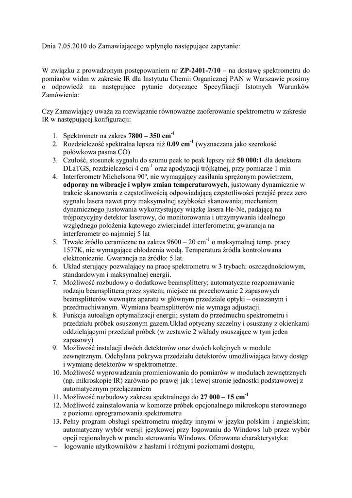 Dnia 7.05.2010 do Zamawiającego wpłynęło następujące zapytanie: W związku z prowadzonym postępowaniem nr ZP-2401-7/10 – na dostawę spektrometru do pomiarów widm w zakresie IR dla Instytutu Chemii Organicznej PAN w Warszawie prosimy o odpowiedź na następujące pytanie dotyczące Specyfikacji Istotnych Warunków Zamówienia: Czy Zamawiający uważa za rozwiązanie równoważne zaoferowanie spektrometru w zakresie IR w następującej konfiguracji: 1. Spektrometr na zakres 7800 – 350 cm-1 2. Rozdzielczość spektralna lepsza niż 0.09 cm-1 (wyznaczana jako szerokość połówkowa pasma CO) 3. Czułość, stosunek sygnału do szumu peak to peak lepszy niż 50 000:1 dla detektora DLaTGS, rozdzielczości 4 cm-1 oraz apodyzacji trójkątnej, przy pomiarze 1 min 4. Interferometr Michelsona 90º, nie wymagający zasilania sprężonym powietrzem, odporny na wibracje i wpływ zmian temperaturowych, justowany dynamicznie w trakcie skanowania z częstotliwością odpowiadającą częstotliwości przejść przez zero sygnału lasera nawet przy maksymalnej szybkości skanowania; mechanizm dynamicznego justowania wykorzystujący wiązkę lasera He-Ne, padającą na trójpozycyjny detektor laserowy, do monitorowania i utrzymywania idealnego względnego położenia kątowego zwierciadeł interferometru; gwarancja na interferometr co najmniej 5 lat 5. Trwałe źródło ceramiczne na zakres 9600 – 20 cm-1 o maksymalnej temp. pracy 1577K, nie wymagające chłodzenia wodą. Temperatura źródła kontrolowana elektronicznie. Gwarancja na źródło: 5 lat. 6. Układ sterujący pozwalający na pracę spektrometru w 3 trybach: oszczędnościowym, standardowym i maksymalnej energii. 7. Możliwość rozbudowy o dodatkowe beamsplittery; automatyczne rozpoznawanie rodzaju beamsplittera przez system; miejsce na przechowanie 2 zapasowych beamsplitterów wewnątrz aparatu w głównym przedziale optyki – osuszanym i przedmuchiwanym. Wymiana beamsplitterów nie wymaga adjustacji. 8. Funkcja autoalign optymalizacji energii; system do przedmuchu spektrometru i przedziału próbek osuszonym gazem.Układ optyczny szczelny i osuszany z okienkami oddzielającymi przedział próbek (w zestawie 2 wkłady osuszające w tym jeden zapasowy) 9. Możliwość instalacji dwóch detektorów oraz dwóch kolejnych w module zewnętrznym. Odchylana pokrywa przedziału detektorów umożliwiająca łatwy dostęp i wymianę detektorów w spektrometrze. 10. Możliwość wyprowadzania promieniowania do pomiarów w modułach zewnętrznych (np. mikroskopie IR) zarówno po prawej jak i lewej stronie jednostki podstawowej z automatycznym przełączaniem 11. Możliwość rozbudowy zakresu spektralnego do 27 000 – 15 cm-1 12. Możliwość zainstalowania w komorze próbek opcjonalnego mikroskopu sterowanego z poziomu oprogramowania spektrometru 13. Pełny program obsługi spektrometru między innymi w języku polskim i angielskim; automatyczny wybór wersji językowej przy logowaniu do Windows lub przez wybór opcji regionalnych w panelu sterowania Windows. Oferowana charakterystyka: logowanie użytkowników z hasłami i różnymi poziomami dostępu, funkcja automatycznego doboru wzmocnienia sygnału, podgląd widm zapisanych na dysku przed ich otwarciem (jak podgląd dokumentów w pakiecie Office), funkcje przetwarzania widma: korekcja linii bazowej – automatyczna i manualna, wygładzanie, dekonwolucja, odejmowanie spektralne, wyznaczanie pochodnych, znajdowanie maksimów, funkcja rozkładu pasm na składowe z algorytmem konwergencji typu FletcherPowell-McCormick, uzględniająca co najmniej następujące typy pasm: Gaussian, Lorentzian, mieszany Gaussian/Lorentzian, Voigt, przeszukiwanie bibliotek w celu identyfikacji widma nieznanej próbki oraz/lub porównania z widmem wzorca, tworzenie własnych bibliotek użytkownika, moduł oprogramowania do analiz chemometrycznych obejmujący algorytmy analizy ilościowej i klasyfikacyjnej: do analiz ilościowych * Prawo Lamberta-Beera * CLS (klasyczna metoda najmniejszych kwadratów) do analiz klasyfikacyjnych * Search Standards (przeszukiwanie biblioteki wzorców z analizą korelacji, także dla pochodnych widm) * Similarity match (wektorowa analiza podobieństwa) * QC compare (analiza korelacyjna widm uśrednionych) moduł do tworzenia i wykonywania makroinstrukcji, moduł spektralnej interpretacji widm, automatyczna korekcja zawartości CO2 i pary wodnej przez oprogramowanie bez konieczności zbierania widm referencyjnych wyświetlanie widm w czasie rzeczywistym (w trakcie pomiaru), automatyczne wykonywanie testów jakości widm z informowaniem użytkownika m.in. o niepożądanych pasmach spektralnych w widmie tła, nieprawidłowym kształcie pasm, obecności pasm całkowicie absorbujących, nachyleniu linii podstawowej, zbyt małej energii interferogramu, aktywna diagnostyka w trakcie pomiaru z ciągłym monitorowaniem stanu elementów systemu i wizualnym wskaźnikiem poprawnej pracy aparatu, wbudowany edytor do tworzenia raportów według własnych szablonów, archiwizowanie gotowych raportów w nieedytowalnych skoroszytach elektronicznych z funkcją przeszukiwania skoroszytów umożliwiającą szybkie dotarcie do każdego raportu w zestawie moduł rozszerzonej analizy widm obejmujący algorytm jednoczesnej wieloskładnikowej identyfikacji widm, pozwalający na identyfikację składników mieszaniny w trakcie pojedynczego przeszukiwania biblioteki, bez konieczności stosowania odejmowania widm poszczególnych składników; Moduł umożliwia przeszukiwanie bibliotek Sadtlera oraz widm zapisanych w co najmniej 5 popularnych formatach widm FTIR zestaw bibliotek widm zawierający biblioteki wysokiej rozdzielczości – ok. 10000 widm m.in. węglowodorów, alkoholi, fenoli, aldehydów, ketonów, estrów, barwników, związków azotu, fosforu i siarki, substancji nieorganicznych, silanów 14. Wysokociśnieniowa przystawka ATR do szybkiego pomiaru próbek z kryształem diamentowym do szybki