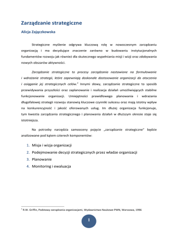 Zarządzanie strategiczne Alicja Zajączkowska Strategiczne myślenie odgrywa kluczową rolę w nowoczesnym zarządzaniu organizacją i ma decydujące znaczenie zarówno w budowaniu instytucjonalnych fundamentów rozwoju jak również dla skutecznego wypełniania misji i wizji oraz zdobywania nowych obszarów aktywności. Zarządzanie strategiczne to procesy zarządzania nastawione na formułowanie i wdrażanie strategii, które zapewniają doskonałe dostosowanie organizacji do otoczenia i osiąganie jej strategicznych celów.1 Innymi słowy, zarządzanie strategiczne to sposób przewidywania przyszłości oraz zaplanowanie i realizacja działao umożliwiających stabilne funkcjonowanie organizacji. Umiejętności prawidłowego planowania i wdrażania długofalowej strategii rozwoju stanowią kluczowe czynniki sukcesu oraz mają istotny wpływ na konkurencyjnośd i jakośd oferowanych usług. Im dłużej organizacja funkcjonuje, tym kwestia zarządzania strategicznego i planowania działao w dłuższym okresie staje się istotniejsza. Na potrzeby narzędzia samooceny pojęcie „zarządzanie strategiczne” będzie analizowane pod kątem czterech komponentów: 1. Misja i wizja organizacji 2. Podejmowanie decyzji strategicznych przez władze organizacji 3. Planowanie 4. Monitoring i ewaluacja 1 R.W. Griffin, Podstawy zarządzania organizacjami, Wydawnictwo Naukowe PWN, Warszawa, 1996 1 Kluczowym etapem zarządzania strategicznego jest planowanie strategiczne, które powinno jednak byd efektem podjętej wcześniej decyzji o tym, jaka jest misja i wizja przyszłości organizacji w oparciu o rzetelną analizę jej funkcjonowania w otoczeniu oraz wewnętrznego potencjału i systemu wartości, którymi się kieruje. Zarządzanie strategiczne wymaga dialogu – szerokiego udziału w podejmowaniu decyzji strategicznych zarówno członków zespołu płatnego jak i wolontariuszy, w tym władz (ustawodawczych, nadzorczych i wykonawczych) organizacji oraz zaangażowania jej kluczowych interesariuszy i klientów. Zarządzanie strategiczne musi mied na stałe wbudowane mechanizmy monitoringu i ewaluacji, które są gwarantem realizacji planów strategicznych i wypełniania misji organizacji. Zarządzanie strategiczne jest procesem ciągłym, który nie ogranicza się tylko do fazy stworzenia dokumentu strategii rozwoju. Planowanie operacyjne w organizacji powinno wynikad ze strategii rozwoju, a nie odwrotnie. Istotą zarządzania strategicznego jest budowanie spójnych, powiązanych z dokumentem strategii, planów operacyjnych oraz stały monitoring osiągania postępów prac i efektów bezpośrednich, a także okresowa ewaluacja efektów odroczonych i ewentualna nowelizacja założeo strategii (ryc. 1). RYC. MECHANIZM ZARZĄDZANIA STRATEGICZNEGO Nowelizacja STRATEGIA ROZWOJU (Diagnoza i Prognoza) EFEKTY ODROCZONE Wdrażanie Strategii Realizacja Plany roczne Programy Projekty Monitoring Opracowanie: Alicja Zajączkowska 2 EFEKTY BEZPOŚREDNIE Ewaluacja PLANY OPERACYJNE Można wyróżnid trzy zasadnicze etapy procesu zarządzania strategicznego: 1. Analiza i planowanie strategiczne. 2. Wdrażanie strategii. 3. Ocena strategii i ewentualna nowelizacja. MISJA I WIZJA Analiza strategiczna poprzedzająca etap planowania strategicznego powinna rozpocząd się od zweryfikowania, czy i w jakim zakresie funkcjonująca definicja misji i wizji organizacji oraz jej system wartości są jednakowo utożsamiane przez wszystkich członków i członkinie zespołu i kluczowych interesariuszy. Istotne jest, aby w formułowaniu spisanej misji i wizji uczestniczyli obecnie działający członkowie i członkinie organizacji, a przynajmniej, aby się zgadzali i utożsamiali z jej treścią. Dlatego najlepiej, by znajomośd misji i wizji wśród zespołu i kluczowych interesariuszy była powszechna. Misja powinna odzwierciedlad trzy zasady: 1. Zwięzłośd – krótka formuła, łatwa do zrozumienia i zapamiętania 2. Elastycznośd – możliwośd dostosowania się do różnych sytuacji 3. Oryginalnośd – to, co wyróżnia organizację od innych działających w podobnej branży Struktura i treśd misji definiuje cele istnienia organizacji, komu służy organizacja, jakimi wartościami się kieruje, jakie ma kompetencje do realizacji swoich zamierzeo. Misja jest rozumiana jako posłannictwo, racja bytu organizacji – ważna rola organizacji w odniesieniu do wizji. Misja organizacji jest zgodna ze statutem. Treśd wizji zawiera opis wizerunku organizacji w przyszłości – obraz przyszłości, którą osoby uczestniczące w organizacji chcą wykreowad. 3 Wartości w organizacji to kolejny element analizy strategicznej, który powinien zostad poddany ocenie. Każda organizacja posiada własną kulturę – systemy wartości i norm podzielanych zbiorowo przez członków i członkinie organizacji. Kultura organizacji jest wypadkową zarówno działao przemyślanych i zamierzonych, np. spisany kodeks etyczny, standardy organizacji, jak i przypadkowych, zawiera elementy formalne i nieformalne. Zgodnie z definicją S.R. Olsona2, Kultura organizacji to zbiór norm, zachowao, pojęd, wartości, rytuałów i ceremonii, postaw i przekonao podzielanych przez członków danej organizacji. Kultura ta czasem tworzona jest przez założycieli organizacji, kiedy indziej powstaje stopniowo, w miarę jak organizacja rozwija się, wchodzi w relacje z otoczeniem, a jej członkowie muszą podejmowad różnorodne decyzje. Wyrazistośd i wyjątkowośd kultury organizacji pomaga eliminowad niepewnośd, zapewniając wszystkim jeden system interpretacji. Tworzy porządek społeczny przez jasne określenie, czego oczekuje się od osób w organizacji. Gwarantuje ciągłośd, co powoduje, że kolejne pokolenia uczestników i uczestniczek organizacji wyznają te same podstawowe wartości stosują te same zasady, budują jej tożsamośd i wspólne zaangażowanie.3 Istniejąca kultura organizacji może byd zarówno przeszkodą, jak i znaczącą zaletą