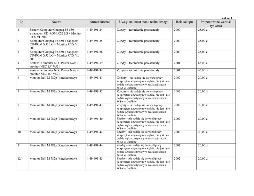 Zał. nr 1 Lp. 1 Nazwa Numer inwent. Uwagi na temat stanu technicznego Rok zakupu Proponowana wartość rynkowa 4-49-491-24 Zużyty – technicznie przestarzały 2000 25,00 zł 4-49-491-25 Zużyty – technicznie przestarzały 2000 25,00 zł 4-49-491-26 Zużyty – technicznie przestarzały 2000 25,00 zł 4-49-491-39 Zużyty – technicznie przestarzały 2001 65,00 zł 4-49-491-34 Zużyty – technicznie przestarzały 2001 65,00 zł 6 Zestaw:Komputer Compaq P3-550 z napędem CD-ROM X52 LG + Monitor CTX VL 500 Komputer Compaq P3-550 z napędem CD-ROM X52 LG + Monitor CTX VL 500 Komputer Compaq P3-550 z napędem CD-ROM X52 LG + Monitor CTX VL 500 Zestaw: Komputer NEC Power Nate + monitor NEC 15” V521 Zestaw: Komputer NEC Power Nate + monitor NEC 15” V521 Monitor Dell M 782p (kineskopowy) 4-49-491-41 2002 20,00 zł 7 Monitor Dell M 782p (kineskopowy) 4-49-491-52 2002 20,00 zł 8 Monitor Dell M 782p (kineskopowy) 4-49-491-43 2002 20,00 zł 9 Monitor Dell M 782p (kineskopowy) 4-49-491-40 2002 20,00 zł 10 Monitor Dell M 782p (kineskopowy) 4-49-491-42 2002 20,00 zł 11 Monitor Dell M 782p (kineskopowy) 4-49-491-44 2002 20,00 zł 12 Monitor Dell M 782p (kineskopowy) 4-49-491-45 Zbędny – nie nadaje się do współpracy ze sprzętem używanym w sądzie, nie jest i nie będzie wykorzystywany w realizacji zadań WSA w Lublinie Zbędny – nie nadaje się do współpracy ze sprzętem używanym w sądzie, nie jest i nie będzie wykorzystywany w realizacji zadań WSA w Lublinie Zbędny – nie nadaje się do współpracy ze sprzętem używanym w sądzie, nie jest i nie będzie wykorzystywany w realizacji zadań WSA w Lublinie Zbędny – nie nadaje się do współpracy ze sprzętem używanym w sądzie, nie jest i nie będzie wykorzystywany w realizacji zadań WSA w Lublinie Zbędny – nie nadaje się do współpracy ze sprzętem używanym w sądzie, nie jest i nie będzie wykorzystywany w realizacji zadań WSA w Lublinie Zbędny – nie nadaje się do współpracy ze sprzętem używanym w sądzie, nie jest i nie będzie wykorzystywany w realizacji zadań WSA w Lublinie Zbędny – nie nadaje się do współpracy ze sprzętem używanym w sądzie, nie jest i nie będzie wykorzystywany w realizacji zadań WSA w Lublinie 2002 20,00 zł 2 3 4 5 Zbędny – nie nadaje się do współpracy ze sprzętem używanym w sądzie, nie jest i nie będzie wykorzystywany w realizacji zadań WSA w Lublinie Zbędny – nie nadaje się do współpracy ze sprzętem używanym w sądzie, nie jest i nie będzie wykorzystywany w realizacji zadań WSA w Lublinie Zbędny – nie nadaje się do współpracy ze sprzętem używanym w sądzie, nie jest i nie będzie wykorzystywany w realizacji zadań WSA w Lublinie Zbędny – nie nadaje się do współpracy ze sprzętem używanym w sądzie, nie jest i nie będzie wykorzystywany w realizacji zadań WSA w Lublinie Zbędny – nie nadaje się do współpracy ze sprzętem używanym w sądzie, nie jest i nie będzie wykorzystywany w realizacji zadań WSA w Lublinie Zbędny – nie nadaje się do współpracy ze sprzętem używanym w sądzie, nie jest i nie będzie wykorzystywany w realizacji zadań WSA w Lublinie Zbędny – nie nadaje się do współpracy ze sprzętem używanym w sądzie, nie jest i nie będzie wykorzystywany w realizacji zadań WSA w Lublinie Zużyty – technicznie przestarzały Zużyty – technicznie przestarzały Zbędny – nie nadaje się do współpracy ze sprzętem używanym w sądzie, nie jest i nie będzie wykorzystywany w realizacji zadań WSA w Lublinie 2002 20,00 zł 2002 20,00 zł 2002 20,00 zł 2002 20,00 zł 2002 20,00 zł 2002 20,00 zł 2002 20,00 zł 1997 1997 2001 60,00 zł 60,00 zł 80,00 zł 4-49-491-280 Zbędny - urządzenie nie spełnia wymogów stawianych sprzętowi komputerowemu WSA w Lublinie, uszkodzony podajnik papieru 1998 40,00 zł 4-49-491-281 Zbędny - urządzenie nie spełnia wymogów stawianych sprzętowi komputerowemu WSA w Lublinie, uszkodzony podajnik papieru 1998 40,00 zł 13 Monitor Dell M 782p (kineskopowy) 4-49-491-46 14 Monitor Dell M 782p (kineskopowy) 4-49-491-47 15 Monitor Dell M 782p (kineskopowy) 4-49-491-48 16 Monitor Dell M 782p (kineskopowy) 4-49-491-49 17 Monitor Dell M 782p (kineskopowy) 4-49-491-50 18 Monitor Dell M 782p (kineskopowy) 4-49-491-51 19 Monitor Dell M 782p (kineskopowy) 4-49-491-53 20 21 22 Drukarka OKI ML 3321 Drukarka OKI ML 3321 Drukarka OKI 9 PIN ML Elite 15 4-49-491-8 4-49-491-11 4-49-491-290 23 Drukarka HP Laserjet 6L 24 Drukarka HP Laserjet 6L 25 Drukarka HP Laserjet 6L 4-49-491-282 26 Drukarka HP Laserjet 6L 4-49-491-283 27 Drukarka HP Laserjet 6L 4-49-491-284 28 Drukarka HP Laserjet 6L 4-49-491-285 29 Stolik okolicznościowy Dz I-10-166 30 31 32 33 34 35 36 37 38 39 40 Telefon Eurit 25 (systemowy ISDN) Telefon Eurit 25 (systemowy ISDN) Telefon Eurit 25 (systemowy ISDN) Telefon Eurit 25 (systemowy ISDN) Telefon Eurit 25 (systemowy ISDN) Telefon Eurit 25 (systemowy ISDN) Telefon Eurit 25 (systemowy ISDN) Telefon Eurit 25 (systemowy ISDN) Telefon Eurit 25 (systemowy ISDN) Telefon Eurit 25 (systemowy ISDN) Telefax Panasonic KX-FC 238 Dz III-1-35 Dz III-1-31 Dz III-1-37 Dz III-1-42 Dz III-1-43 Dz III-1-44 Dz III-1-45 Dz III-1-48 Dz III-1-53 Dz III-1-55 Dz III-1-16 Zbędny - urządzenie nie spełnia wymogów stawianych sprzętowi komputerowemu WSA w Lublinie, uszkodzony podajnik papieru Zbędny - urządzenie nie spełnia wymogów stawianych sprzętowi komputerowemu WSA w Lublinie, uszkodzony podajnik papieru Zbędny - urządzenie nie spełnia wymogów stawianych sprzętowi komputerowemu WSA w Lublinie, uszkodzony podajnik papieru Zbędny - urządzenie nie spełnia wymogów stawianych sprzętowi komputerowemu WSA w Lublinie, uszkodzony podajnik papieru Zbędny – nie jest i nie będzie wykorzystywany w jednostce Zużyty – technicznie przestarzały Zużyty – technicznie przestarzały Zużyty – technicznie przestarzały Zużyty – technicznie przestarzały Zużyty – technicznie przesta