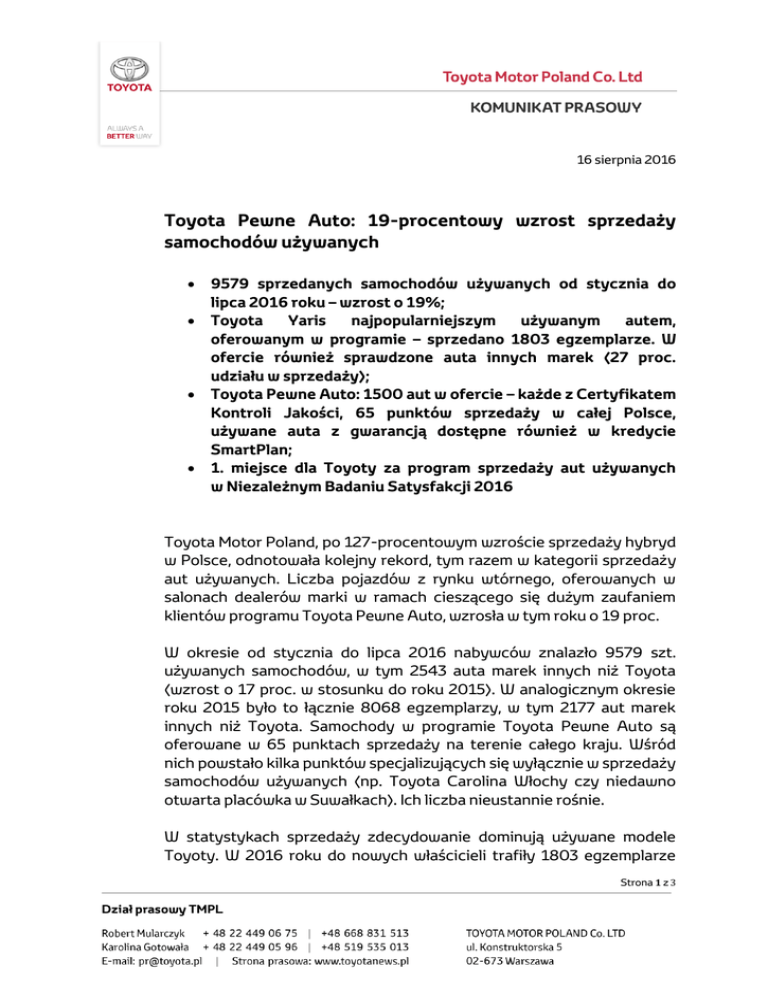 16 sierpnia 2016 Toyota Pewne Auto: 19-procentowy wzrost sprzedaży samochodów używanych 9579 sprzedanych samochodów używanych od stycznia do lipca 2016 roku – wzrost o 19%; Toyota Yaris najpopularniejszym używanym autem, oferowanym w programie – sprzedano 1803 egzemplarze. W ofercie również sprawdzone auta innych marek (27 proc. udziału w sprzedaży); Toyota Pewne Auto: 1500 aut w ofercie – każde z Certyfikatem Kontroli Jakości, 65 punktów sprzedaży w całej Polsce, używane auta z gwarancją dostępne również w kredycie SmartPlan; 1. miejsce dla Toyoty za program sprzedaży aut używanych w Niezależnym Badaniu Satysfakcji 2016 Toyota Motor Poland, po 127-procentowym wzroście sprzedaży hybryd w Polsce, odnotowała kolejny rekord, tym razem w kategorii sprzedaży aut używanych. Liczba pojazdów z rynku wtórnego, oferowanych w salonach dealerów marki w ramach cieszącego się dużym zaufaniem klientów programu Toyota Pewne Auto, wzrosła w tym roku o 19 proc. W okresie od stycznia do lipca 2016 nabywców znalazło 9579 szt. używanych samochodów, w tym 2543 auta marek innych niż Toyota (wzrost o 17 proc. w stosunku do roku 2015). W analogicznym okresie roku 2015 było to łącznie 8068 egzemplarzy, w tym 2177 aut marek innych niż Toyota. Samochody w programie Toyota Pewne Auto są oferowane w 65 punktach sprzedaży na terenie całego kraju. Wśród nich powstało kilka punktów specjalizujących się wyłącznie w sprzedaży samochodów używanych (np. Toyota Carolina Włochy czy niedawno otwarta placówka w Suwałkach). Ich liczba nieustannie rośnie. W statystykach sprzedaży zdecydowanie dominują używane modele Toyoty. W 2016 roku do nowych właścicieli trafiły 1803 egzemplarze Strona 1 z 3 modelu Yaris, 1558 Aurisów, 1185 Avensisów, 1160 Corolli oraz 427 sztuk modelu RAV4. Program Toyota Pewne Auto obejmuje także samochody innych marek. Ich udział w sprzedaży sięga 27 proc. Do dealerów trafiają przede wszystkim w rozliczeniu, przy sprzedaży nowych Toyot. Średni wiek sprzedawanych w ramach tego programu samochodów to 5 lat. Pewne Auto to także największa oferta używanych aut na stronach programów importerskich w Polsce. Pod adresem www.toyota.pewneauto.pl dostępnych jest ok. 1500 ofert. Pewne Auto z Certyfikatem Kontroli Jakości Toyota Pewne Auto to nie tylko nazwa programu, ale też gwarancja jakości oferowanych w nim, używanych samochodów. System kontroli jakości jest jednolity dla całej sieci Toyoty w Polsce. Oceny pojazdu dokonują wykwalifikowani mechanicy, przy użyciu ścieżki diagnostycznej i z wykorzystaniem specjalistycznych narzędzi. Każdy pojazd podlega identycznej weryfikacji, która znajduje potwierdzenie w specjalnym dokumencie. Wystawiany na zakończenie tej procedury Certyfikat Kontroli Jakości jest świadectwem przeprowadzenia wielopunktowego, szczegółowego badania pojazdu. Każdy samochód, który trafia do sprzedaży w ramach programu, przechodzi skrupulatny przegląd, obejmujący sprawdzenie stanu karoserii i wnętrza pojazdu oraz wszystkich jego układów z kontrolą ich działania. Weryfikowana jest zgodność numeru nadwozia z dokumentami, sprawdzana szczelność układów, funkcjonowanie silnika i układu przeniesienia napędu, geometria zawieszenia, działanie i ustawienie świateł. Szczególną uwagę przywiązuje się do sprawdzenia elementów kluczowych dla bezpieczeństwa, takich jak układ hamulcowy i kierowniczy czy pasy bezpieczeństwa. Wykonywana jest jazda próbna oraz testy na ścieżce diagnostycznej. Pewne Auto z gwarancją i finansowaniem SmartPlan Najlepsze z weryfikowanych w ten sposób pojazdów – w wieku nawet do 7 lat i o przebiegu nie większym, niż 200 000 km – są dodatkowo obejmowane 12-miesięczną gwarancją. Co więcej, ochrona dotyczy także pojazdów marek innych niż Toyota, które pozytywnie przeszły Strona 2 z 3 weryfikację. W okresie gwarancji używany pojazd – podobnie jak nowe auto – podlega okresowym przeglądom technicznym. Zakup samochodu w programie Pewne Auto może być finansowany w leasingu lub kredytem SmartPlan dla samochodów używanych w ramach pierwszej na rynku oferty połączenia niskich rat oraz cyklicznej wymiany samochodu na kolejny używany lub nowy. SmartPlan dla samochodów używanych to rata niższa nawet o 40%, niska wpłata własna (już od 10%) i oprocentowanie na 36 lub 48 miesięcy 6,99%. W ramach SmartPlanu można finansować samochody w wieku do 5 lat i wymieniać je co 3-4 lata. Pewne Auto z najwyższym poziomem satysfakcji Program sprzedaży samochodów używanych Pewne Auto, kolejny raz został najlepiej oceniony przez dealerów, biorących udział w Niezależnym Badaniu Satysfakcji 2016, przygotowanym przez DCG Dealer Consulting, pod patronatem Związku Dealerów Samochodów i Polskiej Izby Motoryzacji. W IX edycji badania zajął 1. miejsce, zdobywając 4 punkty (miejsce 2. – 3,28 pkt., miejsce 3. – 3,23 pkt.), co oznacza zdecydowaną przewagę nad innymi markami i potwierdza, że Toyota Pewne Auto to obecnie najlepszy tego rodzaju program w Polsce. Wielokrotnie był również pozytywnie oceniany w motoryzacyjnej prasie branżowej za przyjazną w obsłudze i czytelną stronę z dużą liczbą ofert. Strona 3 z 3