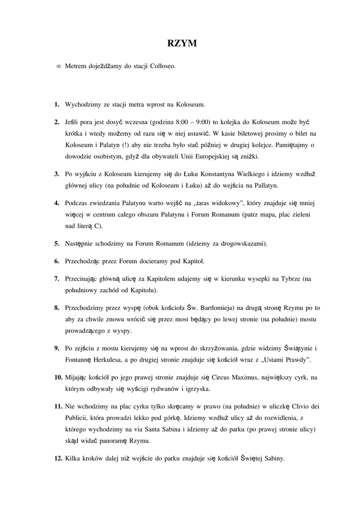 RZYM • Metrem dojeżdżamy do stacji Colloseo. 1. Wychodzimy ze stacji metra wprost na Koloseum. 2. Jeśli pora jest dosyć wczesna (godzina 8:00 – 9:00) to kolejka do Koloseum może być krótka i wtedy możemy od razu się w niej ustawić. W kasie biletowej prosimy o bilet na Koloseum i Palatyn (!) aby nie trzeba było stać później w drugiej kolejce. Pamiętajmy o dowodzie osobistym, gdyż dla obywateli Unii Europejskiej są zniżki. 3. Po wyjściu z Koloseum kierujemy się do Łuku Konstantyna Wielkiego i idziemy wzdłuż głównej ulicy (na południe od Koloseum i Łuku) aż do wejścia na Pallatyn. 4. Podczas zwiedzania Palatynu warto wejść na „taras widokowy”, który znajduje się mniej więcej w centrum całego obszaru Palatynu i Forum Romanum (patrz mapa, plac zieleni nad literą C). 5. Następnie schodzimy na Forum Romanum (idziemy za drogowskazami). 6. Przechodząc przez Forum docieramy pod Kapitol. 7. Przecinając główną ulicę za Kapitolem udajemy się w kierunku wysepki na Tybrze (na południowy zachód od Kapitolu). 8. Przechodzimy przez wyspę (obok kościoła Św. Bartłomieja) na drugą stronę Rzymu po to aby za chwile znowu wrócić się przez most będący po lewej stronie (na południe) mostu prowadzącego z wyspy. 9. Po zejściu z mostu kierujemy się na wprost do skrzyżowania, gdzie widzimy Świątynie i Fontannę Herkulesa, a po drugiej stronie znajduje się kościół wraz z „Ustami Prawdy”. 10. Mijając kościół po jego prawej stronie znajduje się Circus Maximus, największy cyrk, na którym odbywały się wyścigi rydwanów i igrzyska. 11. Nie wchodzimy na plac cyrku tylko skręcamy w prawo (na południe) w uliczkę Clivio dei Publicii, która prowadzi lekko pod górkę. Idziemy wzdłuż ulicy aż do rozwidlenia, z którego wychodzimy na via Santa Sabina i idziemy aż do parku (po prawej stronie ulicy) skąd widać panoramę Rzymu. 12. Kilka kroków dalej niż wejście do parku znajduje się kościół Świętej Sabiny. 13. W drodze powrotnej z parku (lub kościoła) poruszamy się na południowy wschód do metra Circus Maximus (albo wracamy drogą jaką przyszliśmy od Circus Maximus i idziemy wzdłuż cyrku do metra). Trasa piesza: • około 6km (od wyjścia z metra przy Koloseum aż do wejścia do metra przy Circus Maximus). Czas wyprawy: • około 10h (w dużej mierze zależy od długości kolejki do Koloseum, dużo przystanków w cieniu, jedzenie po wyjściu z Forum Romanum) Mapa trasy wraz z zaznaczonymi głównymi zabytkami