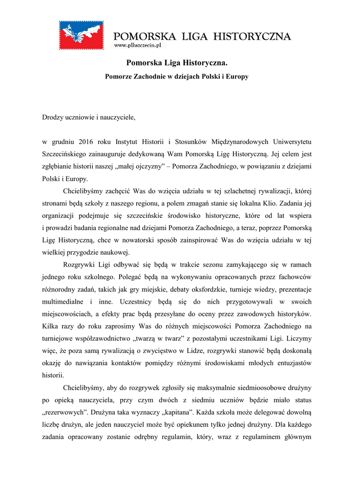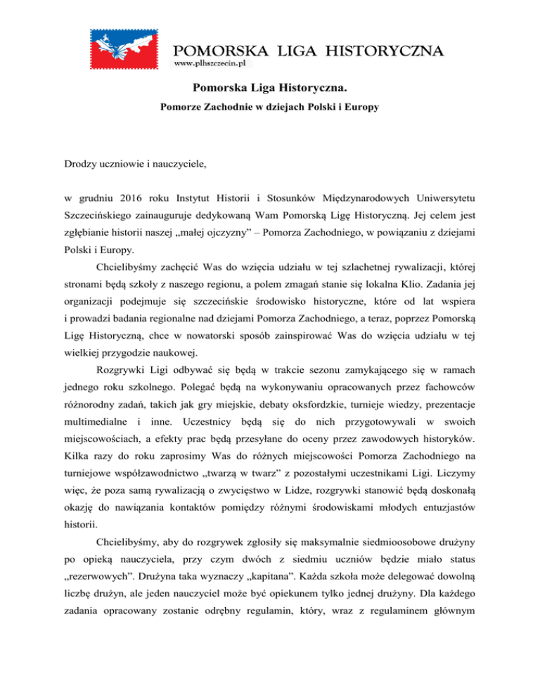 Pomorska Liga Historyczna. Pomorze Zachodnie w dziejach Polski i Europy Drodzy uczniowie i nauczyciele, w grudniu 2016 roku Instytut Historii i Stosunków Międzynarodowych Uniwersytetu Szczecińskiego zainauguruje dedykowaną Wam Pomorską Ligę Historyczną. Jej celem jest zgłębianie historii naszej „małej ojczyzny” – Pomorza Zachodniego, w powiązaniu z dziejami Polski i Europy. Chcielibyśmy zachęcić Was do wzięcia udziału w tej szlachetnej rywalizacji, której stronami będą szkoły z naszego regionu, a polem zmagań stanie się lokalna Klio. Zadania jej organizacji podejmuje się szczecińskie środowisko historyczne, które od lat wspiera i prowadzi badania regionalne nad dziejami Pomorza Zachodniego, a teraz, poprzez Pomorską Ligę Historyczną, chce w nowatorski sposób zainspirować Was do wzięcia udziału w tej wielkiej przygodzie naukowej. Rozgrywki Ligi odbywać się będą w trakcie sezonu zamykającego się w ramach jednego roku szkolnego. Polegać będą na wykonywaniu opracowanych przez fachowców różnorodny zadań, takich jak gry miejskie, debaty oksfordzkie, turnieje wiedzy, prezentacje multimedialne i inne. Uczestnicy będą się do nich przygotowywali w swoich miejscowościach, a efekty prac będą przesyłane do oceny przez zawodowych historyków. Kilka razy do roku zaprosimy Was do różnych miejscowości Pomorza Zachodniego na turniejowe współzawodnictwo „twarzą w twarz” z pozostałymi uczestnikami Ligi. Liczymy więc, że poza samą rywalizacją o zwycięstwo w Lidze, rozgrywki stanowić będą doskonałą okazję do nawiązania kontaktów pomiędzy różnymi środowiskami młodych entuzjastów historii. Chcielibyśmy, aby do rozgrywek zgłosiły się maksymalnie siedmioosobowe drużyny po opieką nauczyciela, przy czym dwóch z siedmiu uczniów będzie miało status „rezerwowych”. Drużyna taka wyznaczy „kapitana”. Każda szkoła może delegować dowolną liczbę drużyn, ale jeden nauczyciel może być opiekunem tylko jednej drużyny. Dla każdego zadania opracowany zostanie odrębny regulamin, który, wraz z regulaminem głównym i harmonogramem, zostanie upubliczniony na stronie www.plhszczecin.pl. Na tejże stronie, w formie ligowej tabeli, podawane będą też w na bieżąco wyniki rywalizacji. Każdego roku w czerwcu odbędzie się wielki finał i podsumowanie, na którym wręczone zostaną nagrody dla zwycięzców. Oprócz atrakcyjnych nagród rzeczowych, najlepsi zostaną zabrani na kilkudniową wycieczkę naukową po historycznym Pomorzu. Zwycięska szkoła otrzyma także przechodni puchar. Po trzech wygranych sezonach przejdzie on na własność danej szkoły. Sekretarzem Ligi i osobą, która odpowie na wszystkie Wasze pytania jest Joanna Morawska (email: [email protected]). Audaces fortuna iuvat decoratque coronat !!!