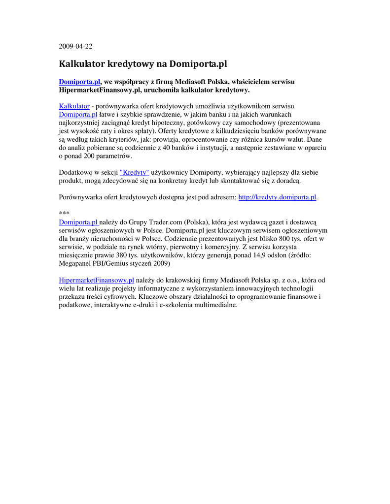 2009-04-22 Kalkulator kredytowy na Domiporta.pl Domiporta.pl, we współpracy z firmą Mediasoft Polska, właścicielem serwisu HipermarketFinansowy.pl, uruchomiła kalkulator kredytowy. Kalkulator - porównywarka ofert kredytowych umożliwia użytkownikom serwisu Domiporta.pl łatwe i szybkie sprawdzenie, w jakim banku i na jakich warunkach najkorzystniej zaciągnąć kredyt hipoteczny, gotówkowy czy samochodowy (prezentowana jest wysokość raty i okres spłaty). Oferty kredytowe z kilkudziesięciu banków porównywane są według takich kryteriów, jak: prowizja, oprocentowanie czy różnica kursów walut. Dane do analiz pobierane są codziennie z 40 banków i instytucji, a następnie zestawiane w oparciu o ponad 200 parametrów. Dodatkowo w sekcji "Kredyty" użytkownicy Domiporty, wybierający najlepszy dla siebie produkt, mogą zdecydować się na konkretny kredyt lub skontaktować się z doradcą. Porównywarka ofert kredytowych dostępna jest pod adresem: http://kredyty.domiporta.pl. *** Domiporta.pl należy do Grupy Trader.com (Polska), która jest wydawcą gazet i dostawcą serwisów ogłoszeniowych w Polsce. Domiporta.pl jest kluczowym serwisem ogłoszeniowym dla branży nieruchomości w Polsce. Codziennie prezentowanych jest blisko 800 tys. ofert w serwisie, w podziale na rynek wtórny, pierwotny i komercyjny. Z serwisu korzysta miesięcznie prawie 380 tys. użytkowników, którzy generują ponad 14,9 odsłon (źródło: Megapanel PBI/Gemius styczeń 2009) HipermarketFinansowy.pl należy do krakowskiej firmy Mediasoft Polska sp. z o.o., która od wielu lat realizuje projekty informatyczne z wykorzystaniem innowacyjnych technologii przekazu treści cyfrowych. Kluczowe obszary działalności to oprogramowanie finansowe i podatkowe, interaktywne e-druki i e-szkolenia multimedialne.