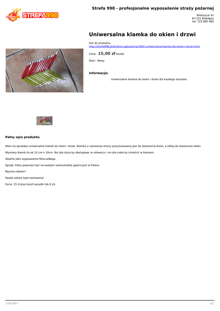 Strefa 998 - profesjonalne wyposażenie straży pożarnej Wietszyce 41 67-221 Białołęka tel: 723 895 900 Uniwersalna klamka do okien i drzwi link do produktu: http://strefa998.pl/drobne-ogloszenia/1602-uniwersalna-klamka-do-okien-i-drzwi.html Cena: 15,00 zł brutto Stan: Nowy Informacje: Uniwersalna klamka do okien i drzwi dla kazdego strazaka Pełny opis produktu Mam na sprzedaz uniwersalne klamki do okien i drzwi. Klamka z czerwonej strony przystosowana jest do otwierania drzwi, a zóltej do otwierania okien. Wymiary klamki to ok.10 cm x 10cm. Na tyle duza by obslugiwac w rekawicy i na tyle mala by zmieścić w kieszeni. Idealna jako wyposazenie RescueBaga. Sprzęt, który powinien być na kazdym samochodzie gaśniczym w Polsce. Ręczna robota!! Kazda sztuka byla testowana! Cena: 15 zl plus koszt wysylki (ok.4 zl). 2-03-2017 1/1