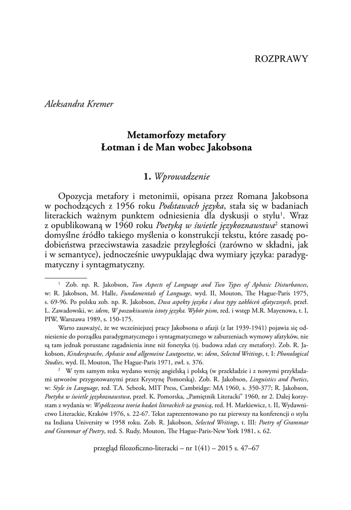 Metamorfozy metafory Łotman i de Man wobec Jakobsona