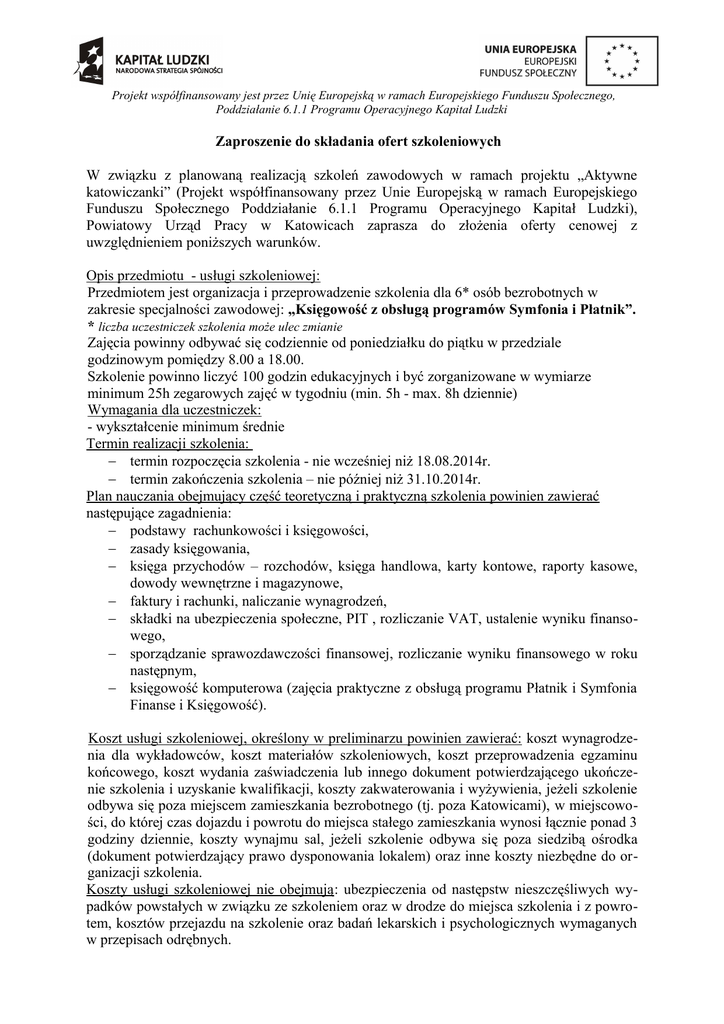 Projekt współfinansowany jest przez Unię Europejską w ramach Europejskiego Funduszu Społecznego, Poddziałanie 6.1.1 Programu Operacyjnego Kapitał Ludzki Zaproszenie do składania ofert szkoleniowych W związku z planowaną realizacją szkoleń zawodowych w ramach projektu „Aktywne katowiczanki” (Projekt współfinansowany przez Unie Europejską w ramach Europejskiego Funduszu Społecznego Poddziałanie 6.1.1 Programu Operacyjnego Kapitał Ludzki), Powiatowy Urząd Pracy w Katowicach zaprasza do złożenia oferty cenowej z uwzględnieniem poniższych warunków. Opis przedmiotu - usługi szkoleniowej: Przedmiotem jest organizacja i przeprowadzenie szkolenia dla 6* osób bezrobotnych w zakresie specjalności zawodowej: „Księgowość z obsługą programów Symfonia i Płatnik”. * liczba uczestniczek szkolenia może ulec zmianie Zajęcia powinny odbywać się codziennie od poniedziałku do piątku w przedziale godzinowym pomiędzy 8.00 a 18.00. Szkolenie powinno liczyć 100 godzin edukacyjnych i być zorganizowane w wymiarze minimum 25h zegarowych zajęć w tygodniu (min. 5h - max. 8h dziennie) Wymagania dla uczestniczek: - wykształcenie minimum średnie Termin realizacji szkolenia: termin rozpoczęcia szkolenia - nie wcześniej niż 18.08.2014r. termin zakończenia szkolenia – nie później niż 31.10.2014r. Plan nauczania obejmujący część teoretyczną i praktyczną szkolenia powinien zawierać następujące zagadnienia: podstawy rachunkowości i księgowości, zasady księgowania, księga przychodów – rozchodów, księga handlowa, karty kontowe, raporty kasowe, dowody wewnętrzne i magazynowe, faktury i rachunki, naliczanie wynagrodzeń, składki na ubezpieczenia społeczne, PIT , rozliczanie VAT, ustalenie wyniku finansowego, sporządzanie sprawozdawczości finansowej, rozliczanie wyniku finansowego w roku następnym, księgowość komputerowa (zajęcia praktyczne z obsługą programu Płatnik i Symfonia Finanse i Księgowość). Koszt usługi szkoleniowej, określony w preliminarzu powinien zawierać: koszt wynagrodzenia dla wykładowców, koszt materiałów szkoleniowych, koszt przeprowadzenia egzaminu końcowego, koszt wydania zaświadczenia lub innego dokument potwierdzającego ukończenie szkolenia i uzyskanie kwalifikacji, koszty zakwaterowania i wyżywienia, jeżeli szkolenie odbywa się poza miejscem zamieszkania bezrobotnego (tj. poza Katowicami), w miejscowości, do której czas dojazdu i powrotu do miejsca stałego zamieszkania wynosi łącznie ponad 3 godziny dziennie, koszty wynajmu sal, jeżeli szkolenie odbywa się poza siedzibą ośrodka (dokument potwierdzający prawo dysponowania lokalem) oraz inne koszty niezbędne do organizacji szkolenia. Koszty usługi szkoleniowej nie obejmują: ubezpieczenia od następstw nieszczęśliwych wypadków powstałych w związku ze szkoleniem oraz w drodze do miejsca szkolenia i z powrotem, kosztów przejazdu na szkolenie oraz badań lekarskich i psychologicznych wymaganych w przepisach odrębnych. Warunki udziału w postępowaniu: wpis do Rejestru Instytucji Szkoleniowych zaktualizowany na rok 2014r. wiedza i doświadczenie w realizacji szkoleń zawodowych w szczególności w zakresie objętym niniejszym zaproszeniem Dokumenty wymagane do złożenia w ofercie szkoleniowej: program szkolenia (wg wzoru) harmonogram szkolenia (wg wzoru) preliminarz szkolenia (wg wzoru) referencje potwierdzające doświadczenie ośrodka szkoleniowego w realizacji szkolenia w zakresie, którego ośrodek składa ofertę szkoleniową (kopie potwierdzone za zgodność z oryginałem) wzór zaświadczenia lub innego dokumentu potwierdzającego ukończenie szkolenia i uzyskanie umiejętności lub kwalifikacji, o ile przepisy odrębne nie stanowią inaczej, zawierający: numer z rejestru, imię i nazwisko oraz PESEL uczestnika szkolenia, nazwę instytucji szkoleniowej przeprowadzającej szkolenie, formę i nazwę szkolenia, okres trwania szkolenia, miejsce i datę wydania zaświadczenia, tematy i wymiar godzin zajęć edukacyjnych, podpis osoby upoważnionej przez instytucję przeprowadzającą szkolenie; zaświadczenie powinno być opatrzone logotypami projektu pisemną informację nt. dostosowania kwalifikacji i doświadczenia kadry dydaktycznej do zakresu szkolenia oświadczenie o aktualnym wpisie do Rejestru Instytucji Szkoleniowych certyfikaty jakości usług/akredytacje posiadane przez instytucję szkoleniową (kopie potwierdzone za zgodność z oryginałem) wydruk z Centralnej Ewidencji i Informacji o Działalności Gospodarczej lub z Krajowego Rejestru Sądowego o prowadzeniu działalności gospodarczej w zakresie usług szkoleniowych lub pozostałych pozaszkolnych form edukacji pełnomocnictwo do podpisania umowy szkoleniowej z Powiatowym Urzędem Pracy w Katowicach, jeśli osoba wyznaczona do podpisu umowy nie jest wskazana w dokumentach rejestrowych firmy jako jej reprezentant Kryteria wyboru instytucji szkoleniowej, której zlecone zostanie przeprowadzenie szkolenia zawodowego: jakość oferowanego programu szkolenia sposób organizacji zajęć praktycznych dostosowanie kwalifikacji i doświadczenia kadry dydaktycznej do zakresu szkolenia dostosowanie wyposażenia dydaktycznego i pomieszczeń do potrzeb szkolenia posiadanie przez instytucję szkoleniową certyfikaty jakości usług / akredytacja koszt szkolenia dostępność miejsca szkolenia dla jego uczestniczek Miejsce składania ofert szkoleniowych: Biuro podawcze Powiatowego Urzędu Pracy w Katowicach, ul. Pośpiecha 14. Termin składania ofert szkoleniowych: do dnia 25.07.2014r. (termin składania ofert może zostać przedłużony). Niniejsze postępowanie jest prowadzone z wyłączeniem przepisów ustawy Prawo zamówień publicznych (Dz. U. Z 2013r., poz. 907 z późn. zm.). Złożenie oferty szkoleniowej nie jest traktowane jako zlecenie wykonania usługi szkoleniowej.