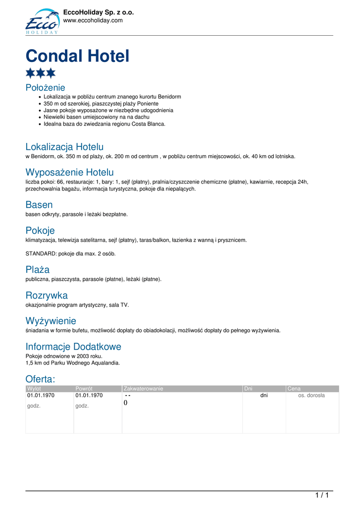 EccoHoliday Sp. z o.o. www.eccoholiday.com Condal Hotel Położenie Lokalizacja w pobliżu centrum znanego kurortu Benidorm 350 m od szerokiej, piaszczystej plaży Poniente Jasne pokoje wyposażone w niezbędne udogodnienia Niewielki basen umiejscowiony na na dachu Idealna baza do zwiedzania regionu Costa Blanca. Lokalizacja Hotelu w Benidorm, ok. 350 m od plaży, ok. 200 m od centrum , w pobliżu centrum miejscowości, ok. 40 km od lotniska. Wyposażenie Hotelu liczba pokoi: 66, restauracje: 1, bary: 1, sejf (płatny), pralnia/czyszczenie chemiczne (płatne), kawiarnie, recepcja 24h, przechowalnia bagażu, informacja turystyczna, pokoje dla niepalących. Basen basen odkryty, parasole i leżaki bezpłatne. Pokoje klimatyzacja, telewizja satelitarna, sejf (płatny), taras/balkon, łazienka z wanną i prysznicem. STANDARD: pokoje dla max. 2 osób. Plaża publiczna, piaszczysta, parasole (płatne), leżaki (płatne). Rozrywka okazjonalnie program artystyczny, sala TV. Wyżywienie śniadania w formie bufetu, możliwość dopłaty do obiadokolacji, możliwość dopłaty do pełnego wyżywienia. Informacje Dodatkowe Pokoje odnowione w 2003 roku. 1,5 km od Parku Wodnego Aqualandia. Oferta: Wylot 01.01.1970 Powrót 01.01.1970 godz. godz. Zakwaterowanie -() Dni dni Cena os. dorosła 1/1 Powered by TCPDF (www.tcpdf.org)