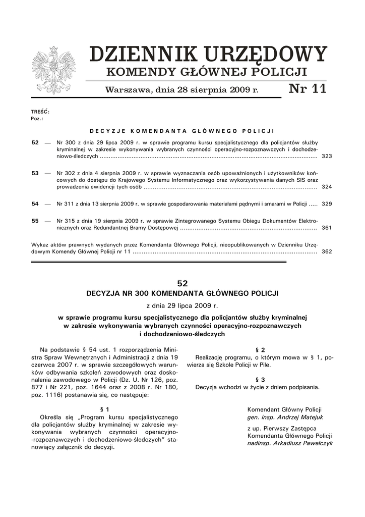 Dziennik Urzędowy Komendy Głównej Policji Nr 11 Poz. 53 ⎯ 323 ⎯ DZIENNIK URZĘDOWY KOMENDY GŁÓWNEJ POLICJI Warszawa, dnia 28 sierpnia 2009 r. Nr 11 , , TRESC: Poz.: DECYZJE KOMENDANTA GŁÓWNEGO POLICJI 52 ⎯ Nr 300 z dnia 29 lipca 2009 r. w sprawie programu kursu specjalistycznego dla policjantów służby kryminalnej w zakresie wykonywania wybranych czynności operacyjno-rozpoznawczych i dochodzeniowo-śledczych ........................................................................................................................... 323 53 ⎯ Nr 302 z dnia 4 sierpnia 2009 r. w sprawie wyznaczania osób upoważnionych i użytkowników końcowych do dostępu do Krajowego Systemu Informatycznego oraz wykorzystywania danych SIS oraz prowadzenia ewidencji tych osób ............................................................................................... 324 54 ⎯ Nr 311 z dnia 13 sierpnia 2009 r. w sprawie gospodarowania materiałami pędnymi i smarami w Policji ..... 329 55 ⎯ Nr 315 z dnia 19 sierpnia 2009 r. w sprawie Zintegrowanego Systemu Obiegu Dokumentów Elektronicznych oraz Redundantnej Bramy Dostępowej ........................................................................... 361 Wykaz aktów prawnych wydanych przez Komendanta Głównego Policji, nieopublikowanych w Dzienniku Urzędowym Komendy Głównej Policji nr 11 ..................................................................................................... 362 52 DECYZJA NR 300 KOMENDANTA GŁÓWNEGO POLICJI z dnia 29 lipca 2009 r. w sprawie programu kursu specjalistycznego dla policjantów służby kryminalnej w zakresie wykonywania wybranych czynności operacyjno-rozpoznawczych i dochodzeniowo-śledczych Na podstawie § 54 ust. 1 rozporządzenia Ministra Spraw Wewnętrznych i Administracji z dnia 19 czerwca 2007 r. w sprawie szczegółowych warunków odbywania szkoleń zawodowych oraz doskonalenia zawodowego w Policji (Dz. U. Nr 126, poz. 877 i Nr 221, poz. 1644 oraz z 2008 r. Nr 180, poz. 1116) postanawia się, co następuje: §1 Określa się „Program kursu specjalistycznego dla policjantów służby kryminalnej w zakresie wykonywania wybranych czynności operacyjno-rozpoznawczych i dochodzeniowo-śledczych” stanowiący załącznik do decyzji. §2 Realizację programu, o którym mowa w § 1, powierza się Szkole Policji w Pile. §3 Decyzja wchodzi w życie z dniem podpisania. Komendant Główny Policji gen. insp. Andrzej Matejuk z up. Pierwszy Zastępca Komendanta Głównego Policji nadinsp. Arkadiusz Pawełczyk Dziennik Urzędowy Komendy Głównej Policji Nr 11 Poz. 53 ⎯ 324 ⎯ 53 DECYZJA NR 302 KOMENDANTA GŁÓWNEGO POLICJI z dnia 4 sierpnia 2009 r. w sprawie wyznaczania osób upoważnionych i użytkowników końcowych do dostępu do Krajowego Systemu Informatycznego oraz wykorzystywania danych SIS oraz prowadzenia ewidencji tych osób Na podstawie § 6 zarządzenia nr 1144 Komendanta Głównego Policji z dnia 2 listopada 2004 r. w sprawie metod i form wykonywania w Policji zadań w zakresie legislacji, pomocy prawnej i informacji prawnej (Dz. Urz. KGP Nr 21, poz. 131, z 2006 r. Nr 4, poz. 10 oraz z 2007 r. Nr 13, poz. 101) w związku z § 5 rozporządzenia Ministra Spraw Wewnętrznych i Administracji z dnia 7 grudnia 2007 r. w sprawie trybu dostępu do Krajowego Systemu Informatycznego (Dz. U. Nr 235, poz. 1730) postanawia się, co następuje: §1 Decyzja określa: 1) sposób wyznaczania osób upoważnionych oraz użytkowników końcowych w jednostkach i komórkach organizacyjnych Policji; 2) sposób i tryb wystawiania oraz wzory: a) upoważnienia do dostępu do Krajowego Systemu Informatycznego oraz wykorzystywania danych SIS, b) odwołania nadanego upoważnienia do dostępu do Krajowego Systemu Informatycznego oraz wykorzystywania danych SIS; 3) przypadki wygaśnięcia oraz odwołania upoważnienia do dostępu do Krajowego Systemu Informatycznego oraz wykorzystywania danych SIS; 4) sposób prowadzenia ewidencji osób upoważnionych lub użytkowników końcowych. §2 Użyte w decyzji określenia oznaczają: 1) upoważnienie – wydane policjantowi lub pracownikowi Policji upoważnienie do dostępu do Krajowego Systemu Informatycznego oraz wykorzystywania danych SIS, za pośrednictwem Krajowego Systemu Informacyjnego Policji, określające zakres uprawnień do dokonywania wpisów i wglądu w te dane; 2) osoba upoważniona – policjant lub pracownik Policji, któremu zostało wydane upoważnienie do wykorzystywania danych SIS, zgodnie z rodzajem realizowanych obowiązków służbowych; 3) użytkownik końcowy – policjant lub pracownik Policji, któremu zostało wydane upoważnienie do dostępu do Krajowego Systemu Informatycznego oraz wykorzystywania danych SIS, za pośrednictwem Krajowego Sys- temu Informacyjnego Policji, zgodnie z zakresem realizowanych zadań służbowych; 4) wykorzystywanie danych SIS – wykorzystywanie danych, o którym mowa w art. 2 pkt 18 ustawy z dnia 24 sierpnia 2007 r. o udziale Rzeczypospolitej Polskiej w Systemie Informacyjnym Schengen oraz Systemie Informacji Wizowej (Dz. U. Nr 165, poz. 1170 oraz z 2008 r. Nr 195, poz. 1198 i Nr 216, poz. 1367). §3 1. Komendant Główny Policji wystawia upoważnienia dla: 1) komendantów wojewódzkich (Stołecznego) Policji; 2) Komendanta-rektora Wyższej Szkoły Policji w Szczytnie; 3) dyrektorów komórek organizacyjnych Komendy Głównej Policji; 4) komendantów szkół policyjnych; 2. Do wystawiania upoważnień, w imieniu Komendanta Głównego Policji, wyznacza się: 1) komendantów wojewódzkich (Stołecznego) Policji – w odniesieniu do komendantów powiatowych, miejskich (rejonowych) Policji oraz do policjantów i pracowników komend wojewódzkich (Stołecznej) Policji; 2) Komendanta-rektora Wyższej Szkoły Policji w Szczytnie – w odniesieniu do policjantów i pracowników Wyższej Szkoły Policji w Szczytnie; 3) dyrektorów komórek organizacyjnych Komendy Głównej Policji – w odniesieniu do podległ