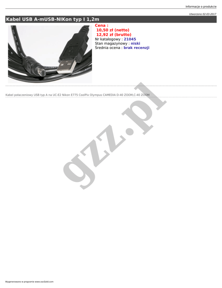 Informacje o produkcie Utworzono 02-03-2017 Kabel USB A-mUSB-NIKon typ I 1,2m Cena : 10,50 zł (netto) 12,92 zł (brutto) Nr katalogowy : 21045 Stan magazynowy : niski Średnia ocena : brak recenzji gz z .p l Kabel połaczeniowy USB typ A na UC-E2 Nikon E775 CoolPix Olympus CAMEDIA D-40 ZOOM,C-40 ZOOM Wygenerowano w programie www.oscGold.com