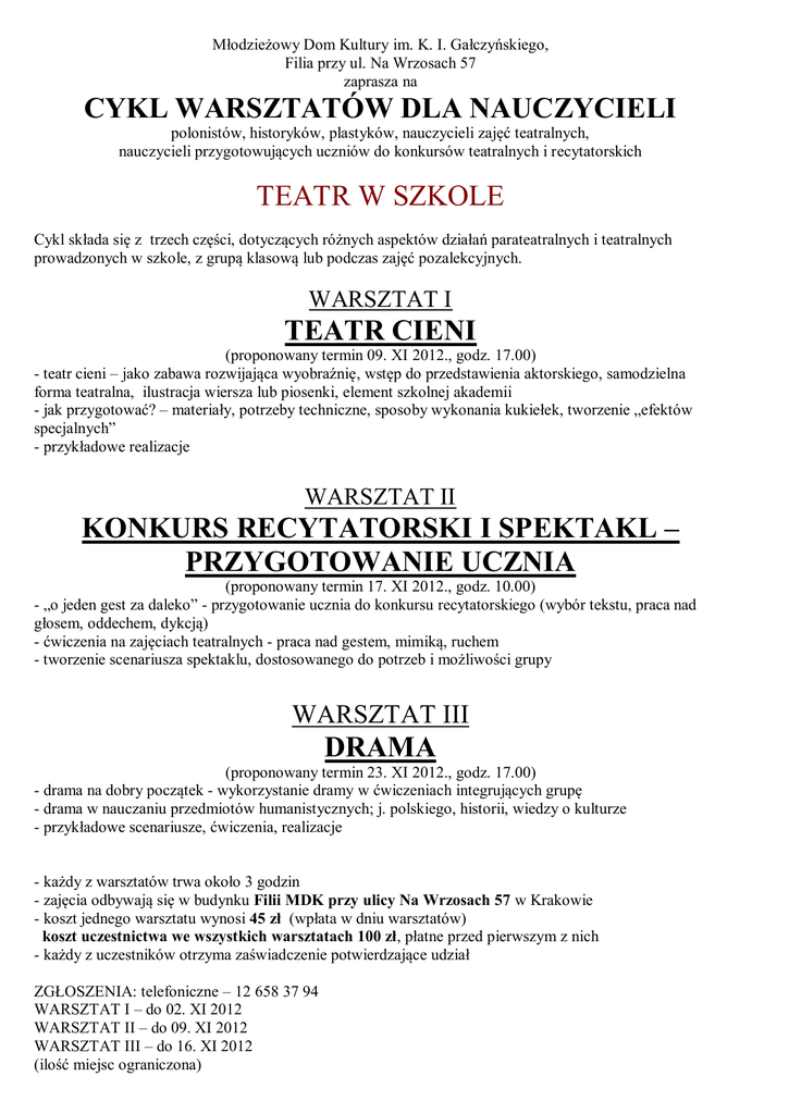 Młodzieżowy Dom Kultury im. K. I. Gałczyńskiego, Filia przy ul. Na Wrzosach 57 zaprasza na CYKL WARSZTATÓW DLA NAUCZYCIELI polonistów, historyków, plastyków, nauczycieli zajęć teatralnych, nauczycieli przygotowujących uczniów do konkursów teatralnych i recytatorskich TEATR W SZKOLE Cykl składa się z trzech części, dotyczących różnych aspektów działań parateatralnych i teatralnych prowadzonych w szkole, z grupą klasową lub podczas zajęć pozalekcyjnych. WARSZTAT I TEATR CIENI (proponowany termin 09. XI 2012., godz. 17.00) - teatr cieni – jako zabawa rozwijająca wyobraźnię, wstęp do przedstawienia aktorskiego, samodzielna forma teatralna, ilustracja wiersza lub piosenki, element szkolnej akademii - jak przygotować? – materiały, potrzeby techniczne, sposoby wykonania kukiełek, tworzenie „efektów specjalnych” - przykładowe realizacje WARSZTAT II KONKURS RECYTATORSKI I SPEKTAKL – PRZYGOTOWANIE UCZNIA (proponowany termin 17. XI 2012., godz. 10.00) - „o jeden gest za daleko” - przygotowanie ucznia do konkursu recytatorskiego (wybór tekstu, praca nad głosem, oddechem, dykcją) - ćwiczenia na zajęciach teatralnych - praca nad gestem, mimiką, ruchem - tworzenie scenariusza spektaklu, dostosowanego do potrzeb i możliwości grupy WARSZTAT III DRAMA (proponowany termin 23. XI 2012., godz. 17.00) - drama na dobry początek - wykorzystanie dramy w ćwiczeniach integrujących grupę - drama w nauczaniu przedmiotów humanistycznych; j. polskiego, historii, wiedzy o kulturze - przykładowe scenariusze, ćwiczenia, realizacje - każdy z warsztatów trwa około 3 godzin - zajęcia odbywają się w budynku Filii MDK przy ulicy Na Wrzosach 57 w Krakowie - koszt jednego warsztatu wynosi 45 zł (wpłata w dniu warsztatów) koszt uczestnictwa we wszystkich warsztatach 100 zł, płatne przed pierwszym z nich - każdy z uczestników otrzyma zaświadczenie potwierdzające udział ZGŁOSZENIA: telefoniczne – 12 658 37 94 WARSZTAT I – do 02. XI 2012 WARSZTAT II – do 09. XI 2012 WARSZTAT III – do 16. XI 2012 (ilość miejsc ograniczona) CYKL WARSZTATÓW DLA NAUCZYCIELI polonistów, historyków, plastyków, nauczycieli zajęć teatralnych, nauczycieli przygotowujących uczniów do konkursów teatralnych i recytatorskich WARSZTAT I TEATR CIENI WARSZTAT II KONKURS RECYTATORSKI I SPEKTAKL – PRZYGOTOWANIE UCZNIA WARSZTAT III DRAMA