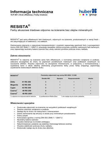 Informacja techniczna 10.P.001 | Druk offsetowy | Farby triadowe RESISTA® Farby akuszowe triadowe odporne na ścieranie bez olejów mineralnych ® RESISTA jest serią offsetowych farb triadowych, odpornych na ścieranie, produkowanych w wersji fresh nie zasychających w kałamarzu i na wałkach. Zastosowane pigmenty o najwyższej transparentności i czystości zapewniają zgodność farb z wymaganiami normy DIN ISO 2846-1 i 12647-2, powodują niewielkie różnice przyrostu punktów rastrowych farb barwnych, oraz zapewniają neutralny balans szarości bez utraty ostrości punktów podczas druku nakładu. Zakres stosowania ® RESISTA to odporna na ścieranie seria farb offsetowych, o normalnej zdolności wsiąkania w podłoże, zalecana szczególnie do druku na papierach powlekanych matowych oraz podłożach wrażliwych na wyrywanie włókien. Wysoka odporność na obciążenia mechaniczne, w połączeniu z kontrastowością i czystością barw a także idealną zdolnością przyjmowania farby przez farbę (trapping) zapewniają uzyskiwanie doskonałych efektów druku. ® Parametry odporności wg normy ISO 2836 / 12 040 RESISTA Światło WS Spirytus Rozpuszczalniki Alkalia Żółta 41 RS 250 5 + + + Magenta 42 RS 250 5 + + -* Cyjan 43 RS 250 8 + + + 1 49 RS 250 8 + + + 2 49 RS 2501 8 - - + Czarna Czarna 1) odporna na rozpuszczalniki lakierów 2) podbarwiona Reflex Blue *) nie nadaje się do druku plakatów Właściwości specjalne • • • • • • • • • • • Doskonała odporność na ścieranie na wszystkich podłożach wsiąkliwych Średnia zdolność wsiąkania w podłoże Nadają się do druku na maszynach z odwracaniem Dobre zachowanie się arkuszy w stosie przy minimalnym proszkowaniu Dobry połysk Kolorystyka zgodna z normą DIN ISO 2846-1 / 12647-2 Neutralny balans szarości Wysoka tolerancja na środek zwilżający Natychmiastowe ustalanie się stabilnej równowagi farbowo-wodnej Wysoka stabilność podczas druku nakładu Doskonale nadaje się do druku bez alkoholu Profil właściwości Połysk niski Odporność na ścieranie średnia wysoki bardzo dobra Ostrość punktu niska wysoka Wsiąkanie w podłoże wolne bardzo szybkie Dalsza obróbka wolna bardzo szybka Druk z odwracaniem ograniczony zalecany Środki pomocnicze ® Farby triadowe serii RESISTA są gotowe do druku. Środki pomocnicze należy stosować tylko w wyjątkowych sytuacjach, aby dostosować farby do specyficznych warunków technologicznych. Powinny być to środki, których receptura dostosowana jest do wysoko jakościowego spoiwa, a mianowicie: - w wypadku podłoży wrażliwych na zrywanie powierzchni należy dodać do farby olej drukowy Druckoel 10 T 1405 w celu obniżenia ciągliwości - dla przyspieszenia schnięcia oksydacyjnego należy dodać do farby suszki MONSUN 10 S 7265. Obowiązkowe oznaczenia ostrzegawcze Zgodnie z przepisami o substancjach niebezpiecznych - nie są wymagane Zgodnie z przepisami p-poż. - nie są wymagane Pozostałe informacje zawiera karta charakterystyki preparatu Opakowania Puszka o poj. 2,5 kg pakowana próżniowo Duże opakowania Tuby o poj. 2,0 kg Dalsze informacje i porady można uzyskać pod internetowym adresem: ww.mhp.com.pl Niniejsza informacja techniczna odpowiada aktualnemu stanowi naszej wiedzy w tym temacie i spełnia tylko funkcję informacyjną i doradczą. Z tego względu nie może być podstawą do roszczeń prawnych. Zastrzeżone są zmiany wynikające z postępu technicznego.